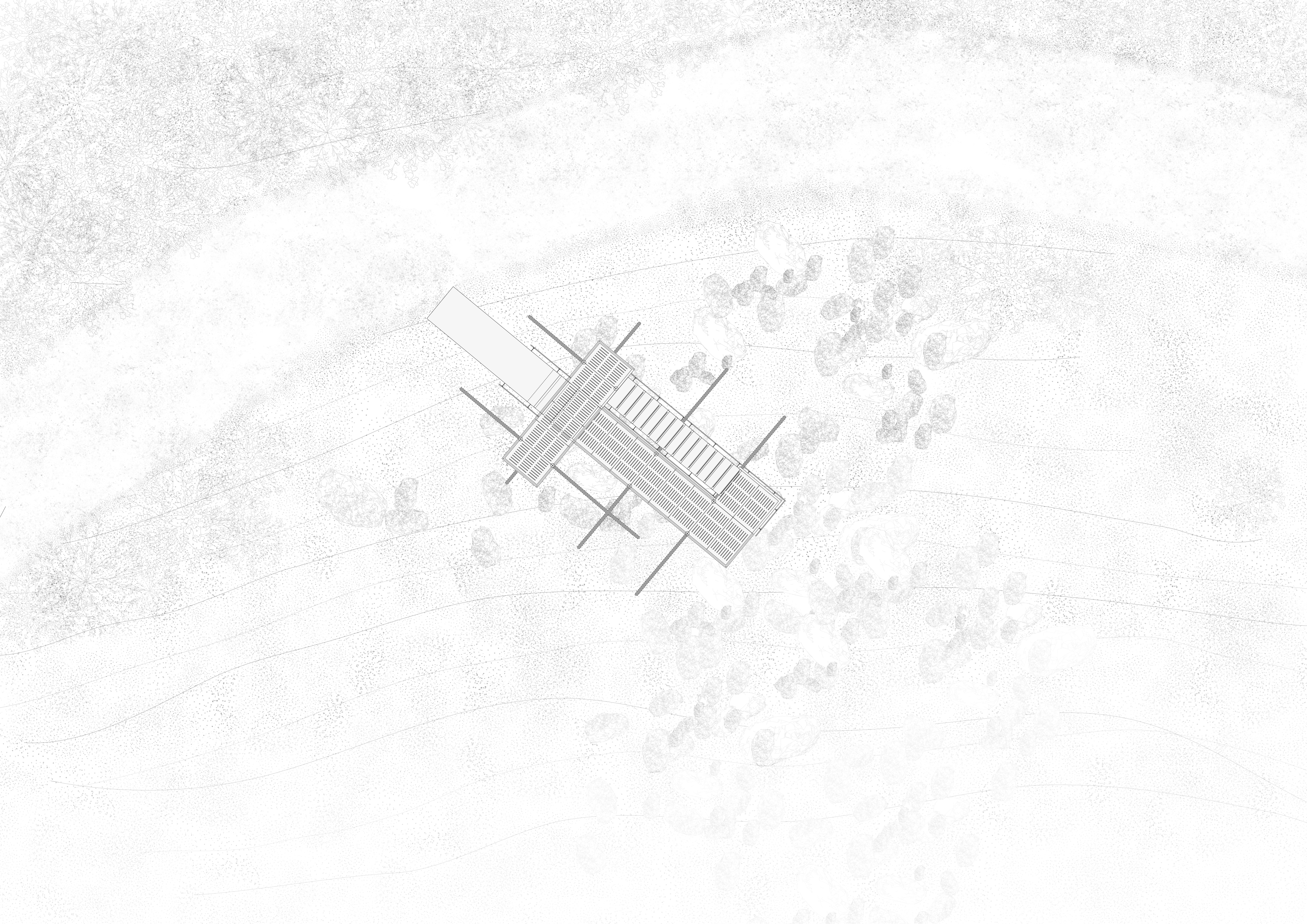 지형을 따라 올라가면 Shelter 01에 도착한다. 현지 석공의 손길로 산에서 채석한 돌을 활용해 바람과 햇볕을 막는 벽을 세웠고, 가볍게 교체 가능한 직물 지붕을 설치했다. 슬링 소재의 파라솔은 바람에 흔들리며 차양 역할을 하고, 돌벽은 경관과 어우러지면서도 산지의 강풍을 완화한다. 쉼터 뒤편에는 숙박객과 방문객을 위한 식당과 화장실이 마련되어 있다.