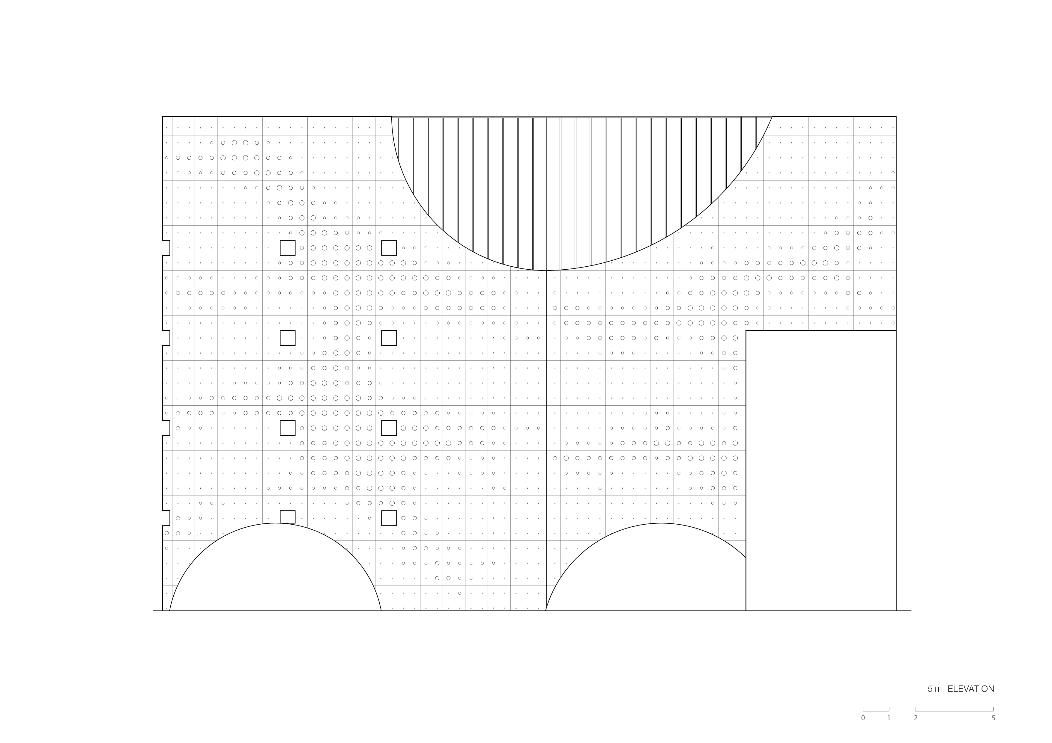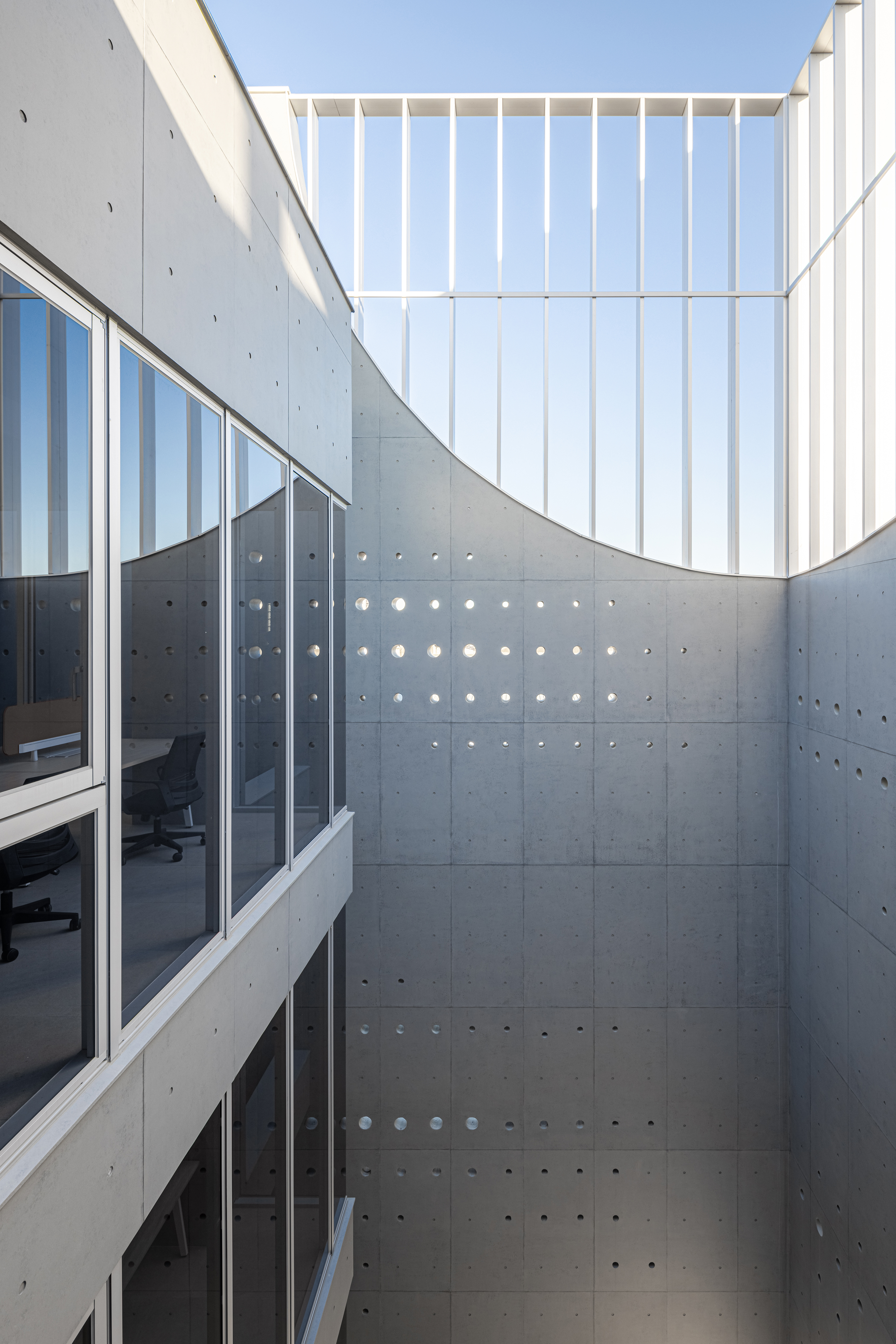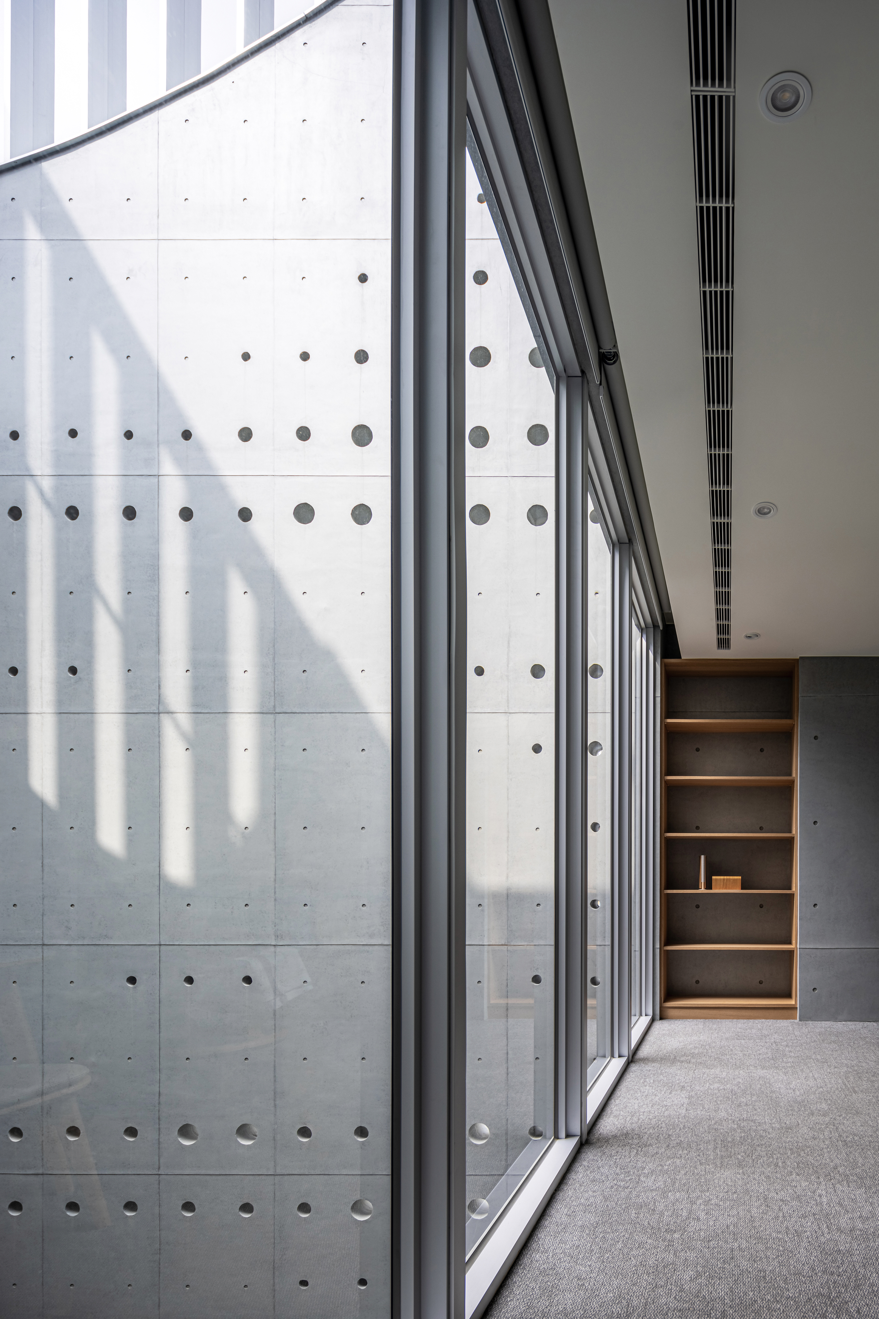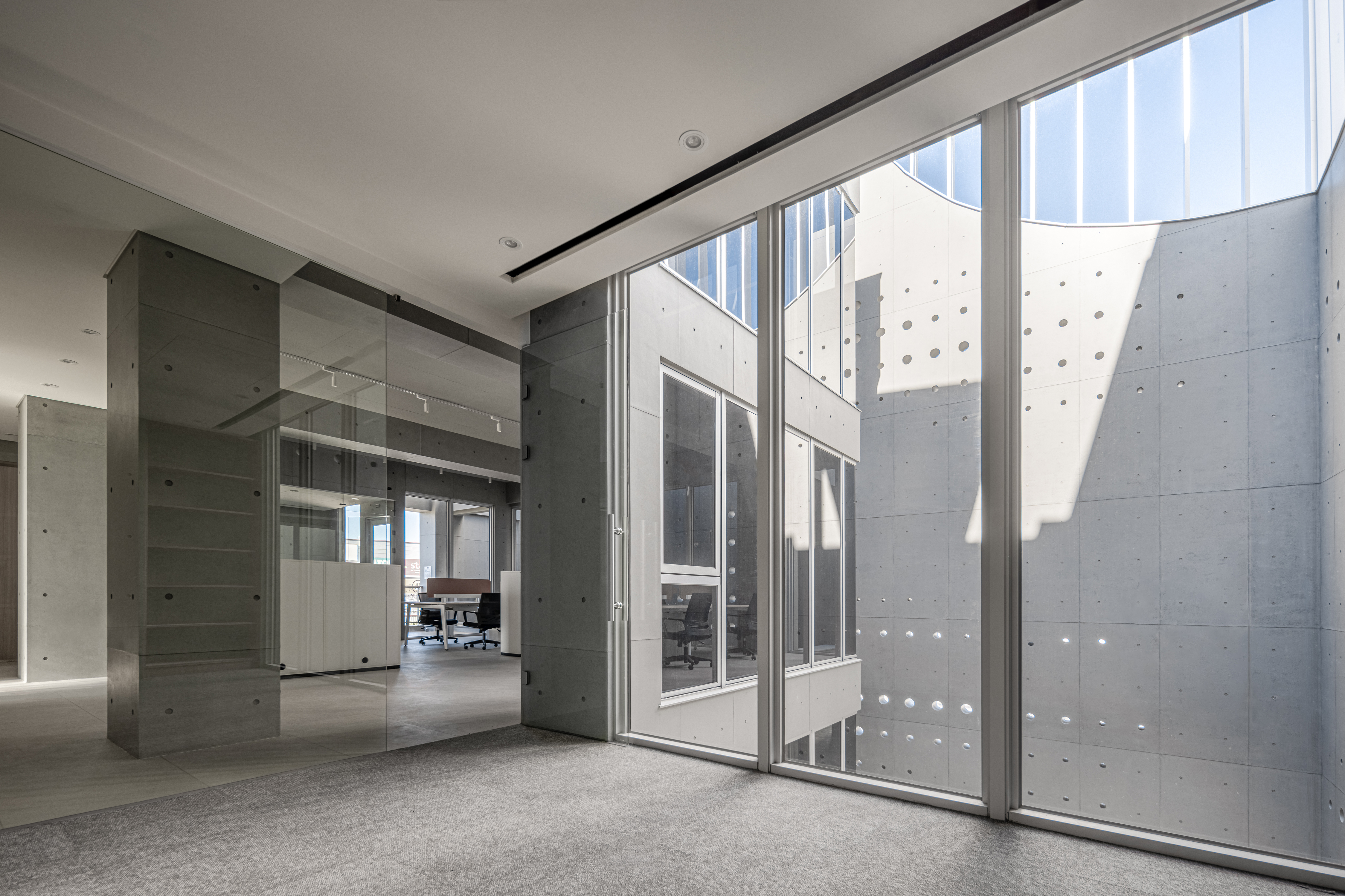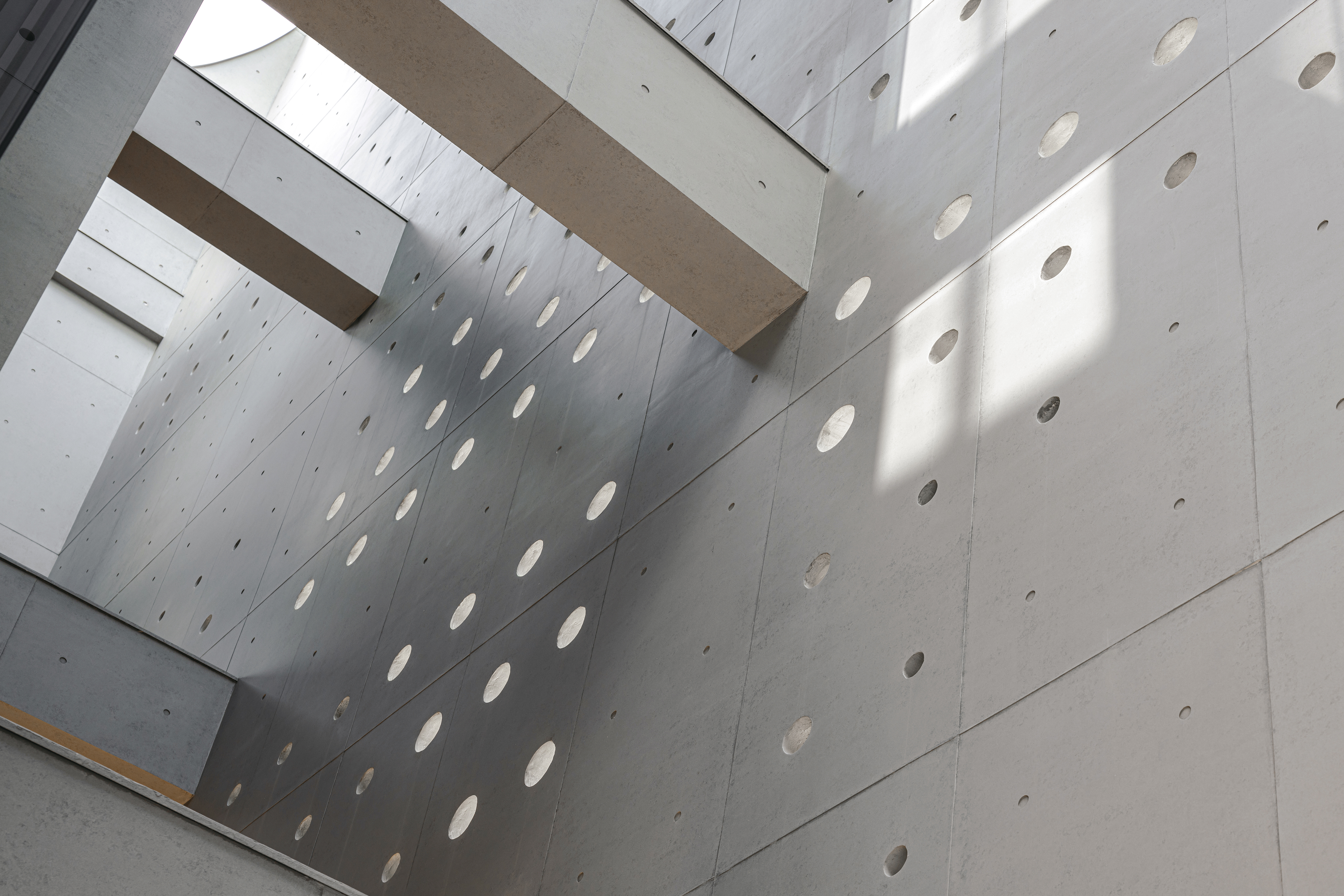 외피 콘크리트와 내부 유리 매스 사이에는 공기와 빛이 자유롭게 흐르는 투과적 중간 공간이 형성된다. 이 수직 아트리움은 시선을 위로 끌어올려 하늘을 프레임 속에 담아내며, 자연과의 감각적 연결을 강화한다. 노출콘크리트의 구조적 볼트 격자에 대응해 배치된 다양한 크기의 원형 타공은 단일한 매스에 인간적 스케일을 부여한다. 햇빛은 이 작은 구멍들을 통해 실내로 들어와 산란하며 파편화된 빛줄기를 만든다.