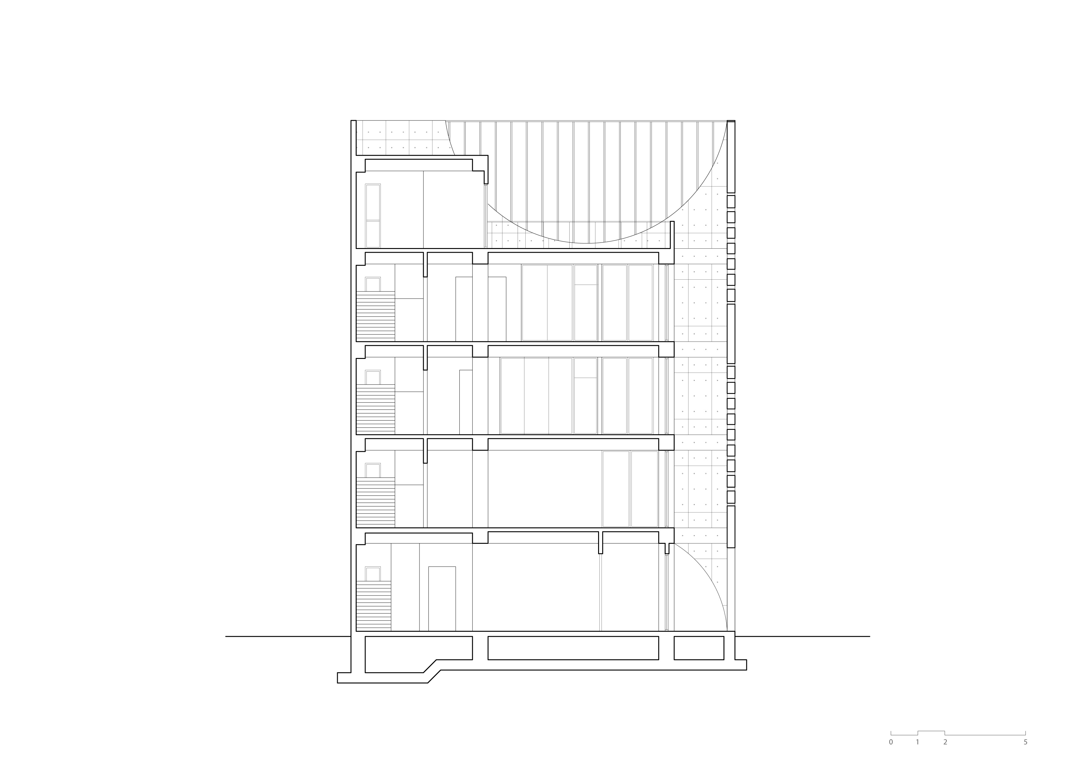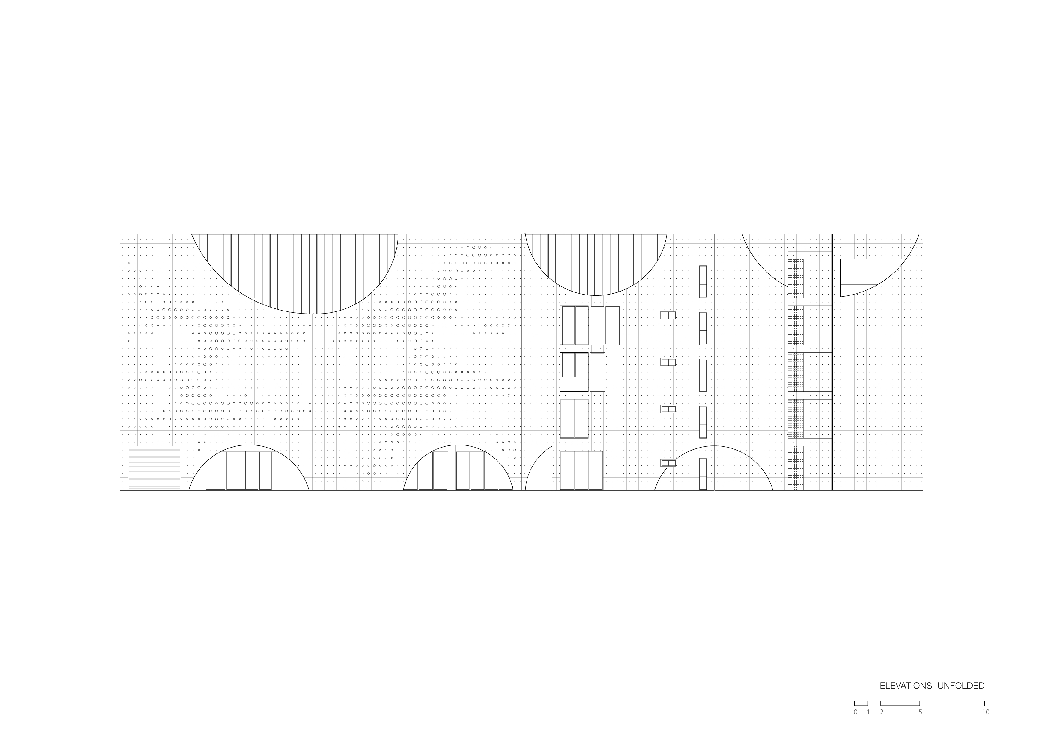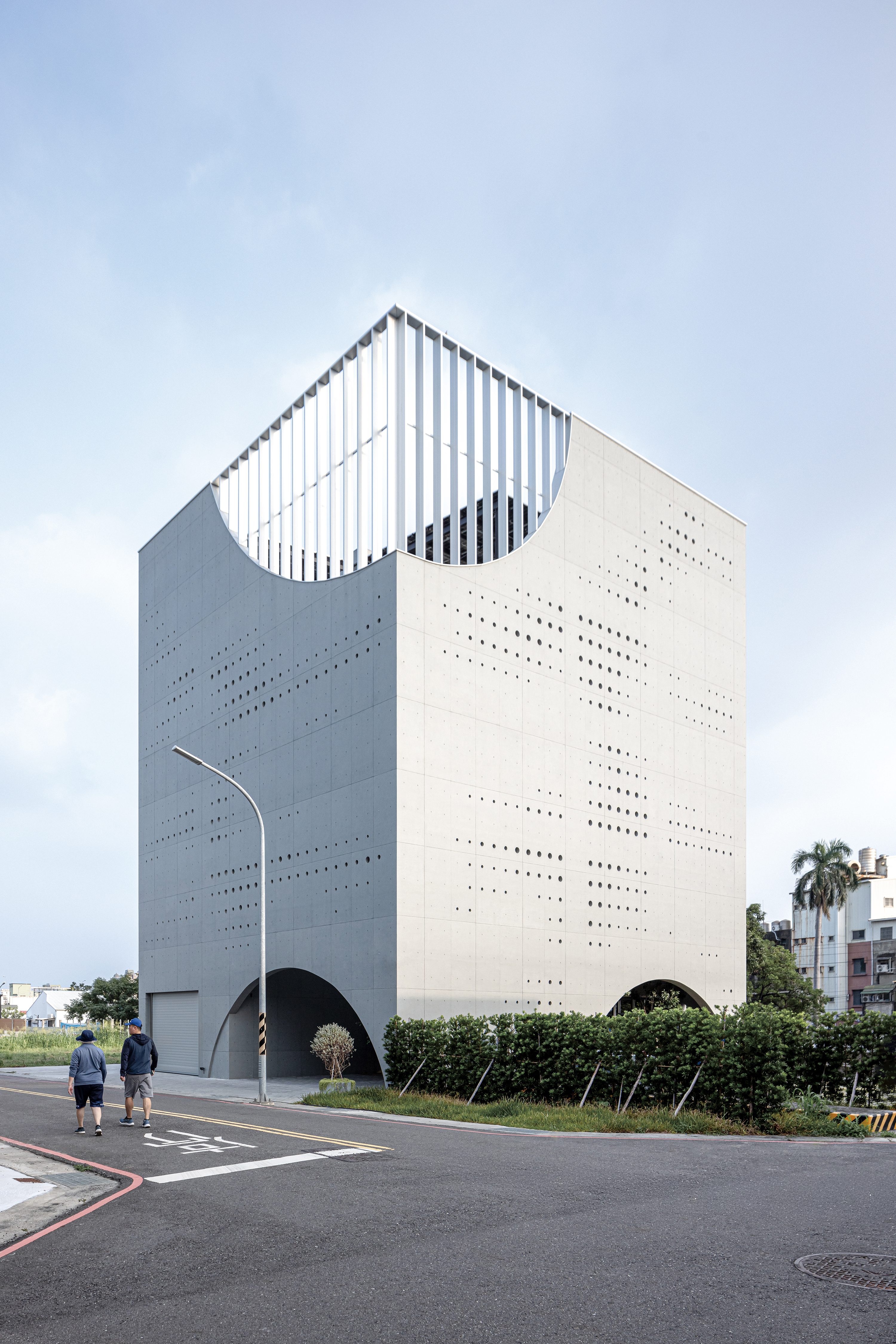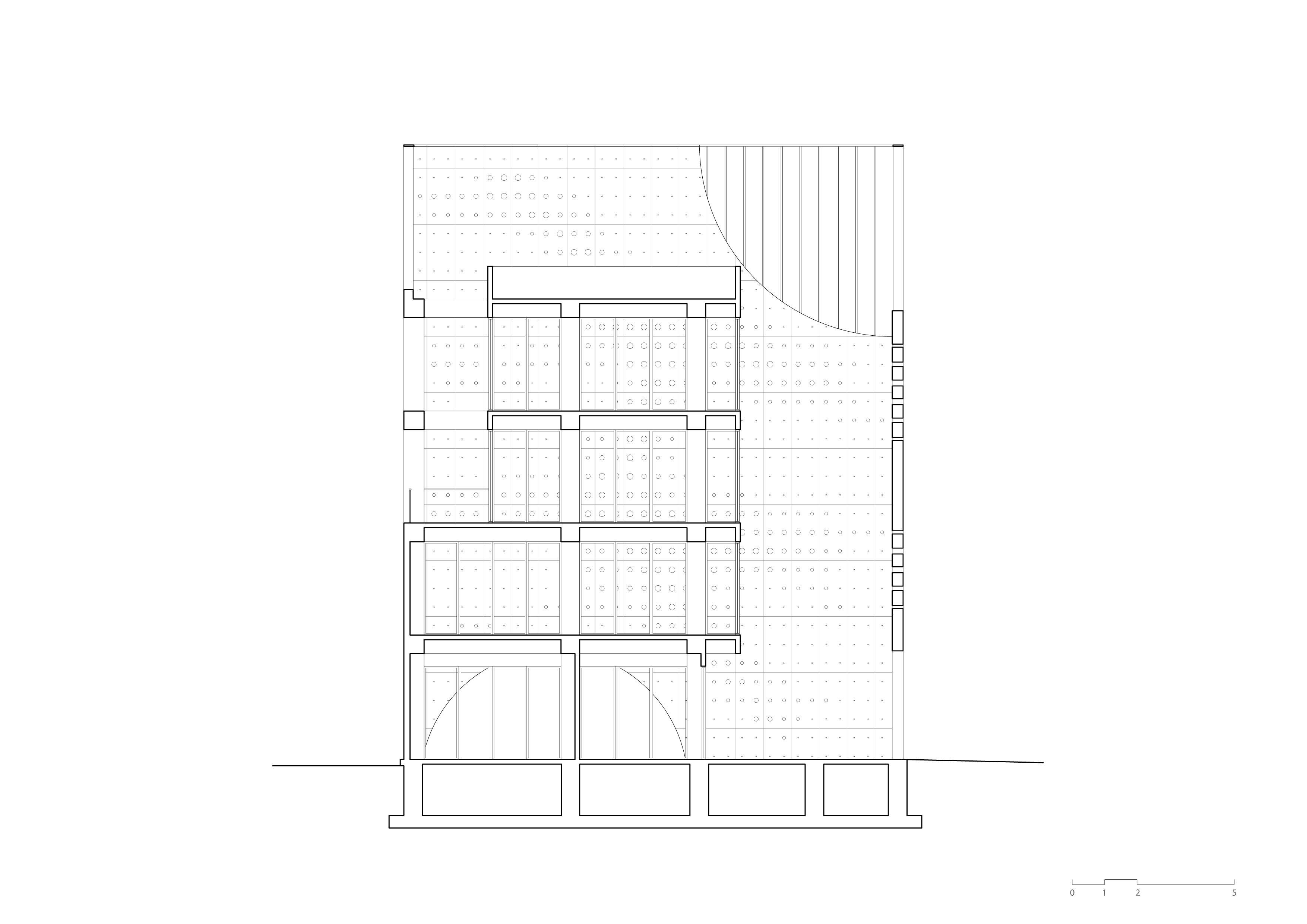 건물은 다섯 층 규모의 기념비적 큐브 형태로, 역동적인 도시 맥락 속에 조용히 뿌리내리고 있다. 외부는 콘크리트로 이루어져 폐쇄적이고 견고해 보이지만, 벽 너머로는 섬세한 유리 매스가 드러나면서 무게감과 가벼움의 대비를 형성한다. 파사드의 곡선은 태양의 궤적—일출과 일몰—을 연상시키며, 1층 아치 개구부는 전면 광장과 측면 정원으로 이어져 사회적 교류의 장을 제공한다. 상부의 곡선형 개구부는 도시를 향해 열려 있어 옥상 정원과 도시 경관 사이의 대화를 이끈다.