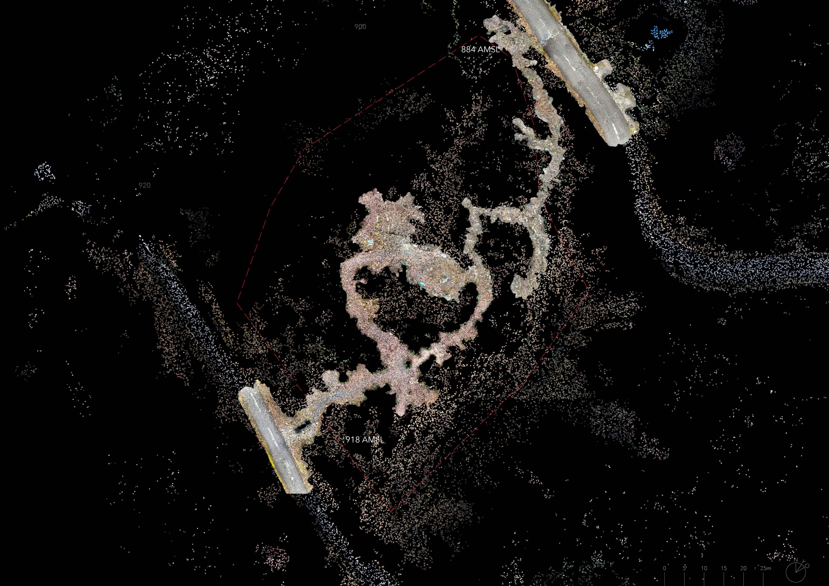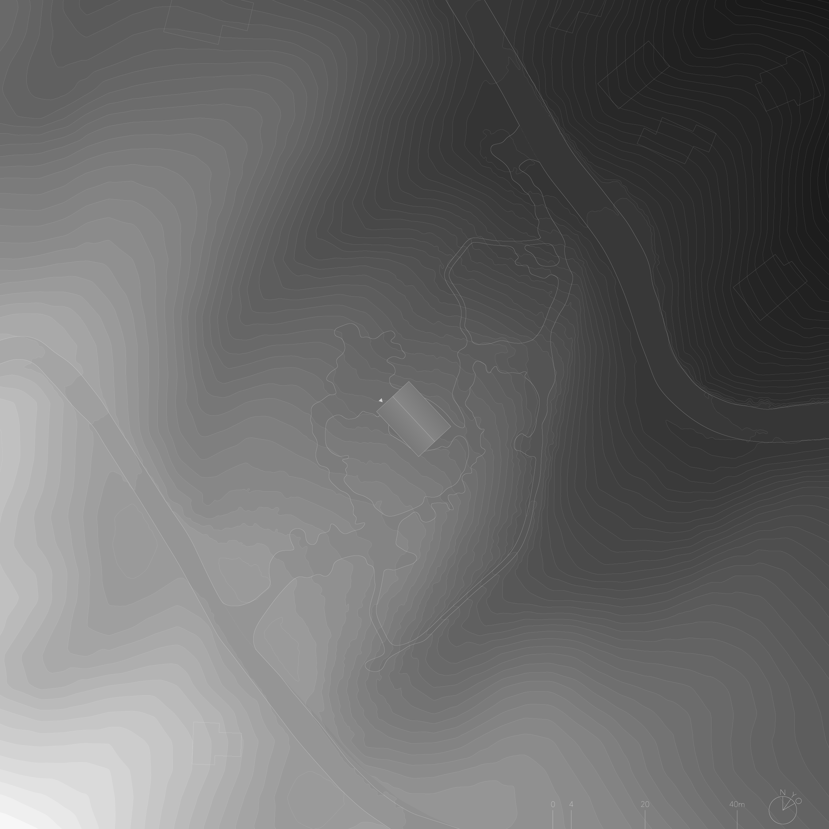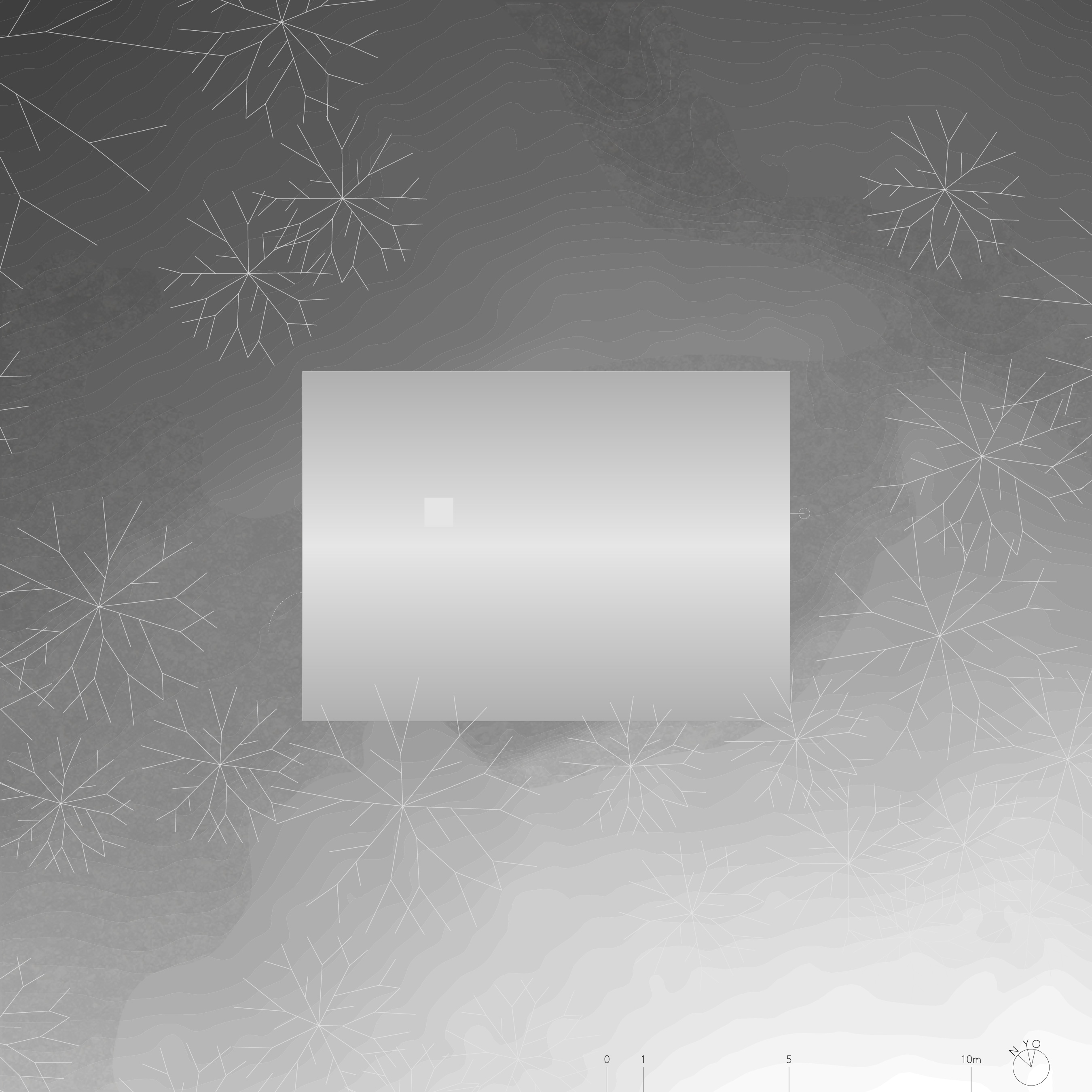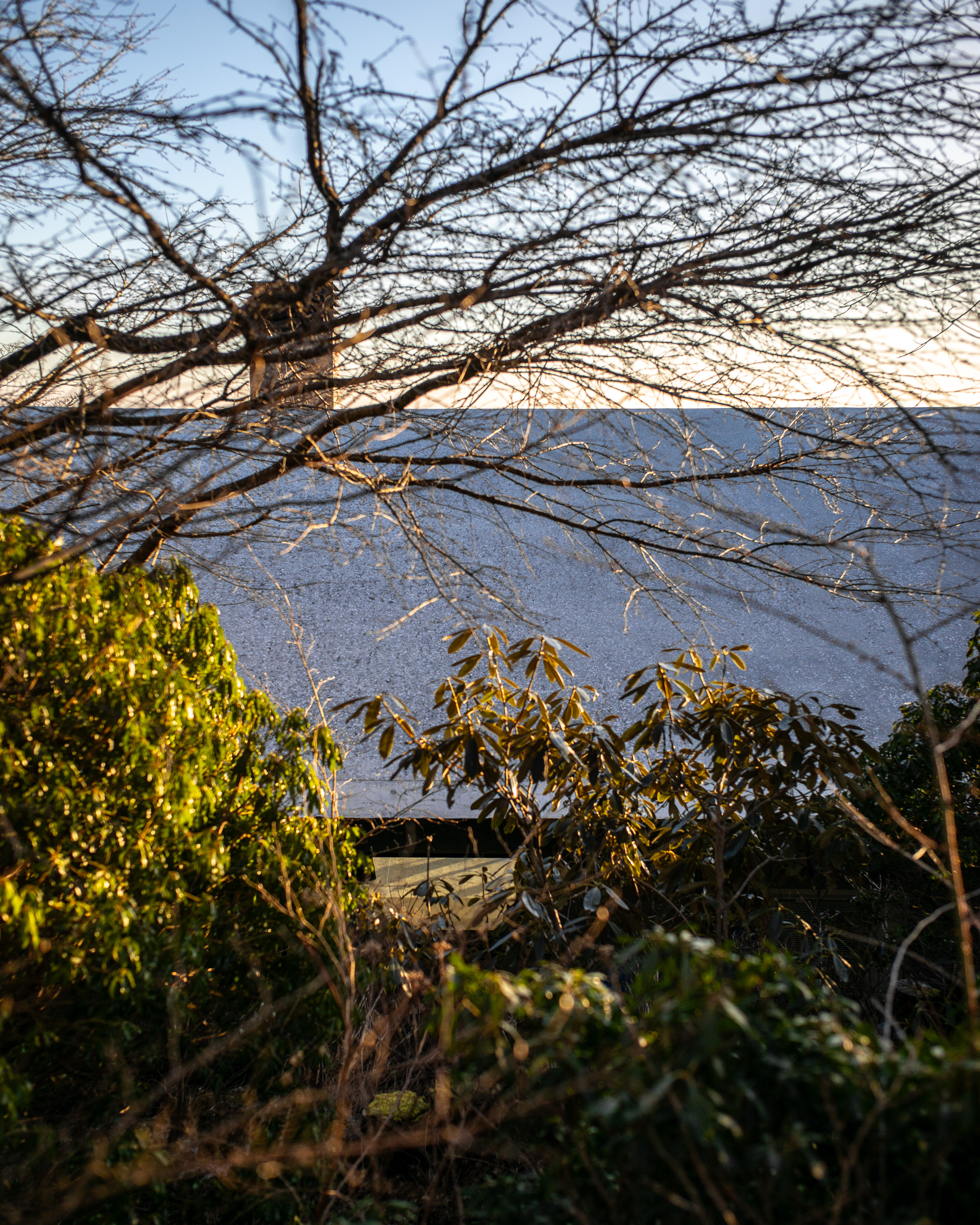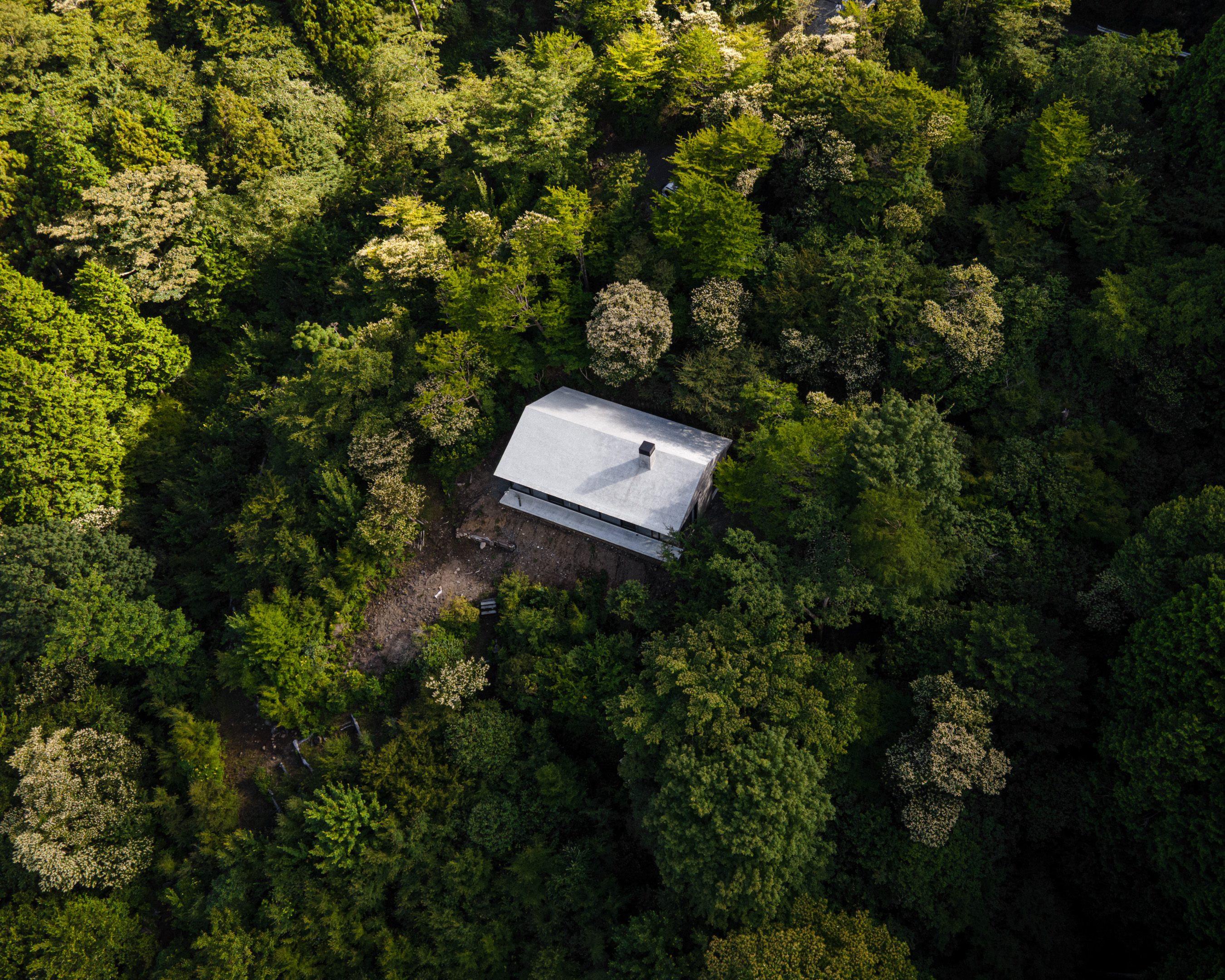 건물은 두 개의 도로 어디에서도 보이지 않는다. 남쪽 고점의 진입로에서 좁은 오솔길을 따라 내려가면, 숲 사이로 지붕이 서서히 드러난다. 거대한 바위 같던 형상은 사실 속이 완전히 비어 있으며, 내부는 하나의 연속적인 흰색 공간이다. 천장에 닿지 않는 얇은 벽들이 숲의 전후 관계를 이어받아 부드럽게 공간을 나눈다. 바위 속에 서 있으면 끝없는 외부의 가벼움이 더욱 강하게 느껴지고, 안개가 드리운 순간에는 신비로움이 배가된다.