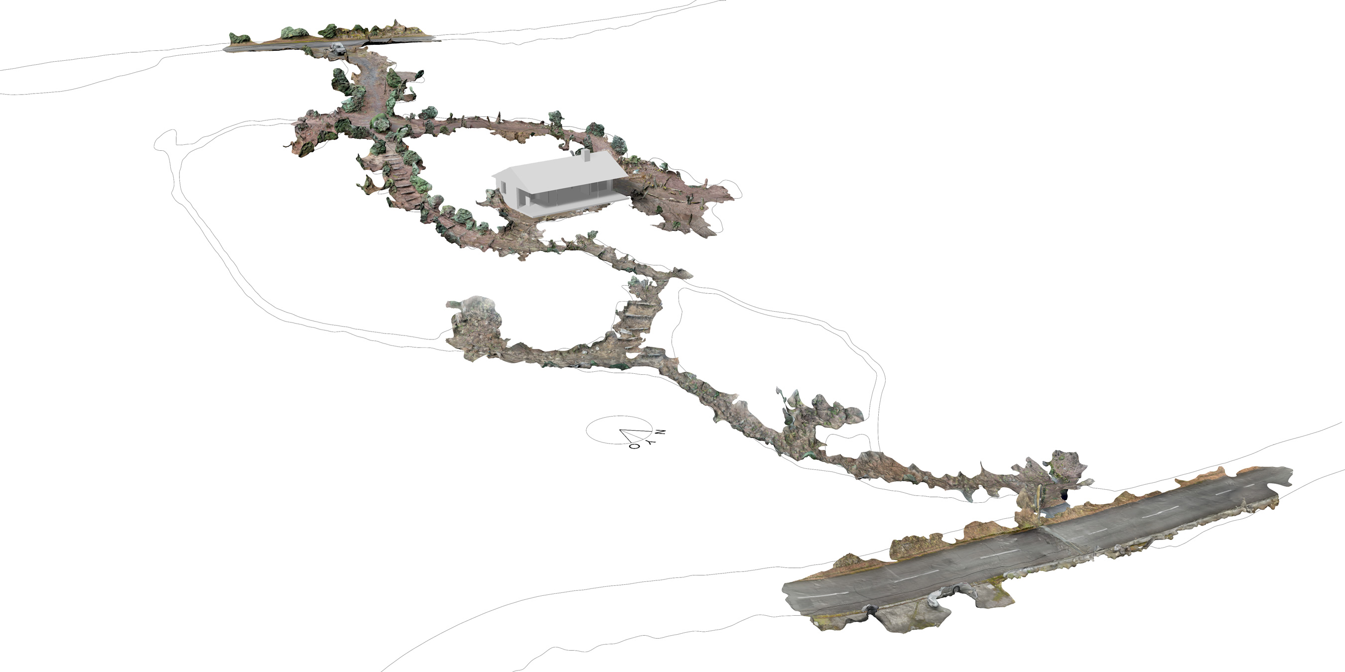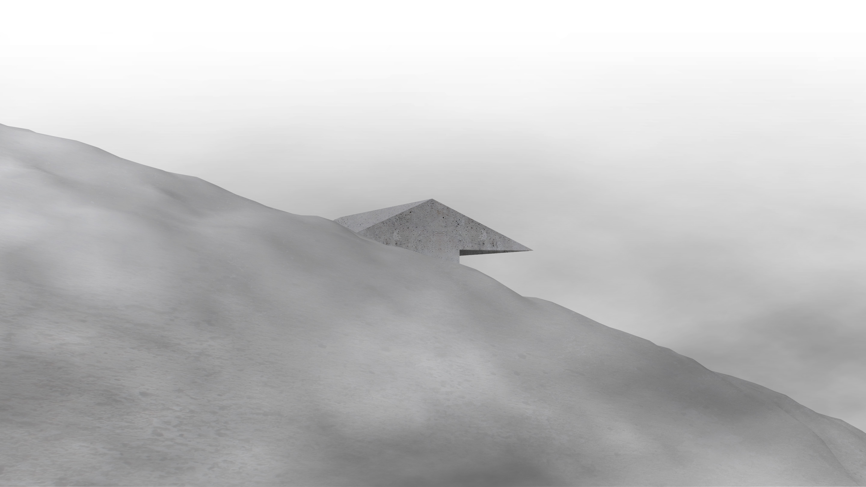 제안된 해법은 ‘바위-지붕 하이브리드’이다. 거대한 바위를 파내고 그 위를 정교하게 지붕 형태로 다듬은 듯한 건축은 동시에 개방적이면서도 견고하다. 지붕의 형태는 법규가 규정한 박공지붕 조건과 대지의 경사를 따르며, 건축을 산의 일부처럼 보이게 하면서도 또렷이 드러나게 한다.