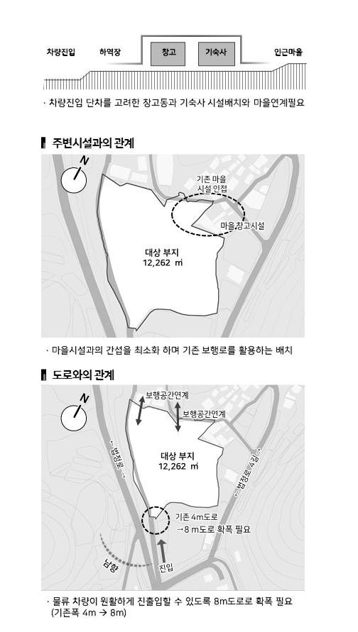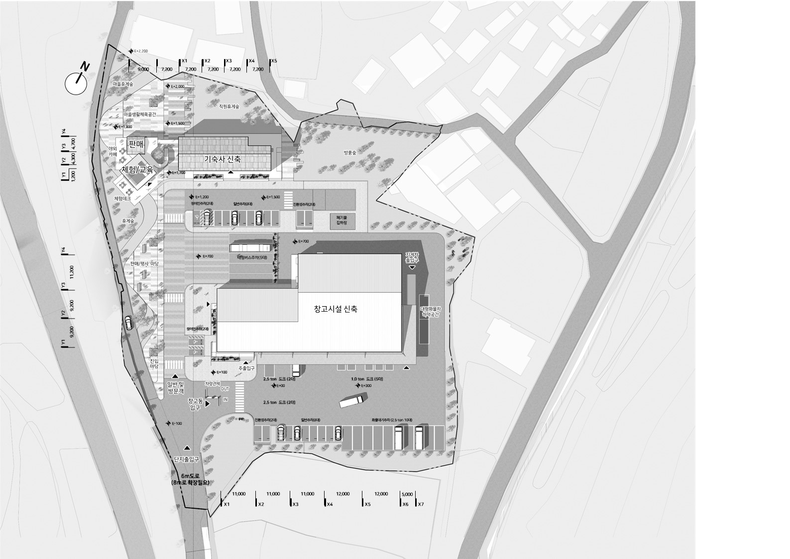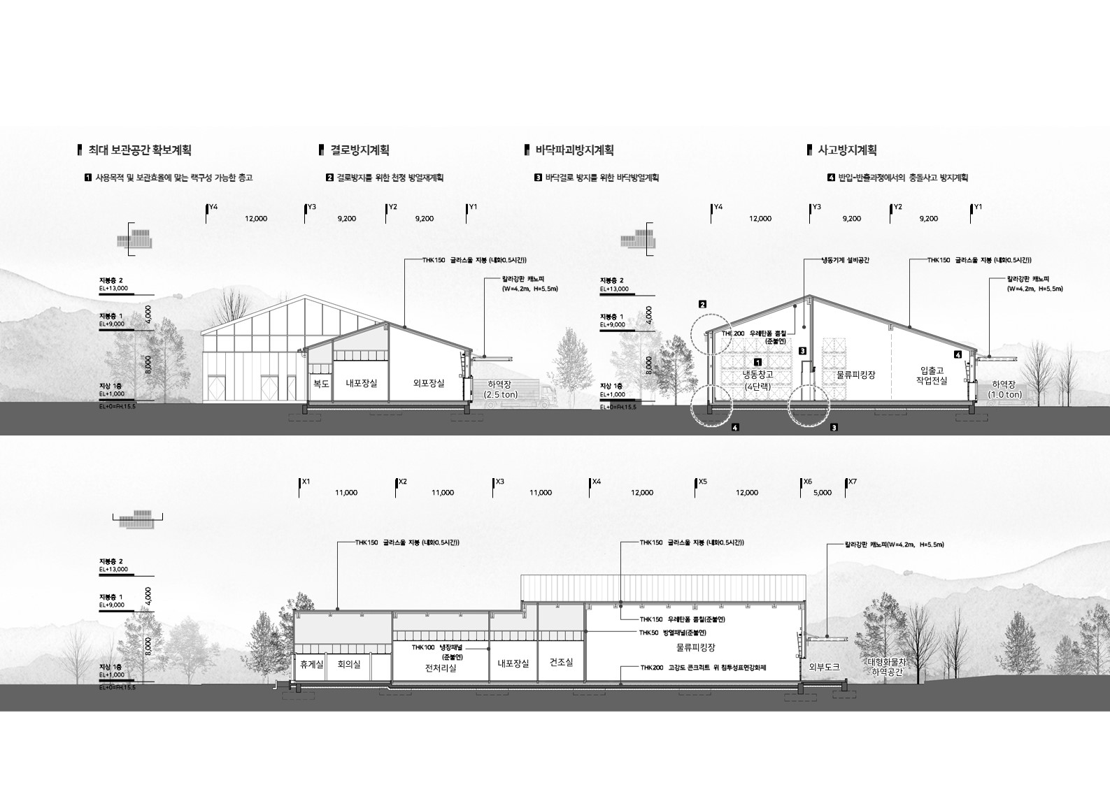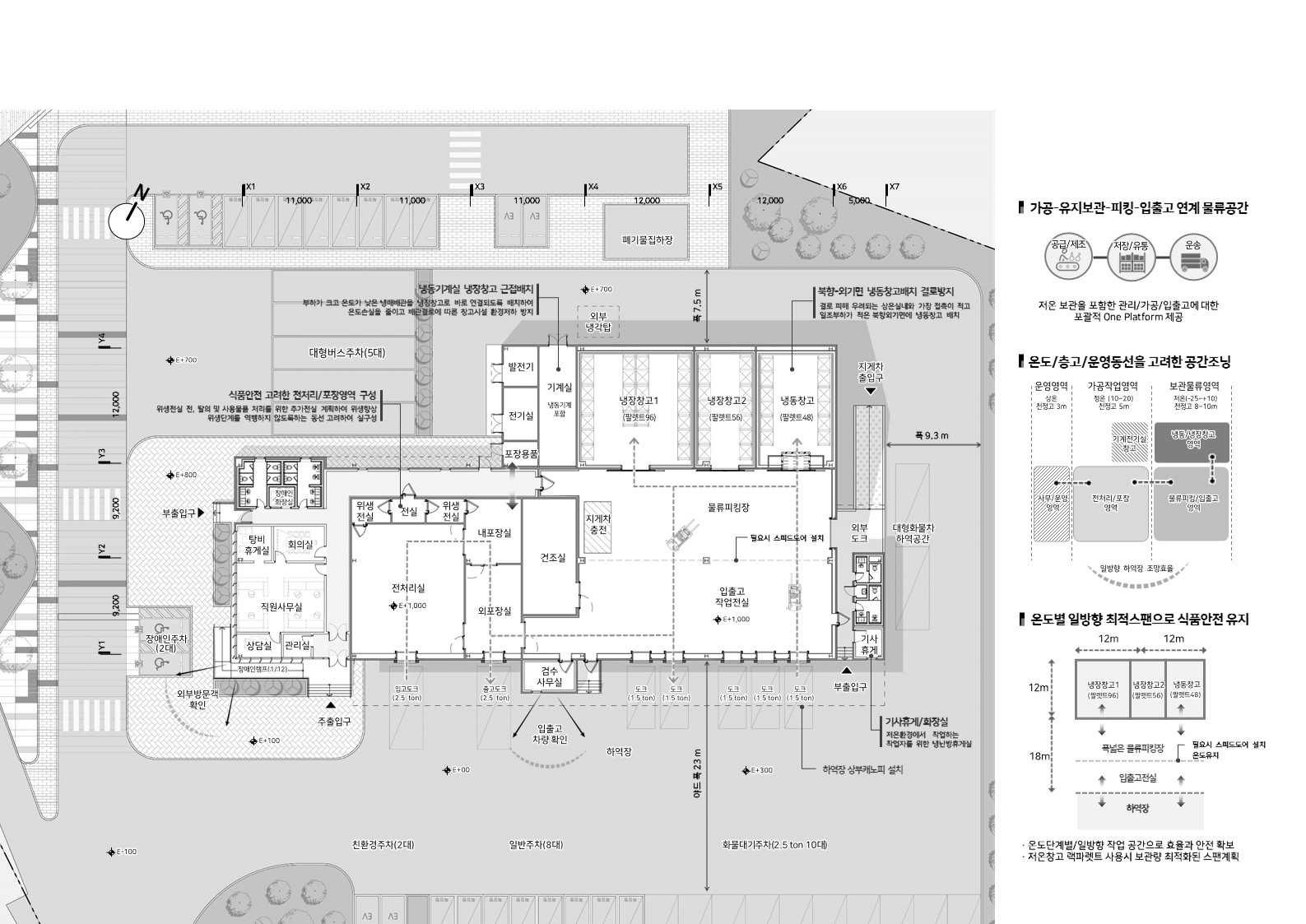 작업자, 운영자, 방문자로 동선을 명확히 구분하고, 보행과 차량의 흐름을 분리하여 안전성과 효율성을 확보하였다. 창고동은 식품 안전과 물류 흐름을 최적화하는 계획을 바탕으로, 합리적인 운영과 고효율의 관리가 가능하도록 구성되었다.