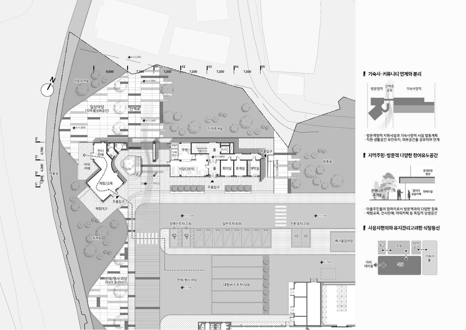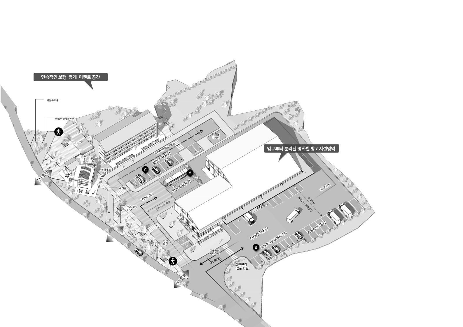 대상지가 지닌 과거 학교 부지의 기억을 이어받아 주민들이 모이고 교류할 수 있는 열린 공유공간을 마련하였다. 차량과 분리된 보행동선을 따라 체육시설, 행사 및 판매마당, 쉼터, 산책로를 두어 단절된 마을의 관계를 회복하고 일상 속 활기를 불어넣는 중심 커뮤니티 공간으로 계획하였다.