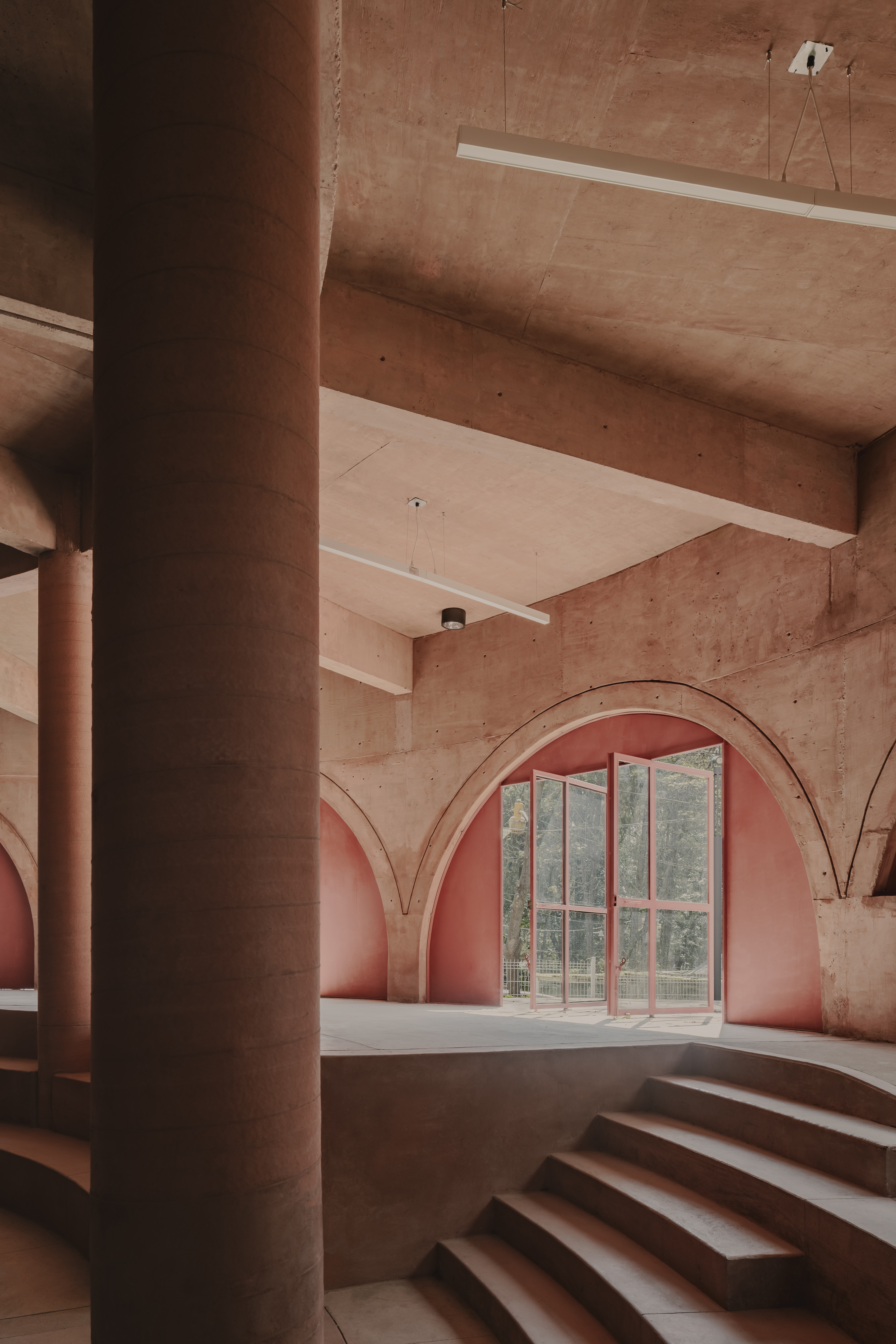 AMASA 에스투디오는 이러한 조건 속에서 원형 매스를 제안했다. 삼각형 대지와 6미터 경사를 흡수하면서 녹지를 최대한 보존할 수 있는 형태였다. 사각형 건물이 가질 수 있는 사각지대와 비효율적 동선을 피하고, 프로그램을 계단식으로 배치하여 경사지와 풍경에 자연스럽게 통합했다.