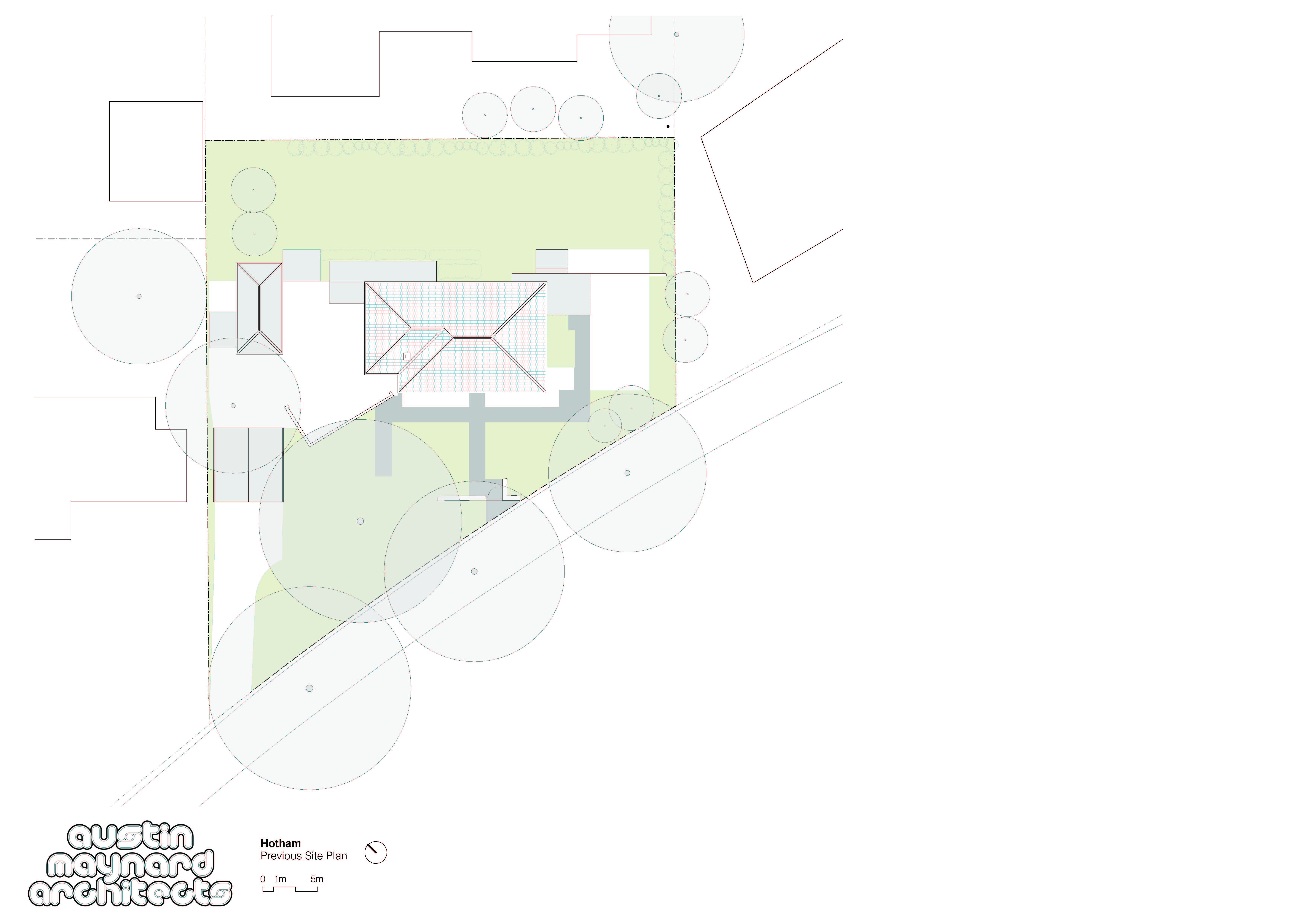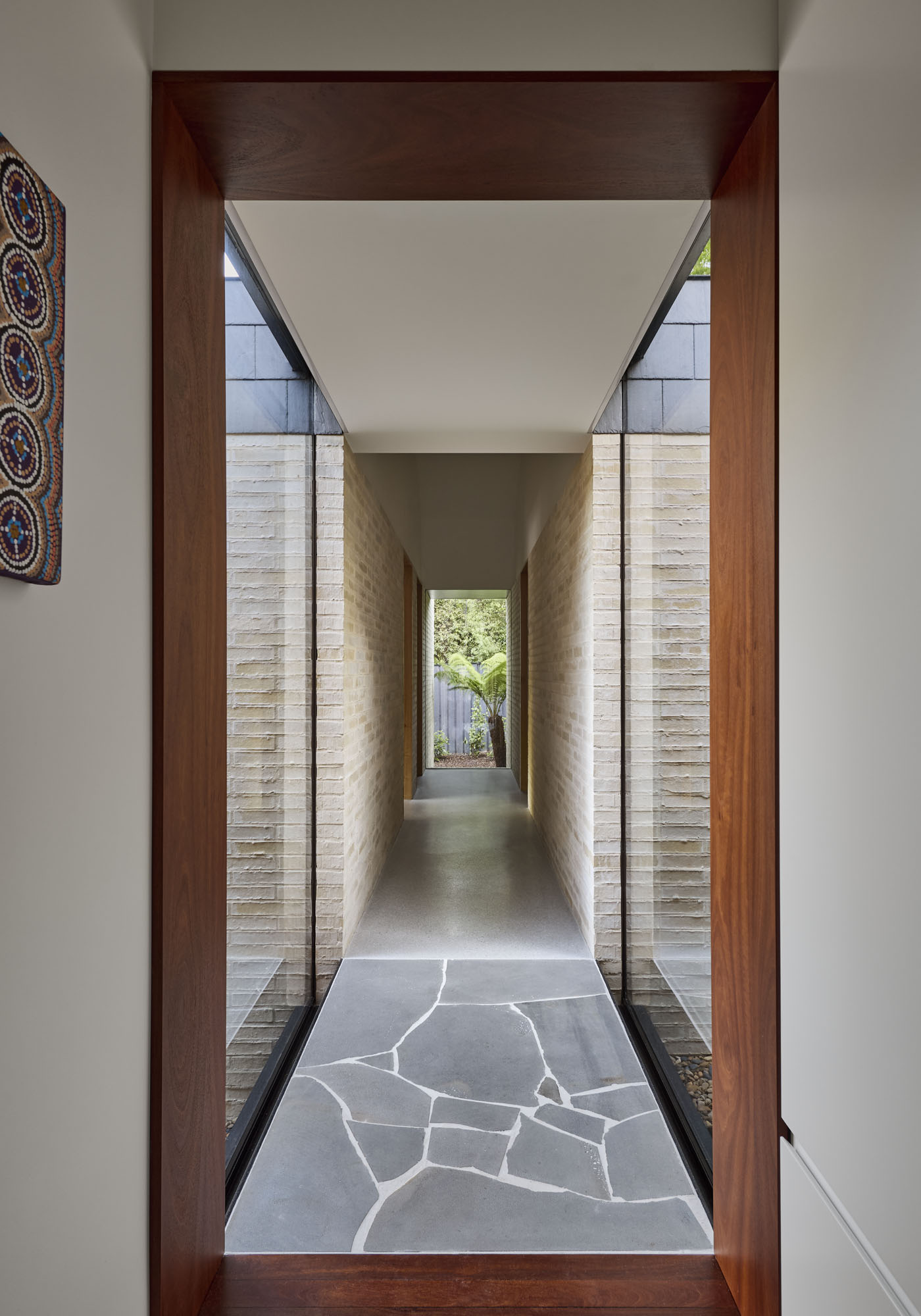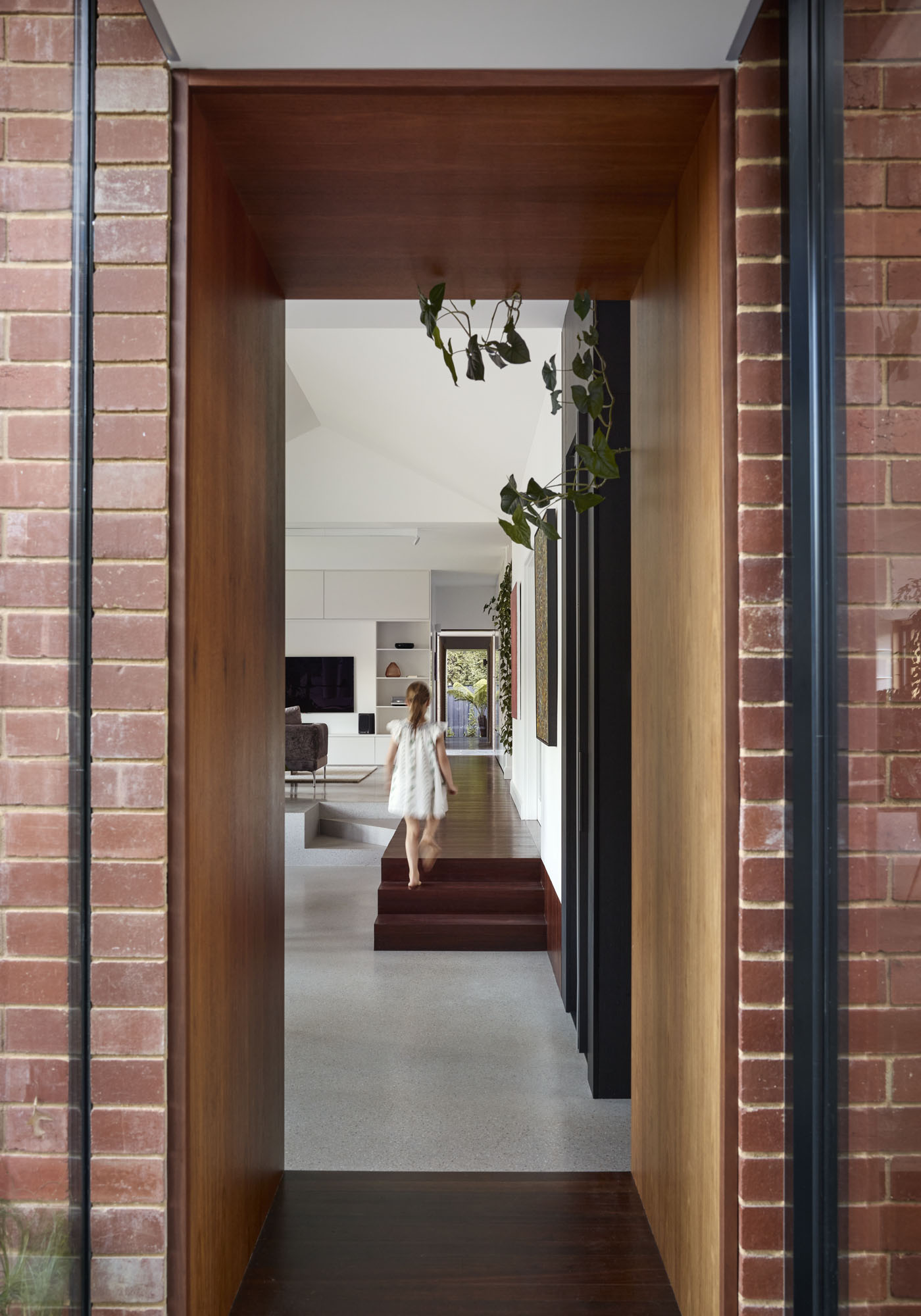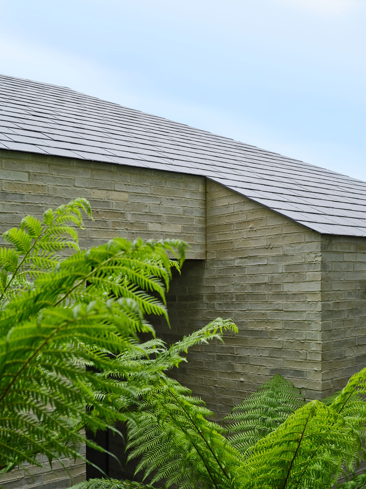 원래의 벽돌 코티지는 중심에 두고, 양쪽에 두 개의 파빌리온 윙을 유리 복도로 연결하는 방식이 채택되었다. 하나는 침실과 가족 공간을 담아 아늑하고 내향적으로 계획되었고, 다른 하나는 놀이와 오락 기능을 수용하며 외부와 열려 있다. 두 영역 사이의 긴 복도는 채광과 조경을 끌어들여 마치 정원을 가로지르는 듯한 경험을 제공한다.