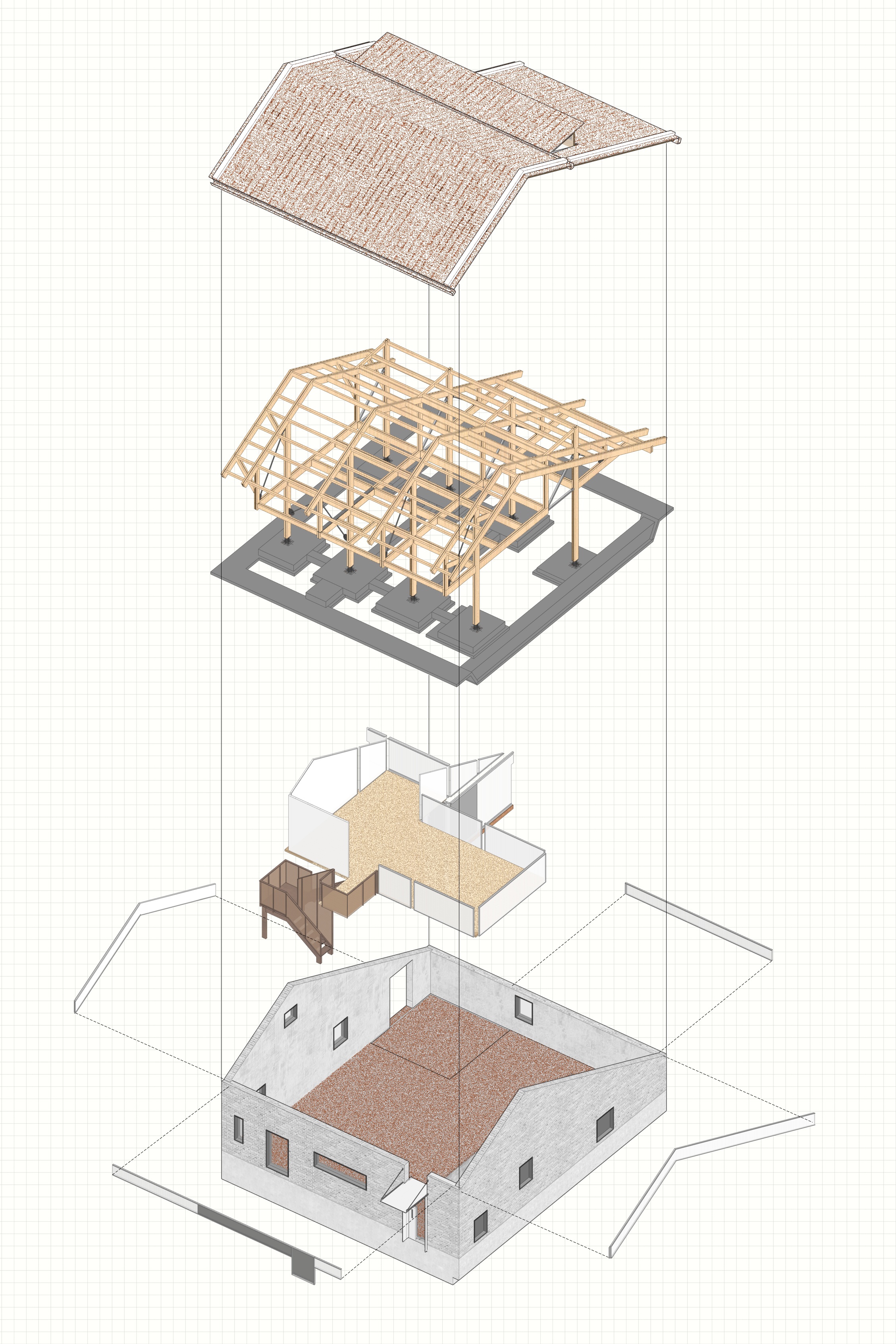 - 4번 건물: 외벽은 유지하되 내부 벽체를 제거하고 강철-목재 기둥으로 대체, 오픈 스튜디오로 변모. 기존 단차(600mm)는 창작에 활용할 수 있는 유연한 레벨 차 공간으로 재해석했다.