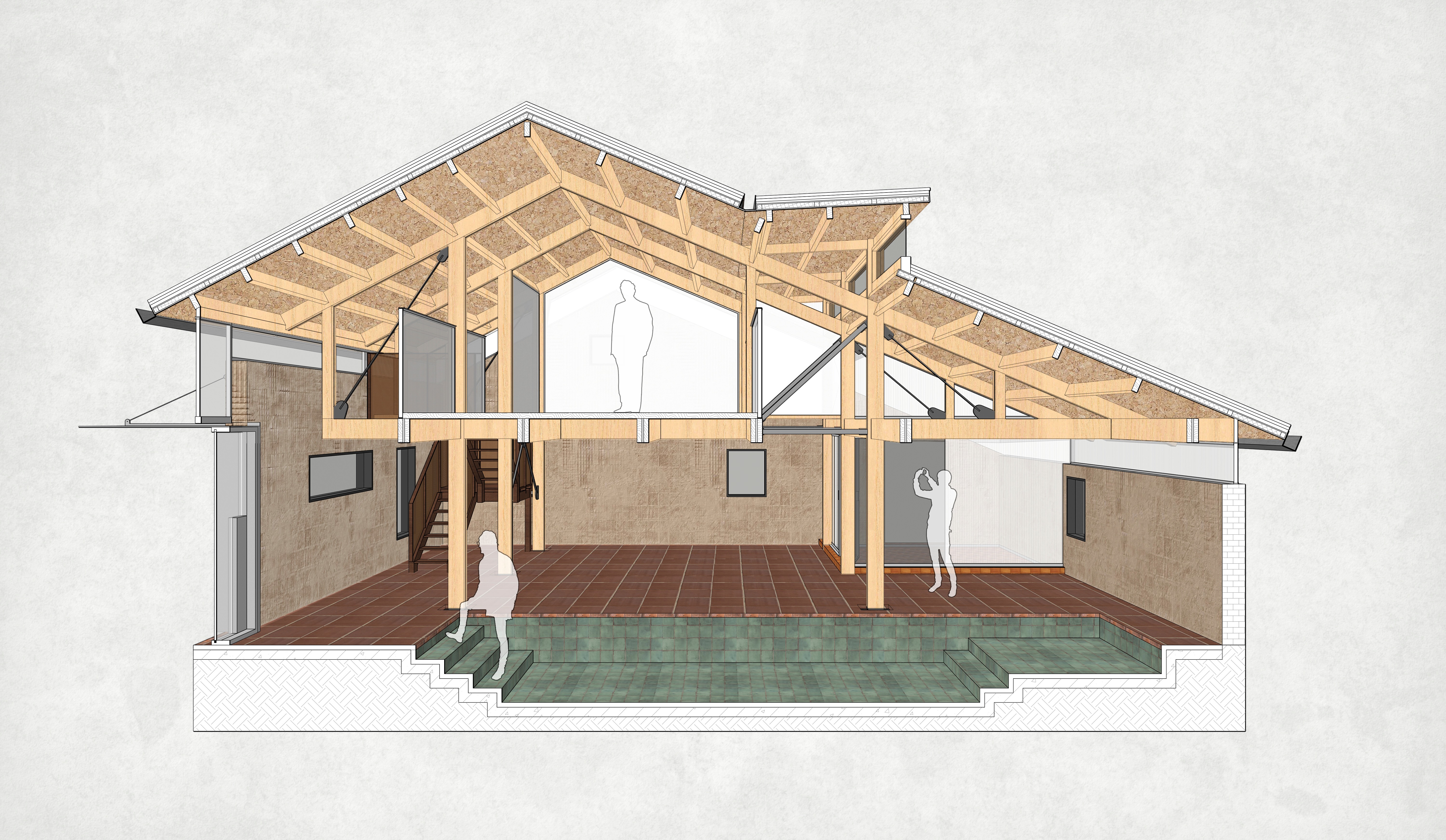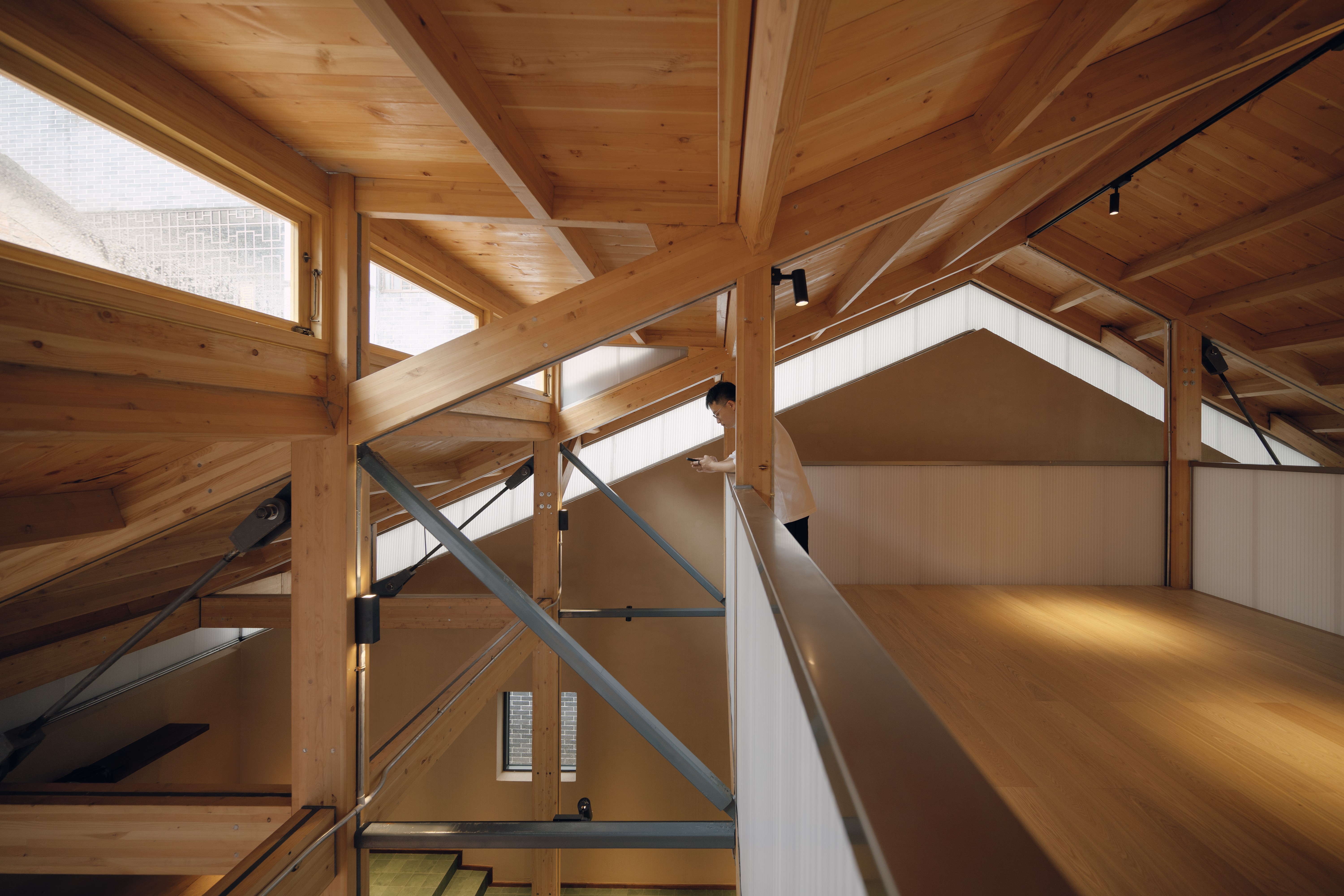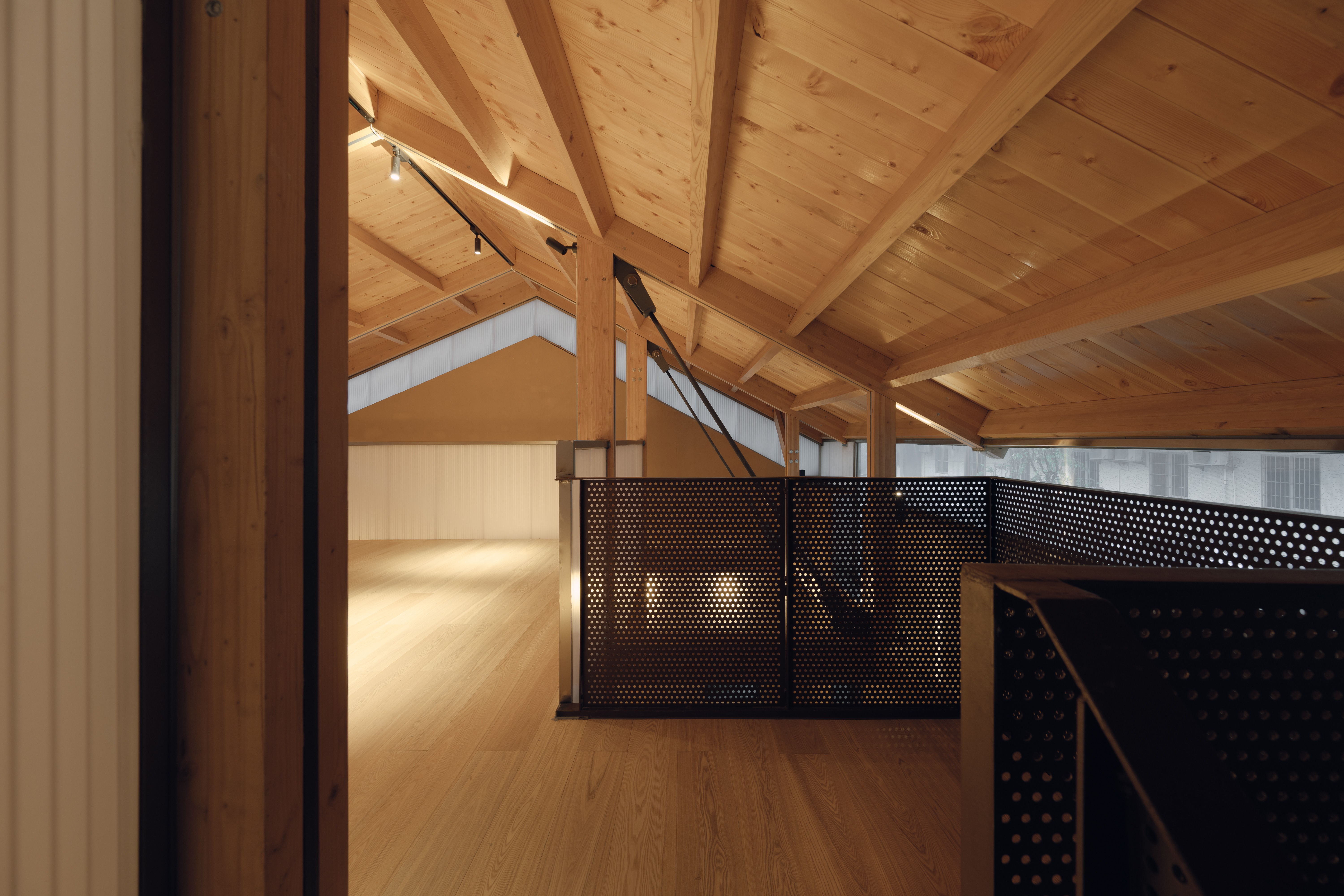 - 4번 건물: 외벽은 유지하되 내부 벽체를 제거하고 강철-목재 기둥으로 대체, 오픈 스튜디오로 변모. 기존 단차(600mm)는 창작에 활용할 수 있는 유연한 레벨 차 공간으로 재해석했다.