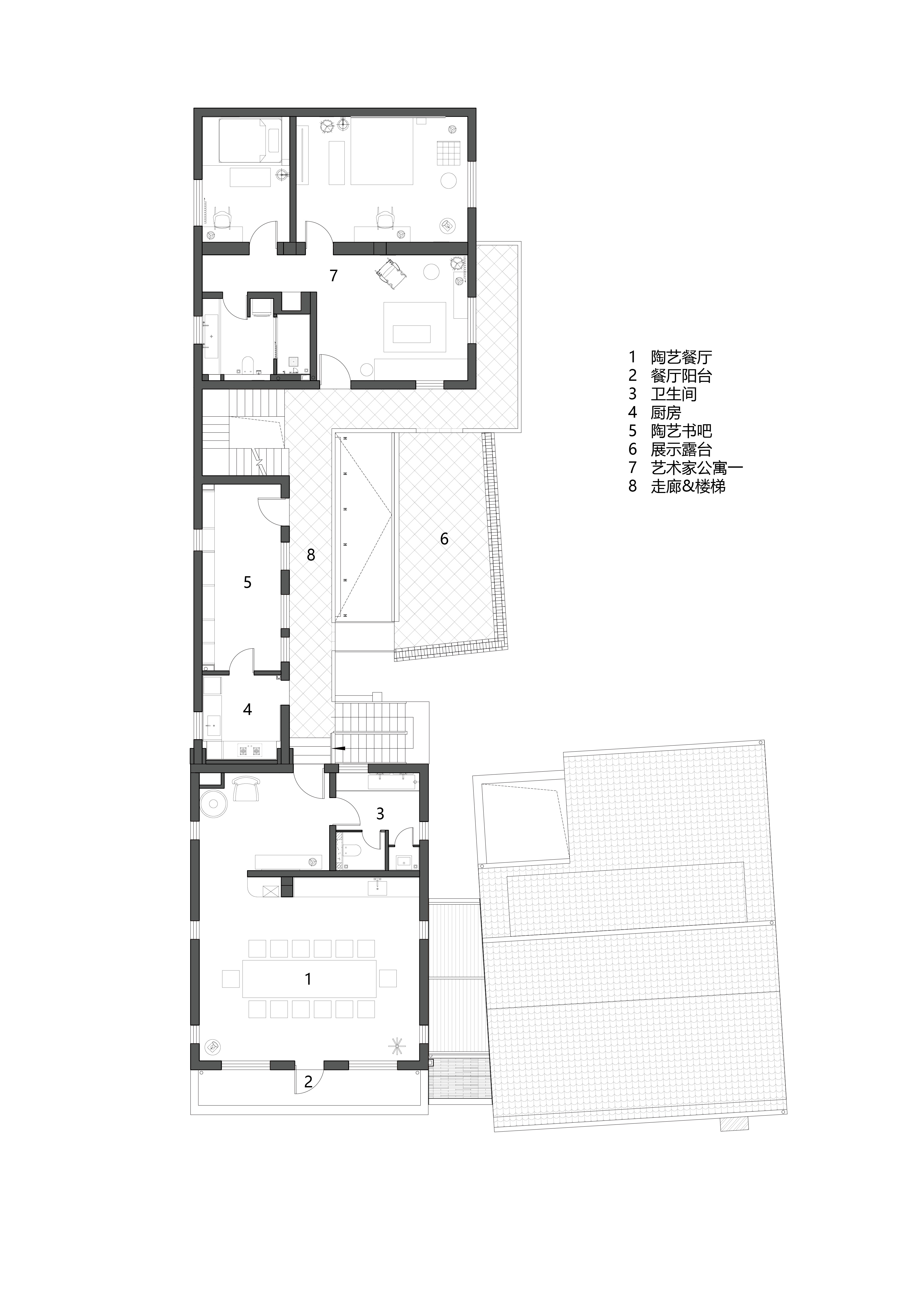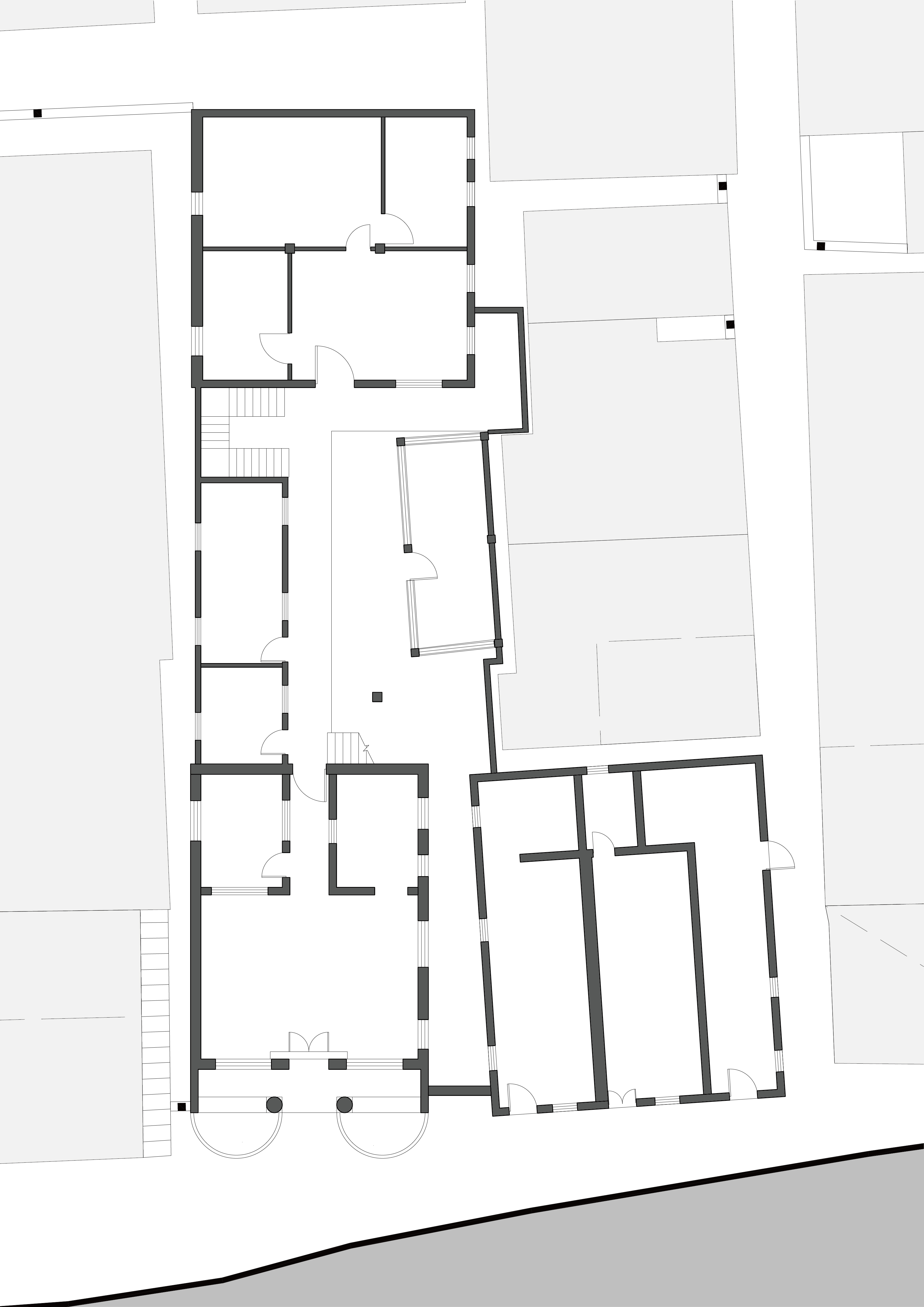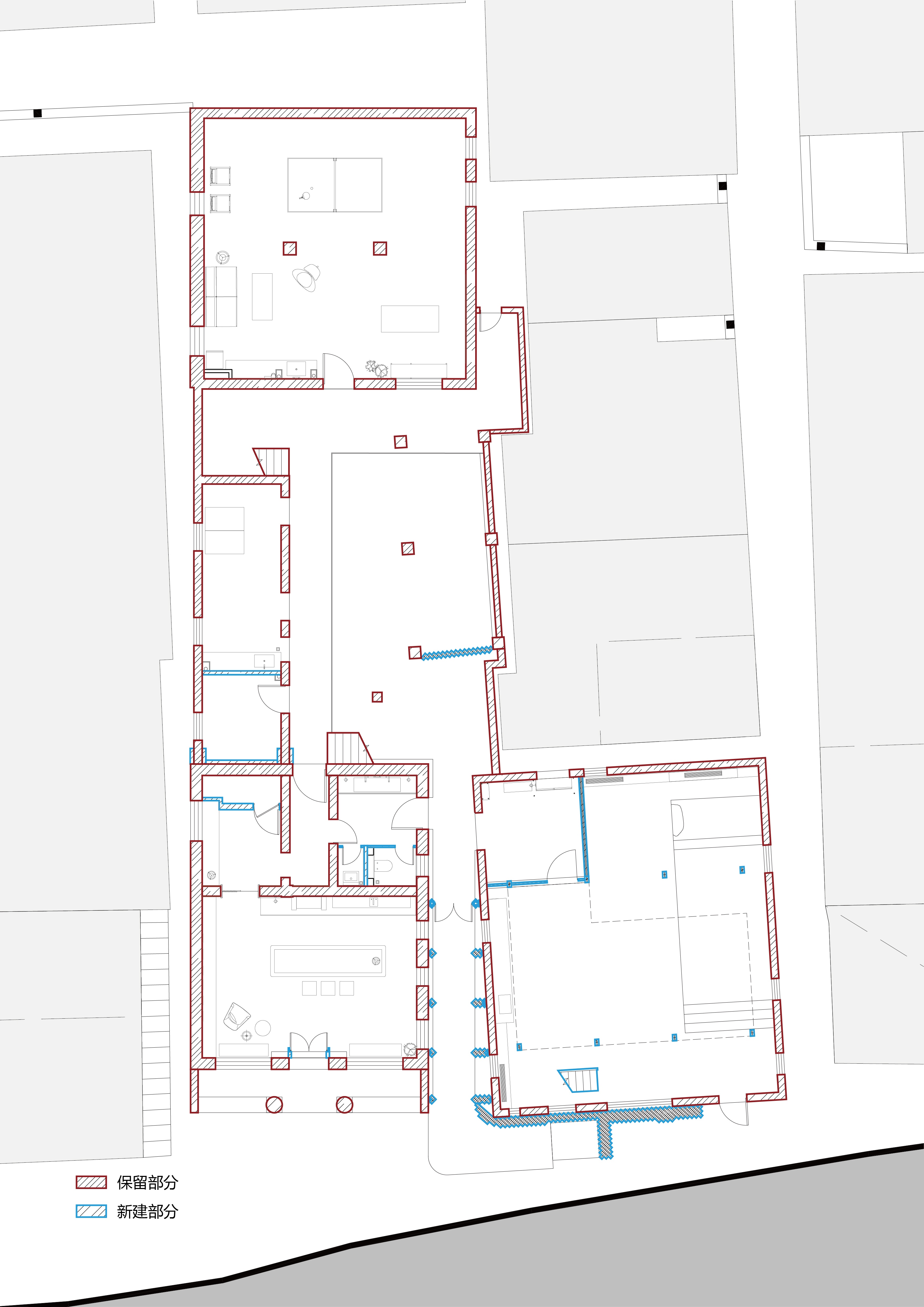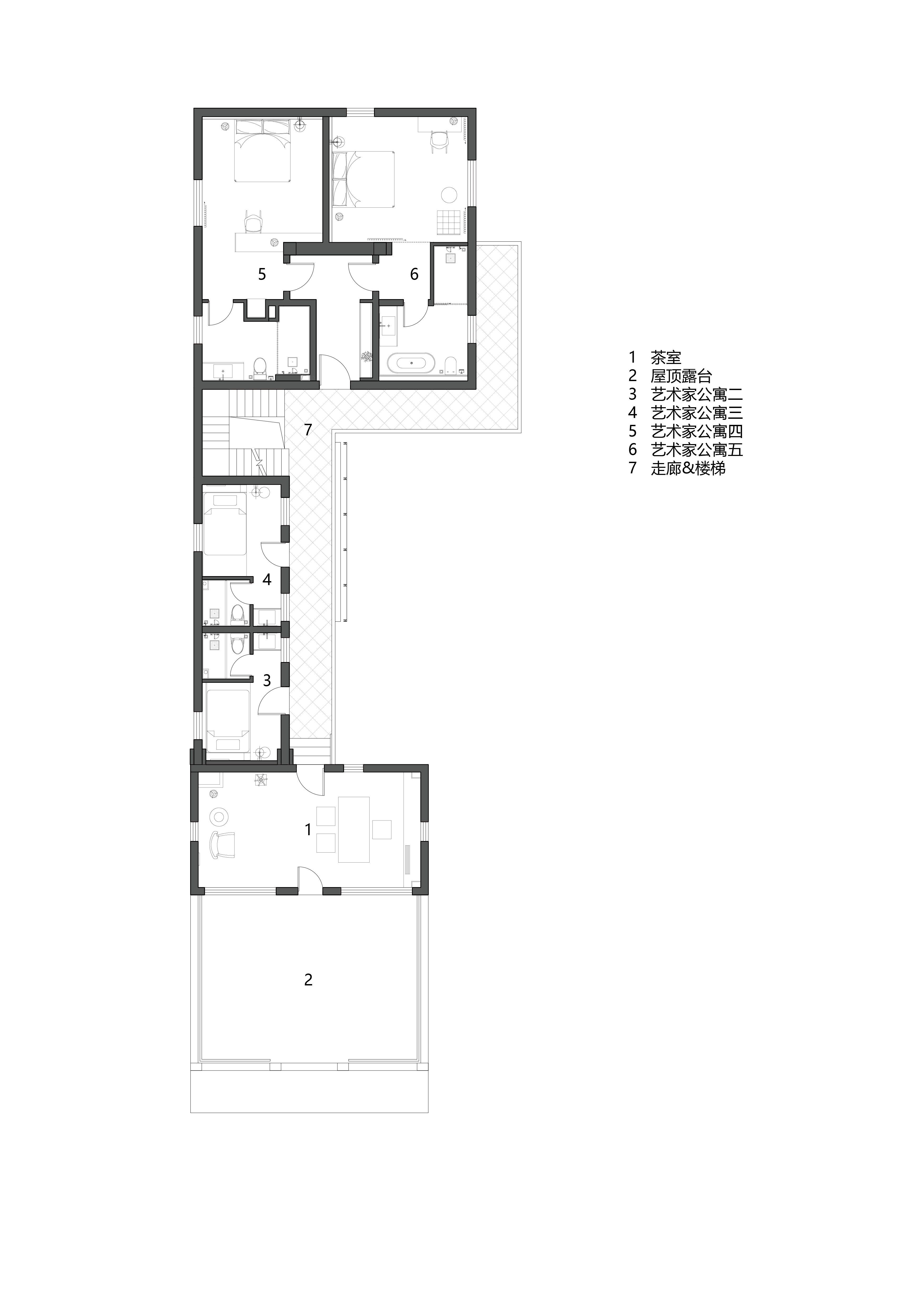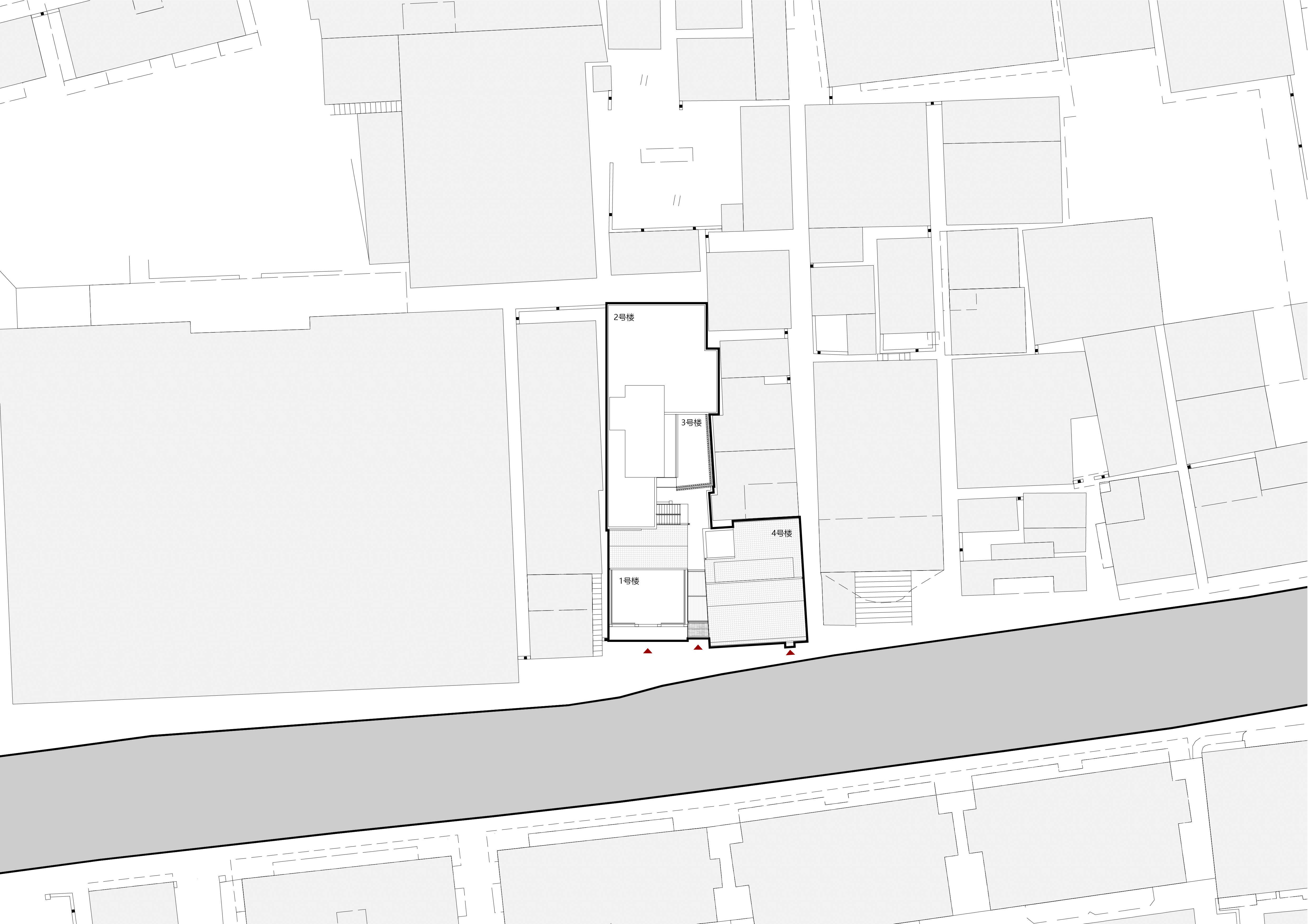 - 2번 건물: 예술가 레지던시와 임시 거주 공간으로 개조. 외벽의 세척석 마감을 살리고, 내부는 작은 공간 구성을 재조정했다.