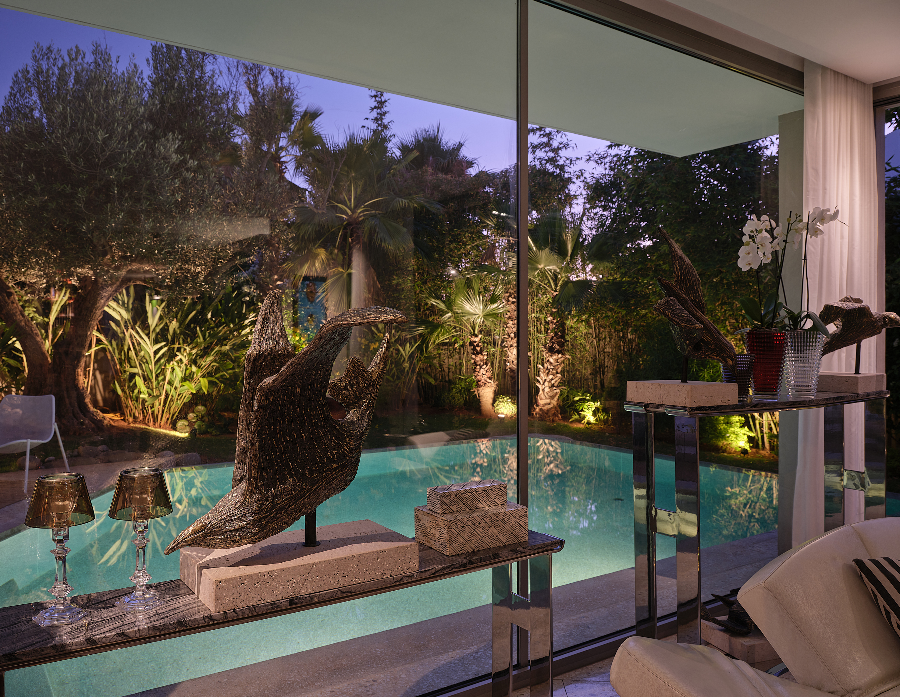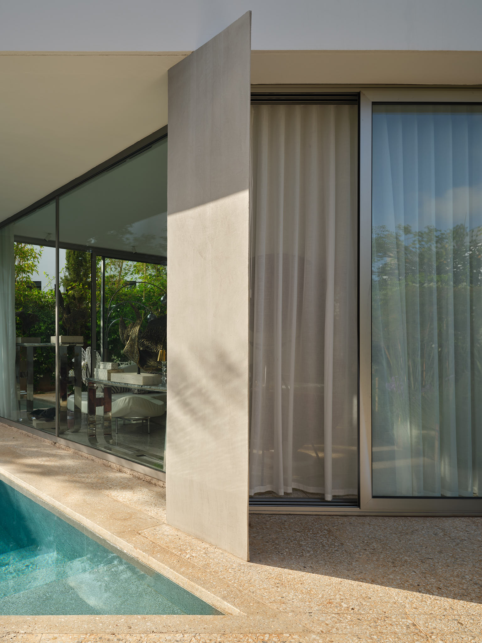빌라 미로는 카사블랑카의 삼각형 대지 위에 계획되었으며, 의무적인 이격선에 따라 평면의 실루엣이 형성되었다. 이러한 독특한 형태는 목재 격자에 의해 보호된 중심의 나선형 계단을 중심으로 한 구성을 이끌어냈으며, 이 계단은 모든 공간의 핵심이 되었다. 중심 코어는 서비스 공간으로의 접근을 은밀하고 유연하게 조율하면서 가족실을 형성하고, 나머지 공간은 넓고 밝은 리셉션 공간으로 비워둘 수 있도록 했다. 또한 이 코어는 2층의 세 개 침실을 구분하면서도 또 하나의 가족실을 제공한다. 집의 선단에는 수영장이 배치되어 있으며, 대형 유리 슬라이딩 도어를 통해 내부에서도 그 풍경을 경험할 수 있다. 사용된 재료는 절제되면서도 현대적이며, 동시에 따뜻함과 감각적 분위기를 풍긴다. 소유주인 카사블랑카의 예술가는 엄선된 예술 작품과 가구를 더해 집에 특별한 영혼을 불어넣었다.