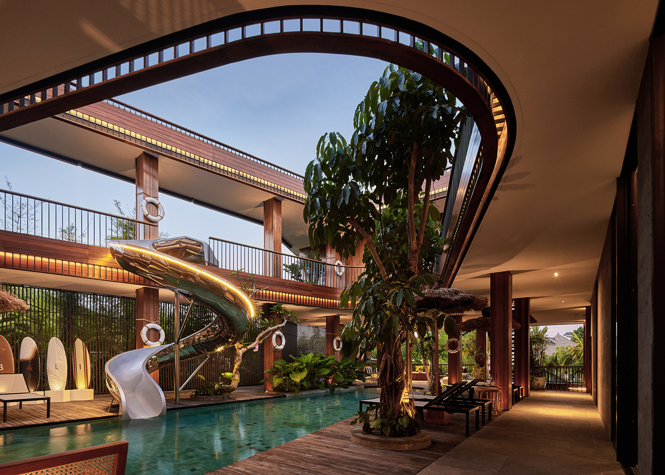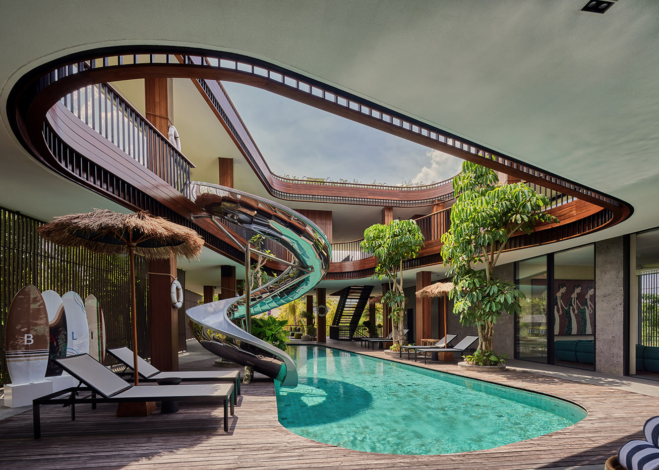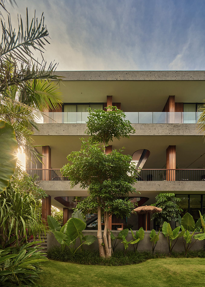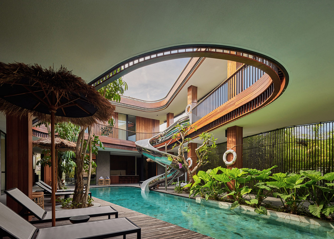 하부 공간은 고요한 수영장으로 이어지며, 보이드의 장난스러운 에너지와 차분한 휴식을 대비시켰다. 이러한 배치는 활동성과 안정성을 동시에 구현하며 실내·외가 유기적으로 연결되는 열대 건축의 특성을 드러냈다. 개방된 공간, 울창한 조경, 자연 소재는 주변 환경과 깊은 연계를 이루었다.