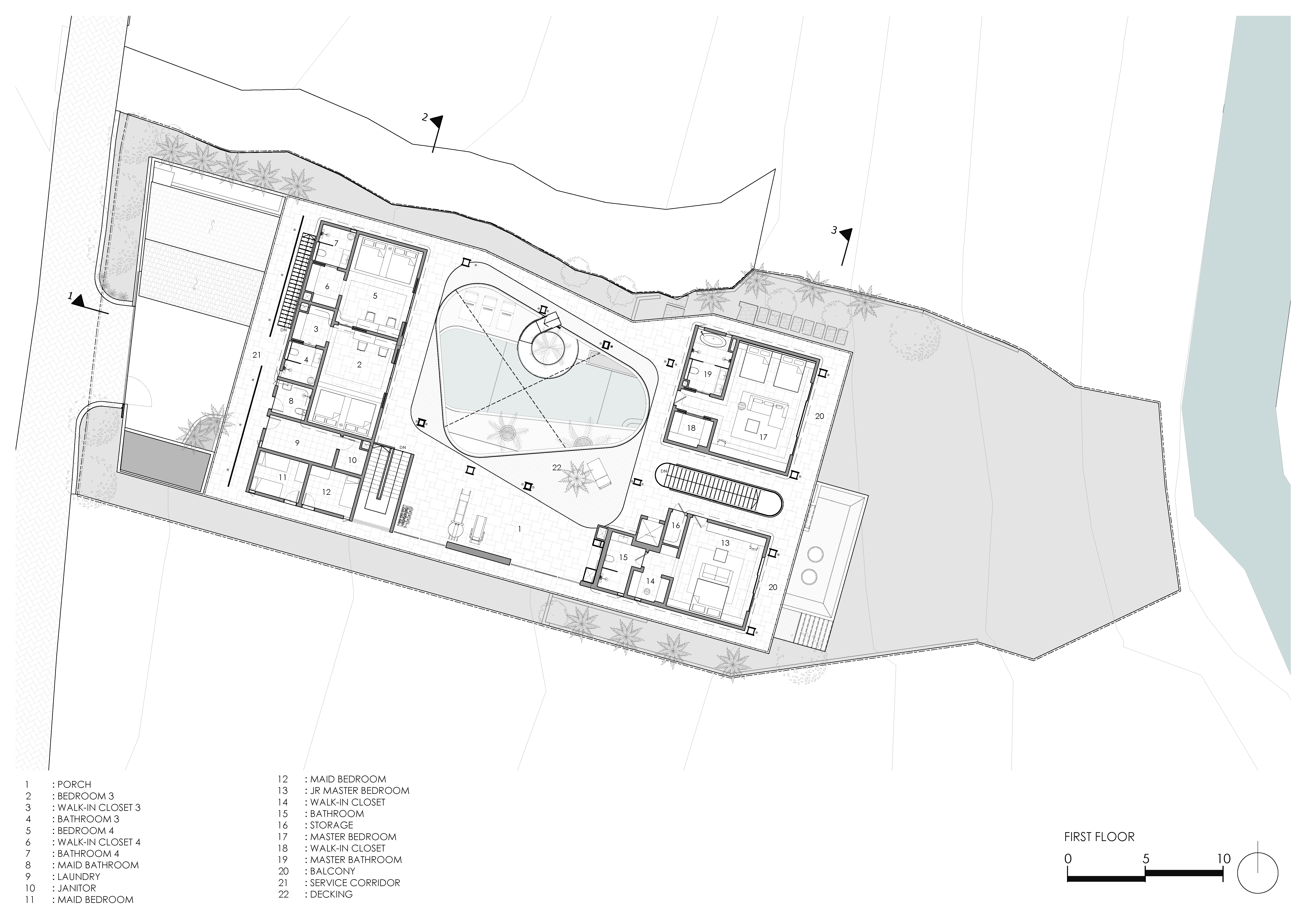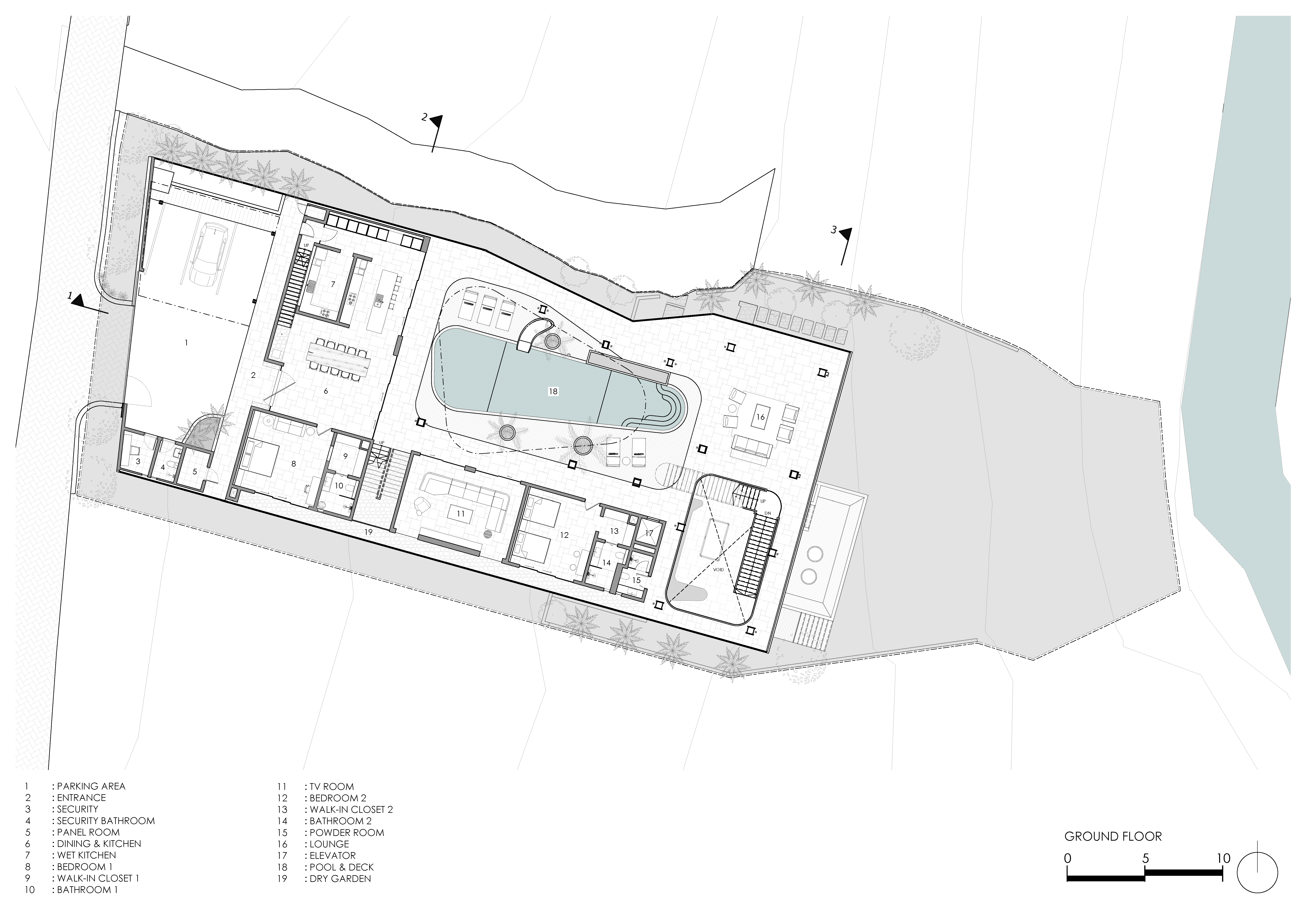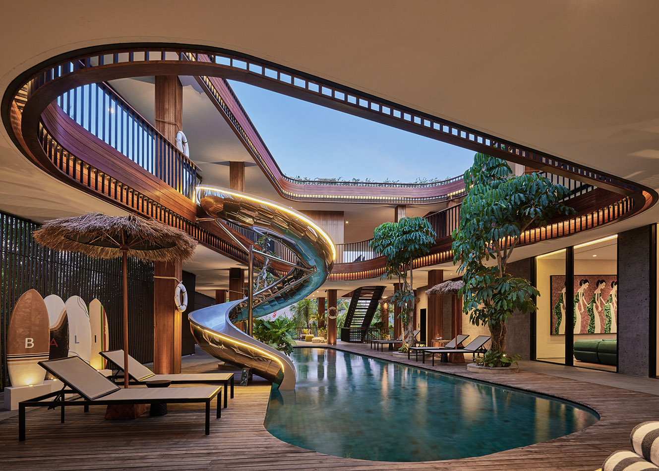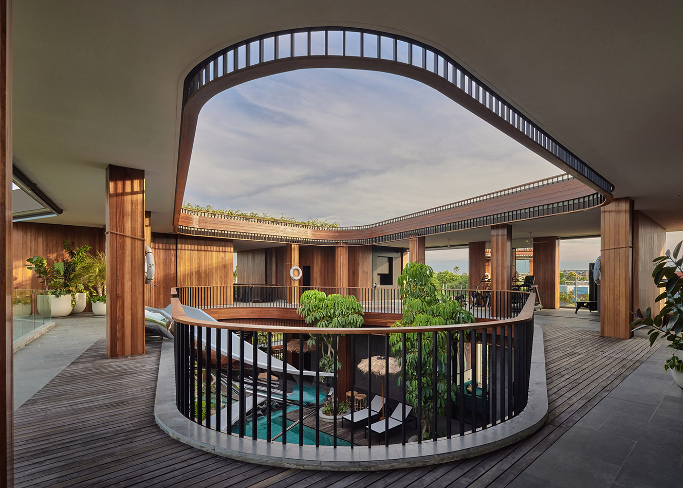 하부 공간은 고요한 수영장으로 이어지며, 보이드의 장난스러운 에너지와 차분한 휴식을 대비시켰다. 이러한 배치는 활동성과 안정성을 동시에 구현하며 실내·외가 유기적으로 연결되는 열대 건축의 특성을 드러냈다. 개방된 공간, 울창한 조경, 자연 소재는 주변 환경과 깊은 연계를 이루었다.