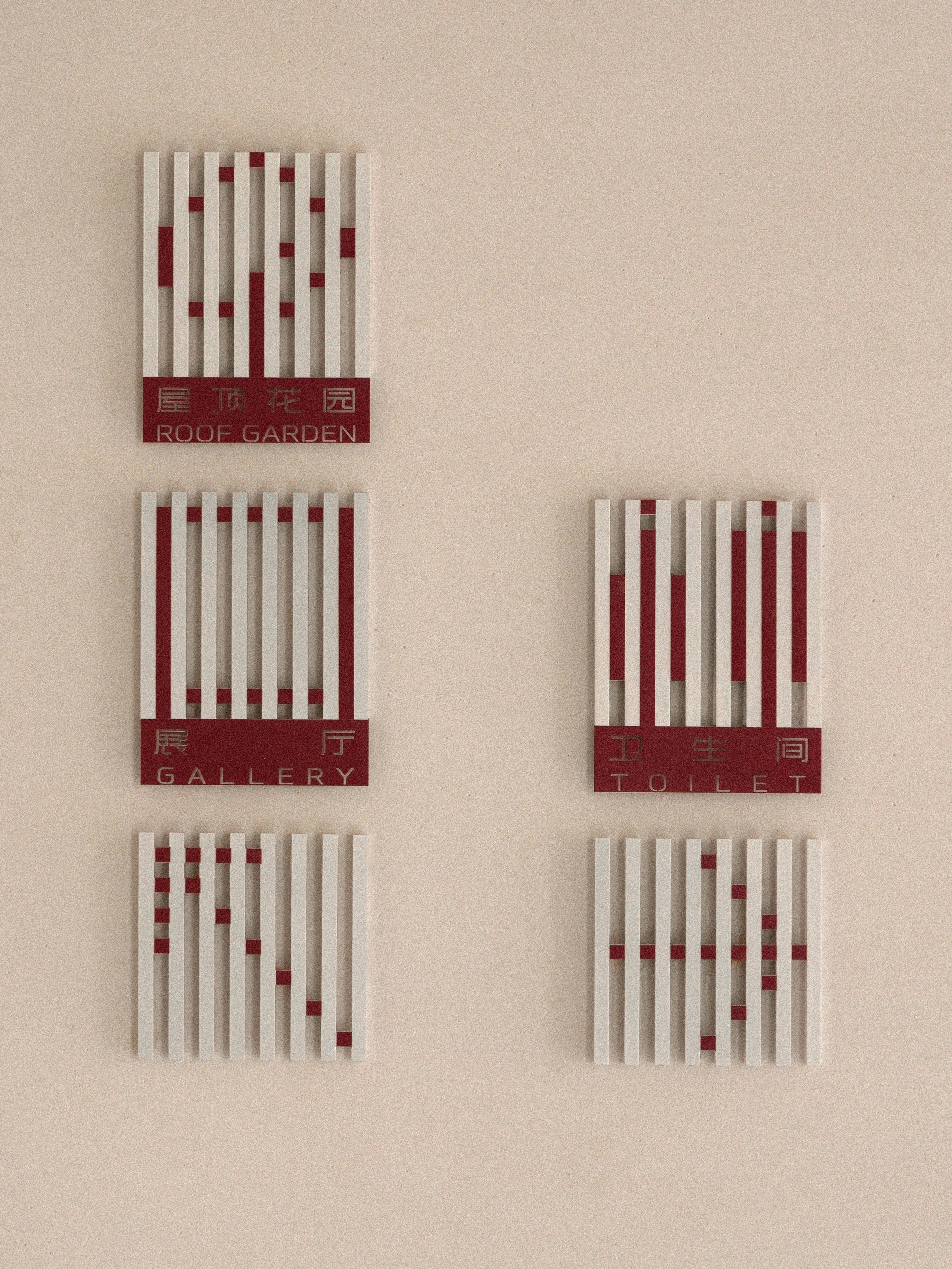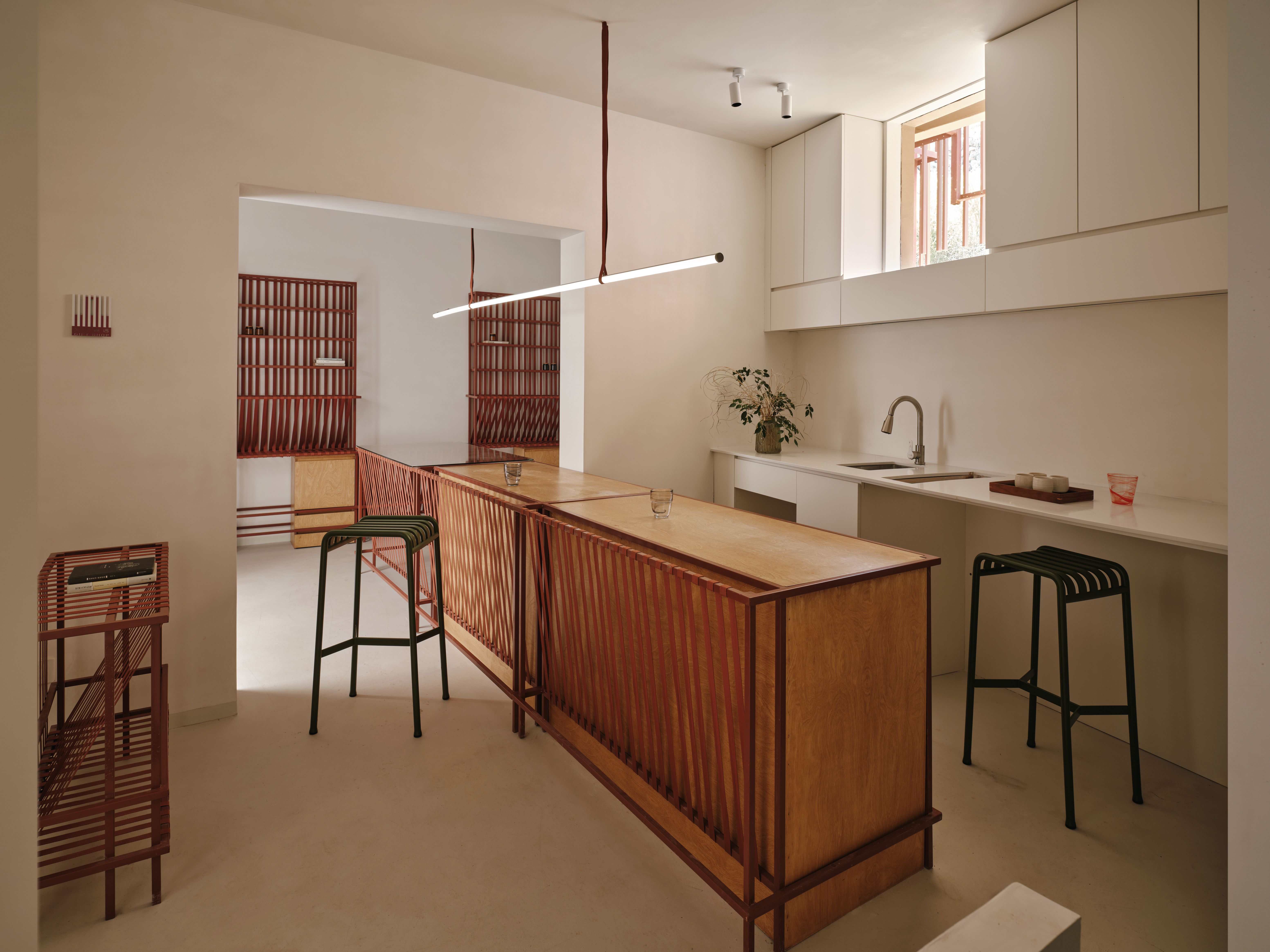 또한 카페와 숍을 위해 전통 베틀 형상에서 영감을 얻은 ‘LOOM’ 가구 시리즈를 디자인했다. 20×20mm 강관 프레임에 맞춤 제작한 빨간 직조 스트랩을 감아 수평과 사선을 이루었으며, 이는 외피의 격자와 호응해 직조된 실의 모티프를 실내까지 확장시켰다.\