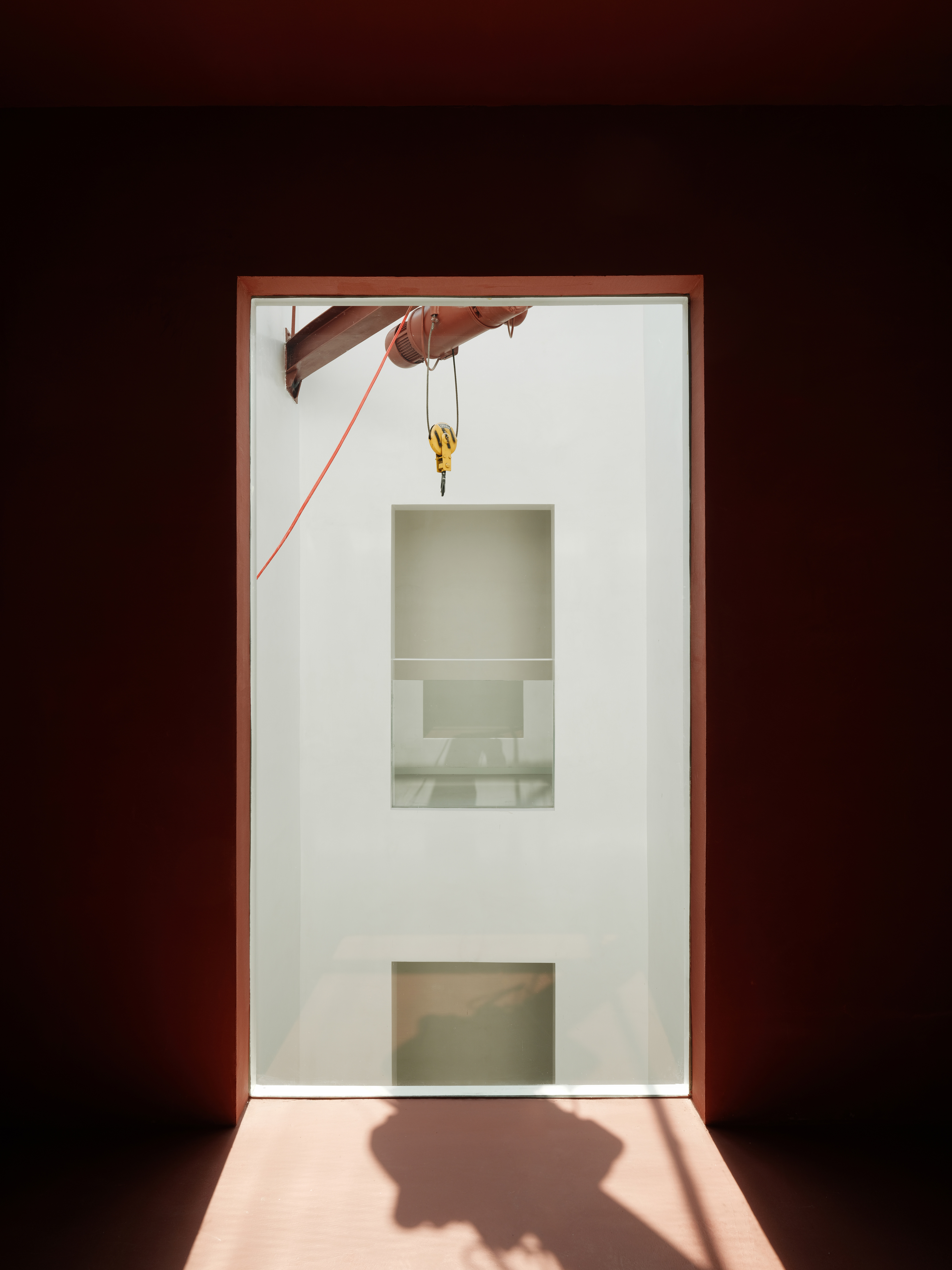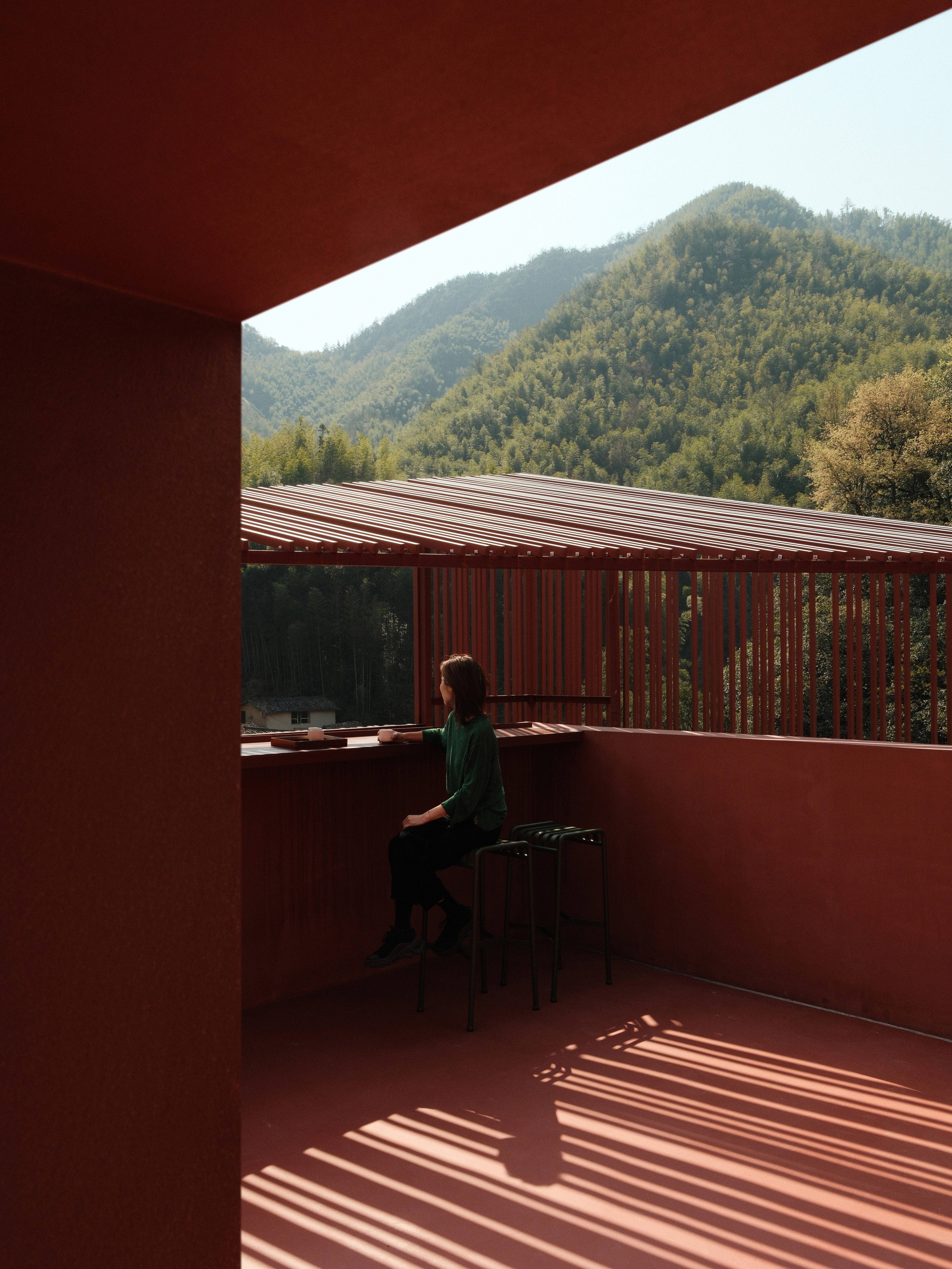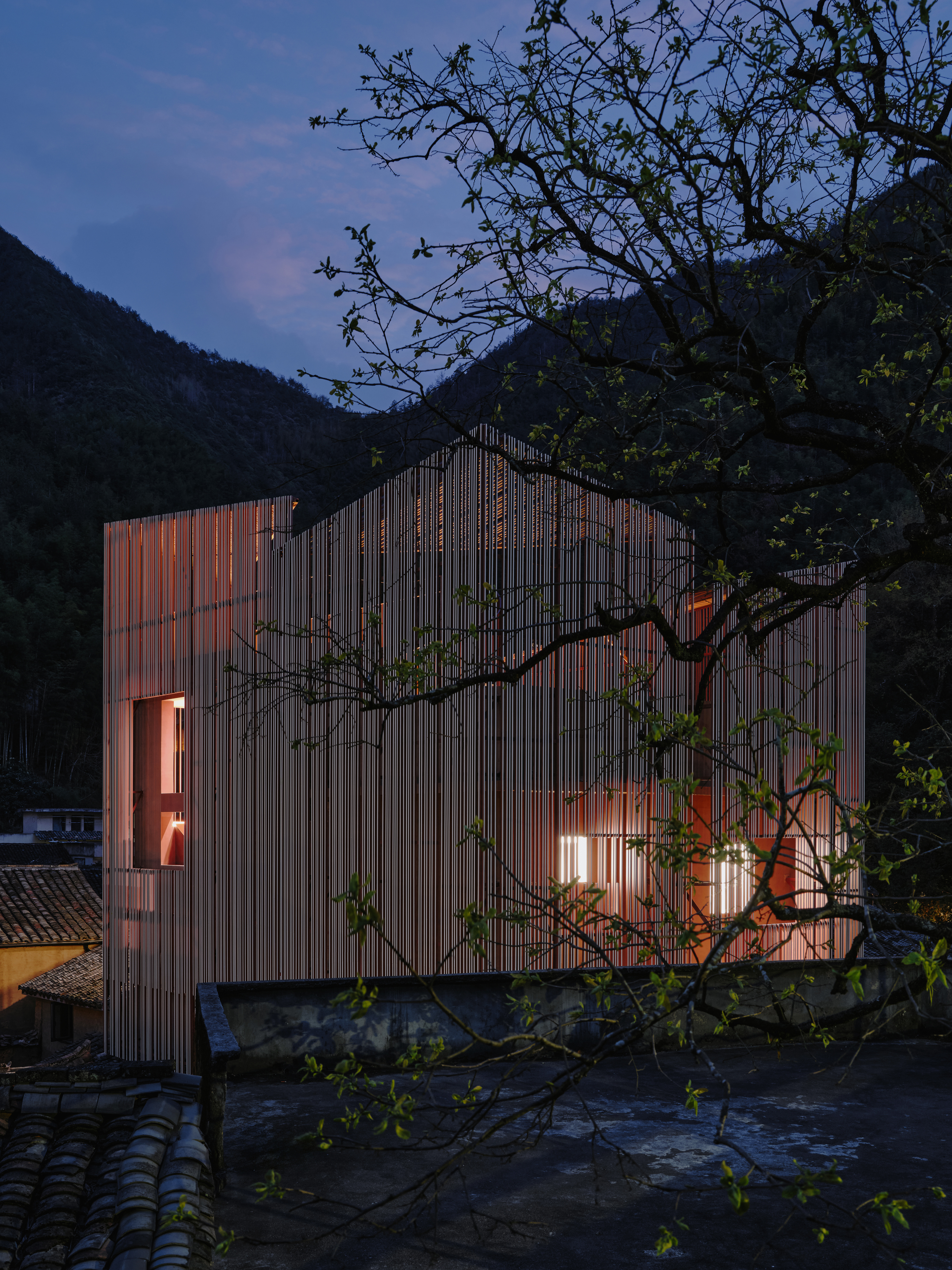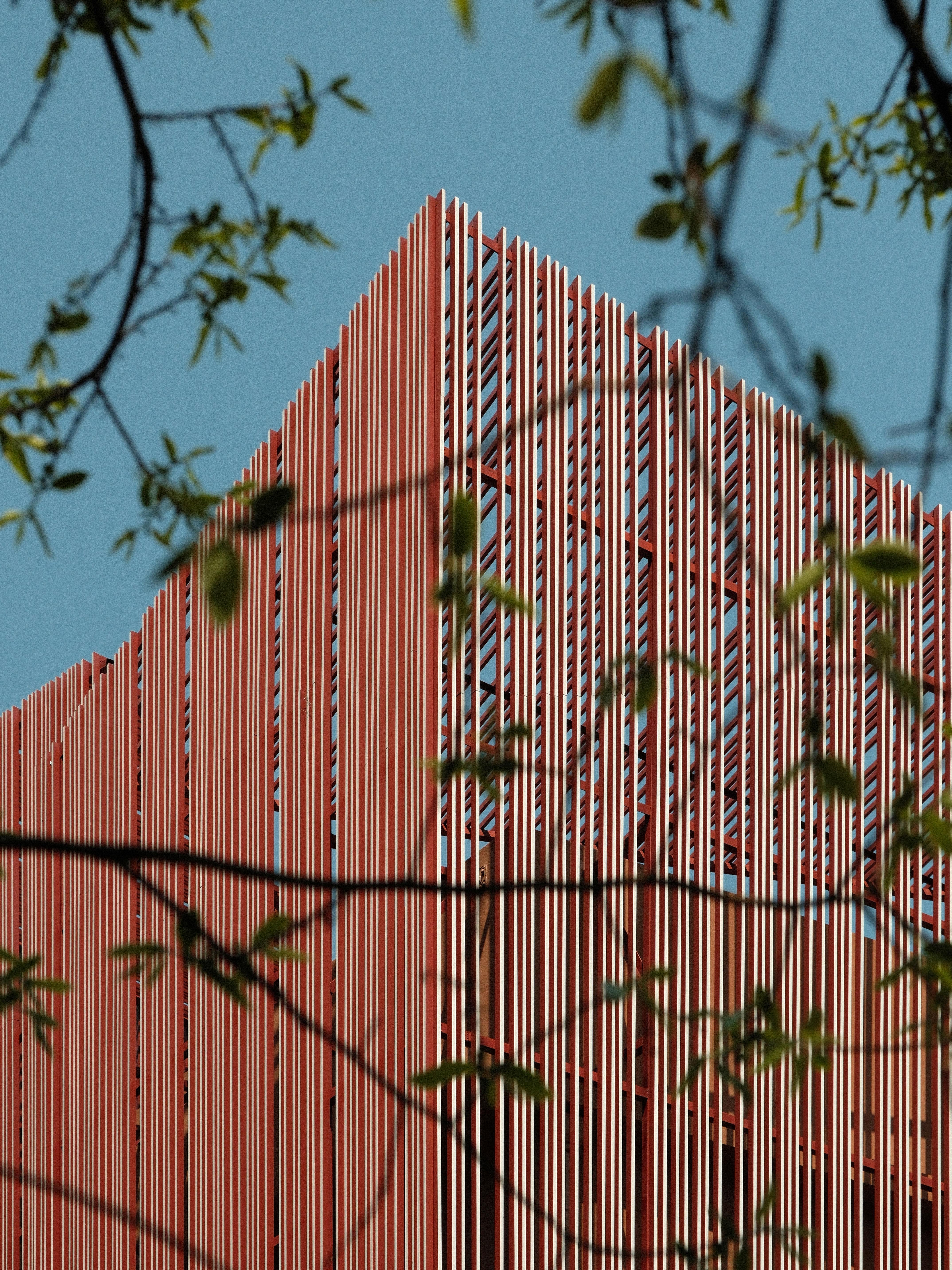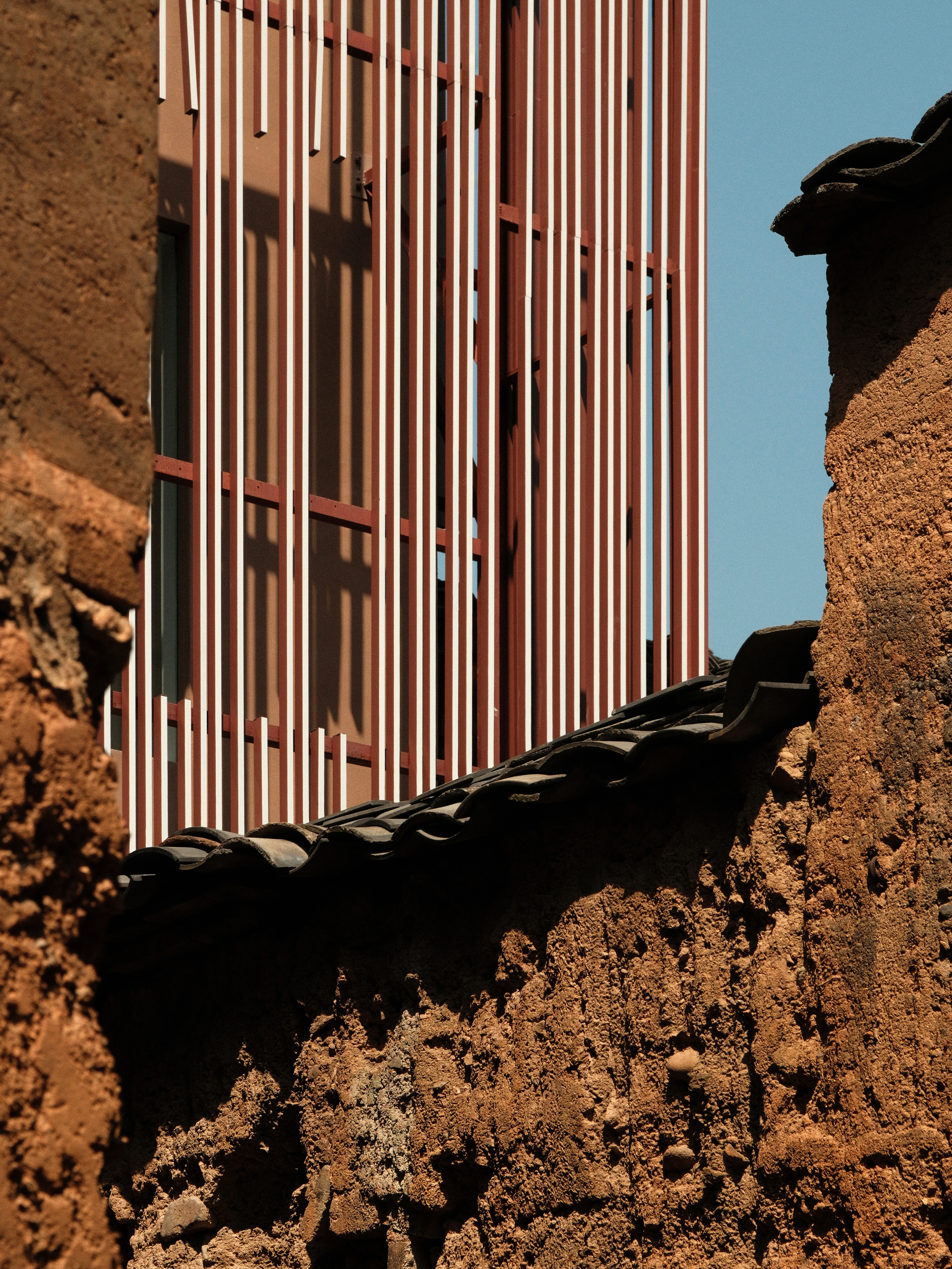 외관은 전통 직조에서 착안한 알루미늄 격자로 감쌌다. 20×40mm 규격의 알루미늄 튜브 세 면은 빨강, 한 면은 흰색으로 도장해 정교한 직조망을 만들었다. 불규칙한 간격과 상·하부의 다른 패턴은 기계적 단조로움을 피하고, 특히 테라스 구간에서는 다차원적 얽힘을 강조했다. 햇살이 산촌에 스며드는 아침이면 파사드 위에 빛과 그림자가 직조되며, 하루의 시간과 날씨에 따라 외피는 분홍빛 반투명 덩어리에서 흰색 모노리스로 변화했다.