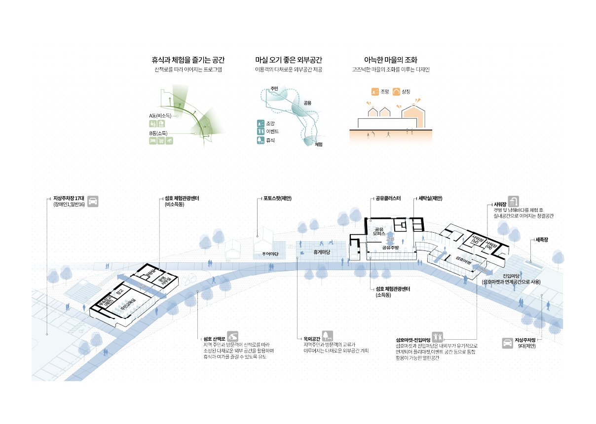 섬호 관광센터는 바다를 향한 시선과 대지의 자연스러운 흐름을 따라 걷는 길 위에서, 주민과 방문객이 함께 어우러져 교류하며 다양한 활동과 이야기가 펼쳐지는 체험 공간을 제안한다. 비정형의 대지 형상에 맞춰 계획된 공간은 실내외를 유기적으로 연결하며, 열린 구조 속에서 다채로운 경험을 제공한다. 남해안 전원의 풍경 속에 자리한 이 거점센터는 지역 주민의 일상과 방문객의 체험이 자연스럽게 어우러지는 열린 플랫폼으로 기능한다. 특히, 이형적인 대지의 특성을 섬세하게 반영해 풍향과 조망을 고려한 공간 배치, 보행과 진출입 동선의 체계적인 계획, 그리고 다양한 사용자의 접근성을 세심하게 담아내어 누구나 편안하게 머무를 수 있는 환경을 조성하였다.