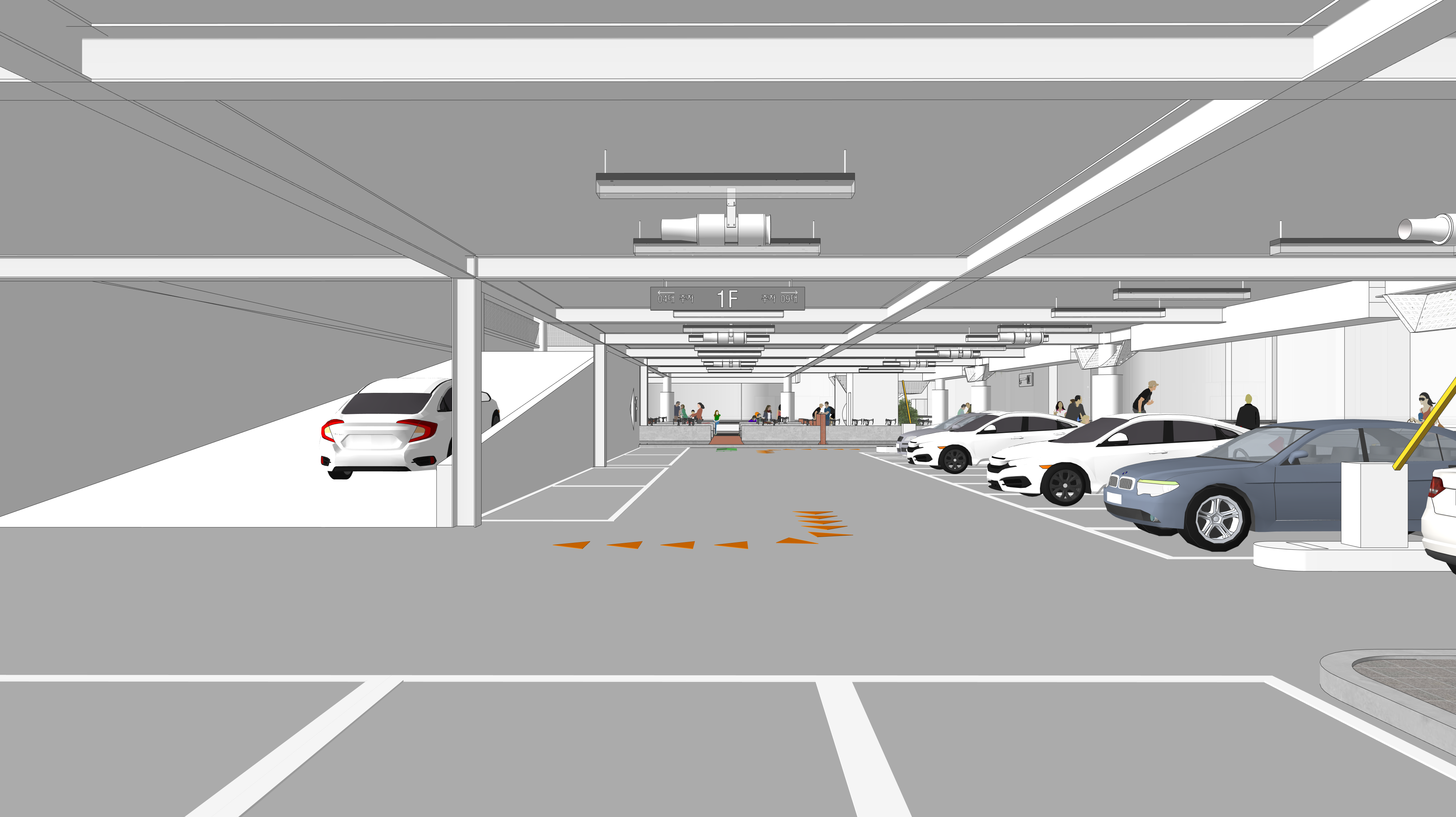 대상지는 협소하고 밀도 높은 도시 맥락에 둘러싸여 있어, 개방적 조망보다는 내부 이용자의 쾌적성과 효율성이 우선되는 조건을 지닌다. 이에 따라 총 170대 주차구획을 효율적으로 배열하고, 일반형·장애인·전기차·확장형·경형주차의 구역을 명확히 구분하였다. 차량 동선은 단순하고 안전하게 계획되었으며, 1층은 넓은 자전거 주차장과 주민 친화 프로그램을 결합해 커뮤니티를 유도한다. 경사로는 배면에 배치하고 코어는 도시가로와 면하도록 전면배치하여 인접 대지의 피해를 최소화하고, 제약사항이 많은 대지에서 최대 대수의 주차면과 효율적인 차량 및 보행자 동선을 계획하였다.