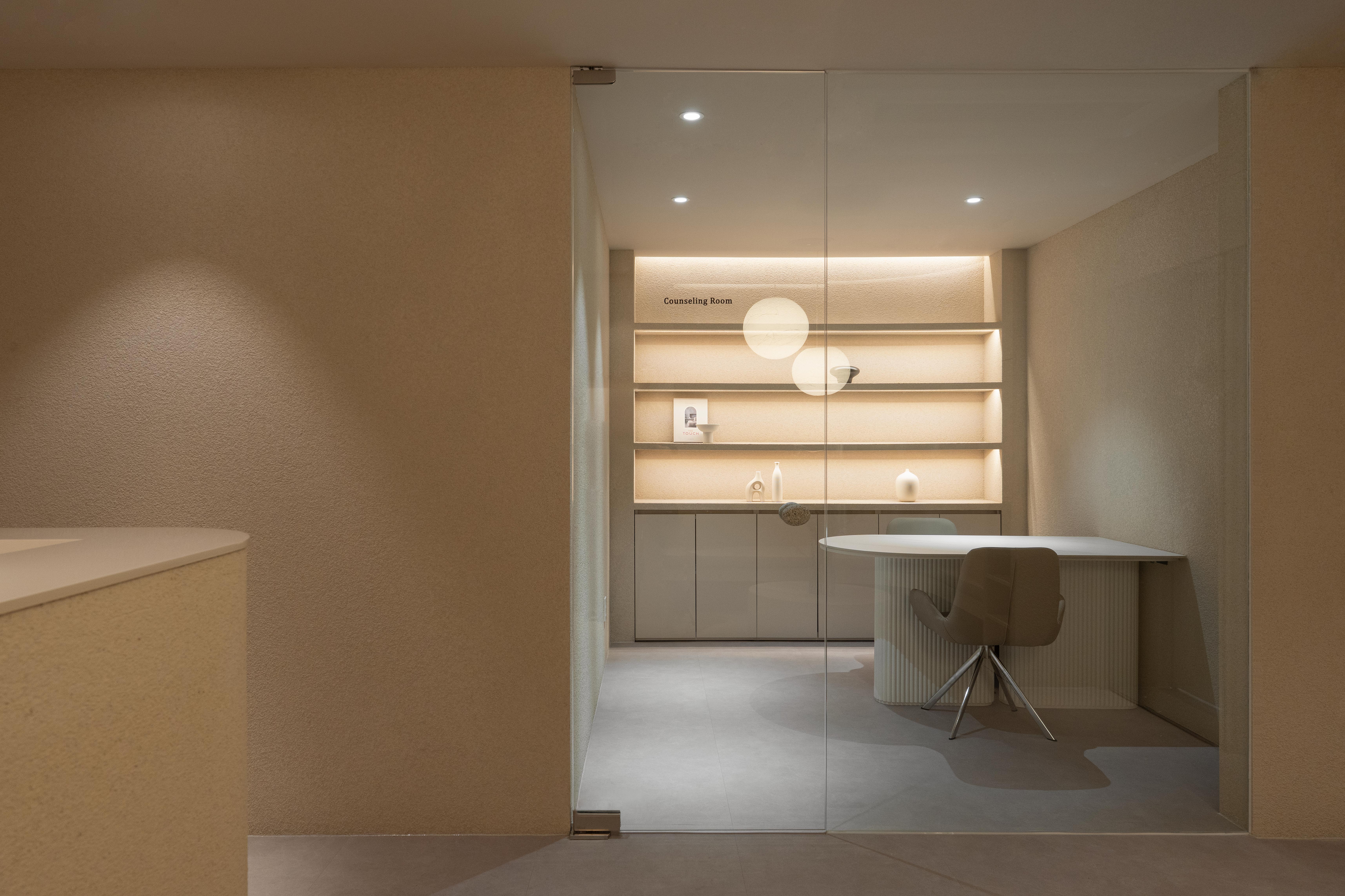 상담실의 출입문은 유리도어로 설치하고, 라운지와 동일한 스타코 도장 마감으로 전반에 일체감을 유지하며 두 공간의 경계를 자연스럽게 연결했다. 또한, 상담실 한쪽 벽의 와이드한 붙박이 하부장과 매립 선반, 그리고 간접 조명을 통해 실용성과 미감을 확보했다. 은은하고 부드러운 빛이 유리도어를 통해 새어나오며 감각적인 디스플레이 효과를 연출하고, 통일된 분위기 속 정제된 디자인을 의도했다. 케어실은 최소한의 동선을 기반으로, 제한된 공간 내에서 필요한 모든 실을 효율적으로 배치했다.