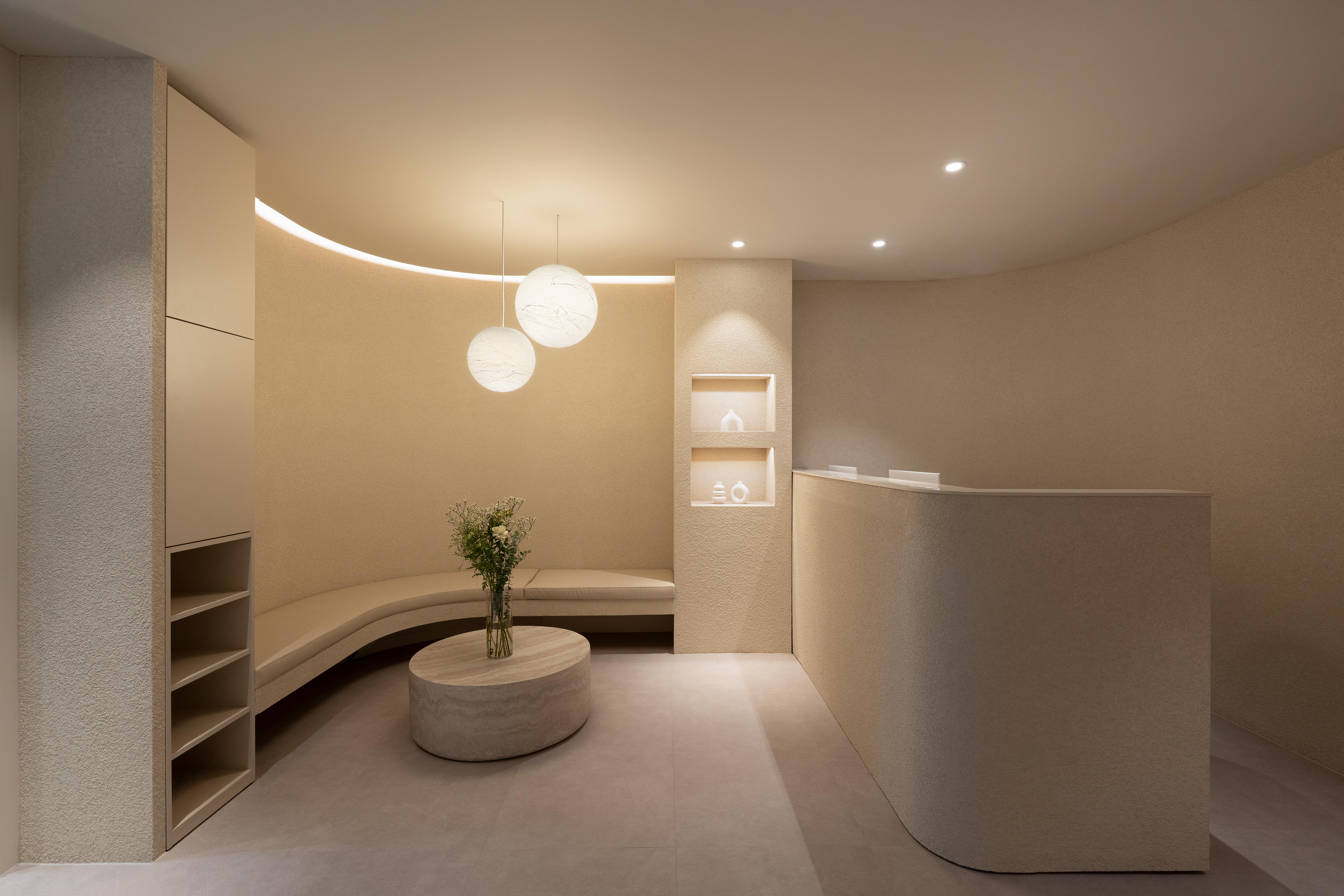 출입구에서 마주하는 라운지 공간은 벽면과 카운터 코너에 곡선을 적용해 부드럽고 유려하게 디자인했다. 벽체와 일체형으로 제작한 맞춤 붙박이 의자와 매립형 선반을 구성해 디테일을 더했고, 간접조명과 구 형태의 팬던트 조명을 레이어드해 에스테틱 브랜드의 정체성과 고급스러움을 강조했다. 벽과 카운터는 러프한 텍스처를 가진 뉴트럴한 베이지 톤의 스타코 도장으로 통일하고, 은은한 마블 패턴이 가미된 그레이지 컬러의 데코타일로 바닥을 마감하여 유려한 분위기에 자연스러움을 더했다.