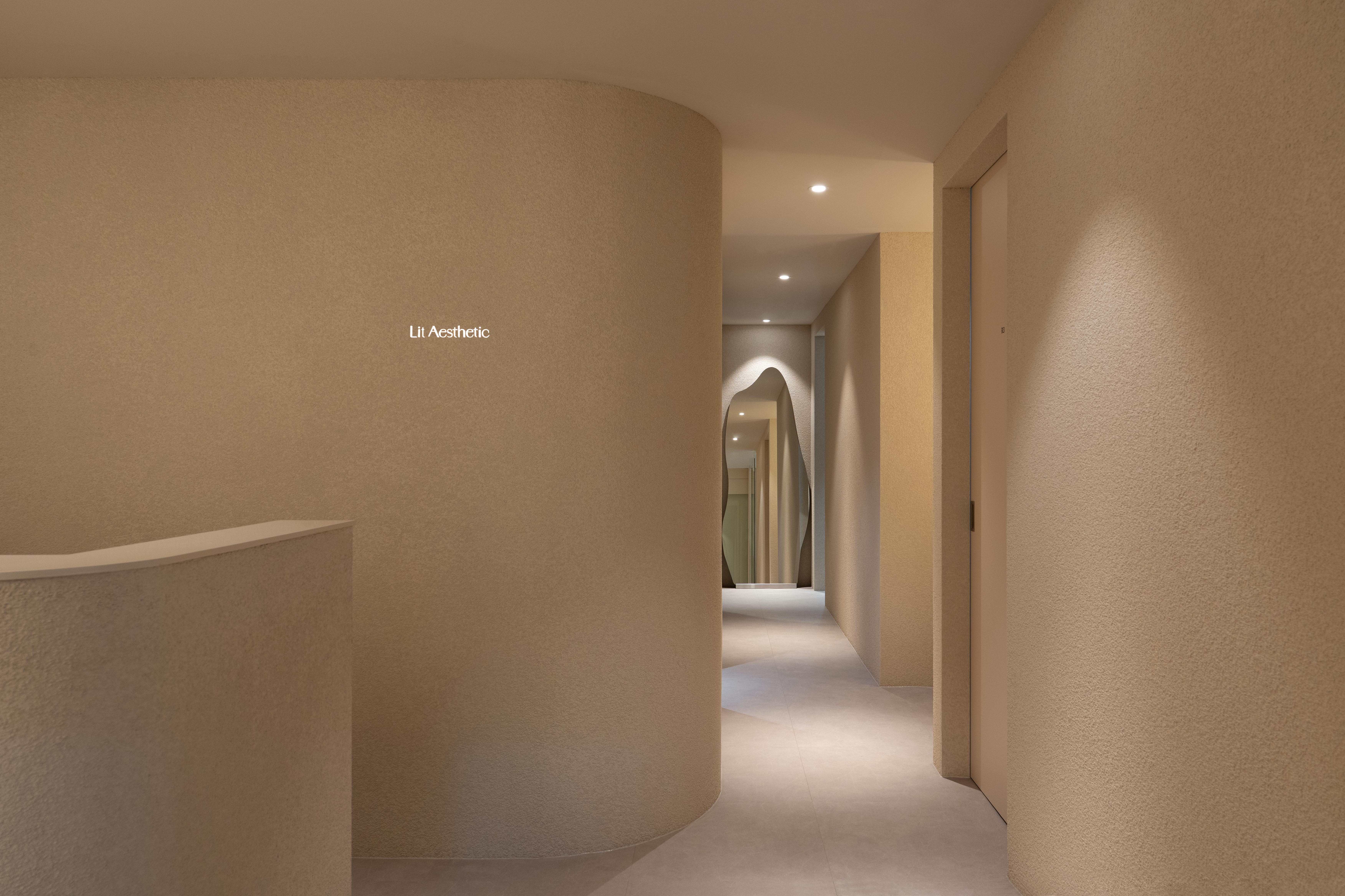 각 룸에는 소음을 최소화하기 위해 슬라이딩 도어를 설치하고, 옷장과 선반, 그리고 조명 거울을 배치해 기능성을 강화했다. 벽과 천장은 정적인 물결무늬가 연상되는 패턴의 베이지톤 벽지로 전면 마감하여, 공간을 감싸는 듯한 분위기를 조성했다. 또한 간접조명과 조도 조절 기능으로 고객의 시야 부담과 함께 시술에 몰입할 수 있는 환경을 만들었다. 파우더룸은 매립 타일 세면대로 작지만 고급스럽게 구성하고, 천장까지 이어지는 대형 거울과 간접조명을 더해 공간을 확장했다. 복도 끝에는 스탠드형 비정형 거울을 설치하여 시선을 유도하고, 곡선과 비대칭적인 구조, 그리고 간접조명의 다운라이트로 입체감과 조형감을 부여했다. 기능성과 아름다움, 그리고 심리적인 안정감을 조화롭게 담아낸 릿에스테틱은 단순한 뷰티 케어를 넘어 일상 속 작은 휴식을 선사하는 공간이다.