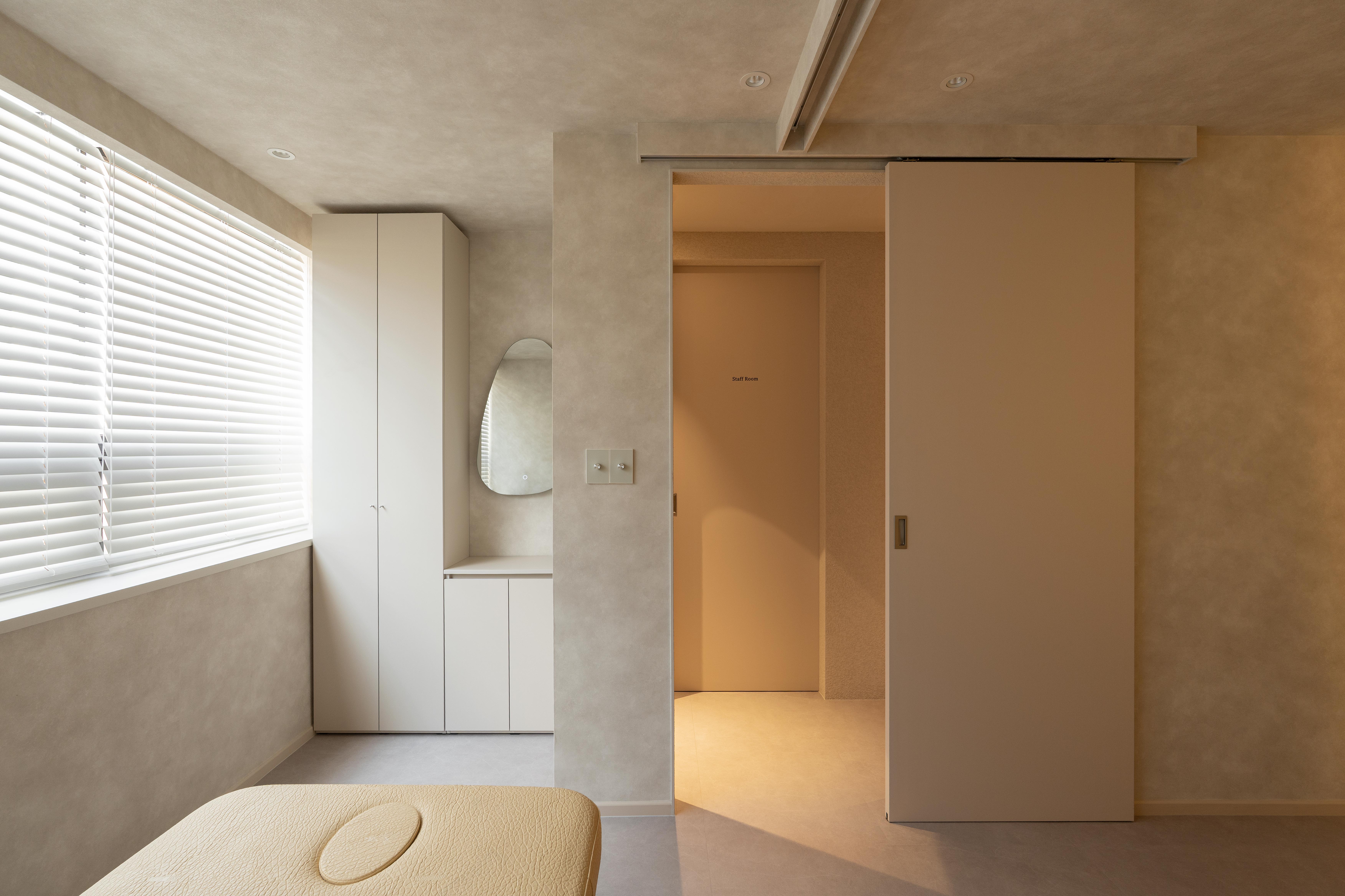 상담실의 출입문은 유리도어로 설치하고, 라운지와 동일한 스타코 도장 마감으로 전반에 일체감을 유지하며 두 공간의 경계를 자연스럽게 연결했다. 또한, 상담실 한쪽 벽의 와이드한 붙박이 하부장과 매립 선반, 그리고 간접 조명을 통해 실용성과 미감을 확보했다. 은은하고 부드러운 빛이 유리도어를 통해 새어나오며 감각적인 디스플레이 효과를 연출하고, 통일된 분위기 속 정제된 디자인을 의도했다. 케어실은 최소한의 동선을 기반으로, 제한된 공간 내에서 필요한 모든 실을 효율적으로 배치했다.