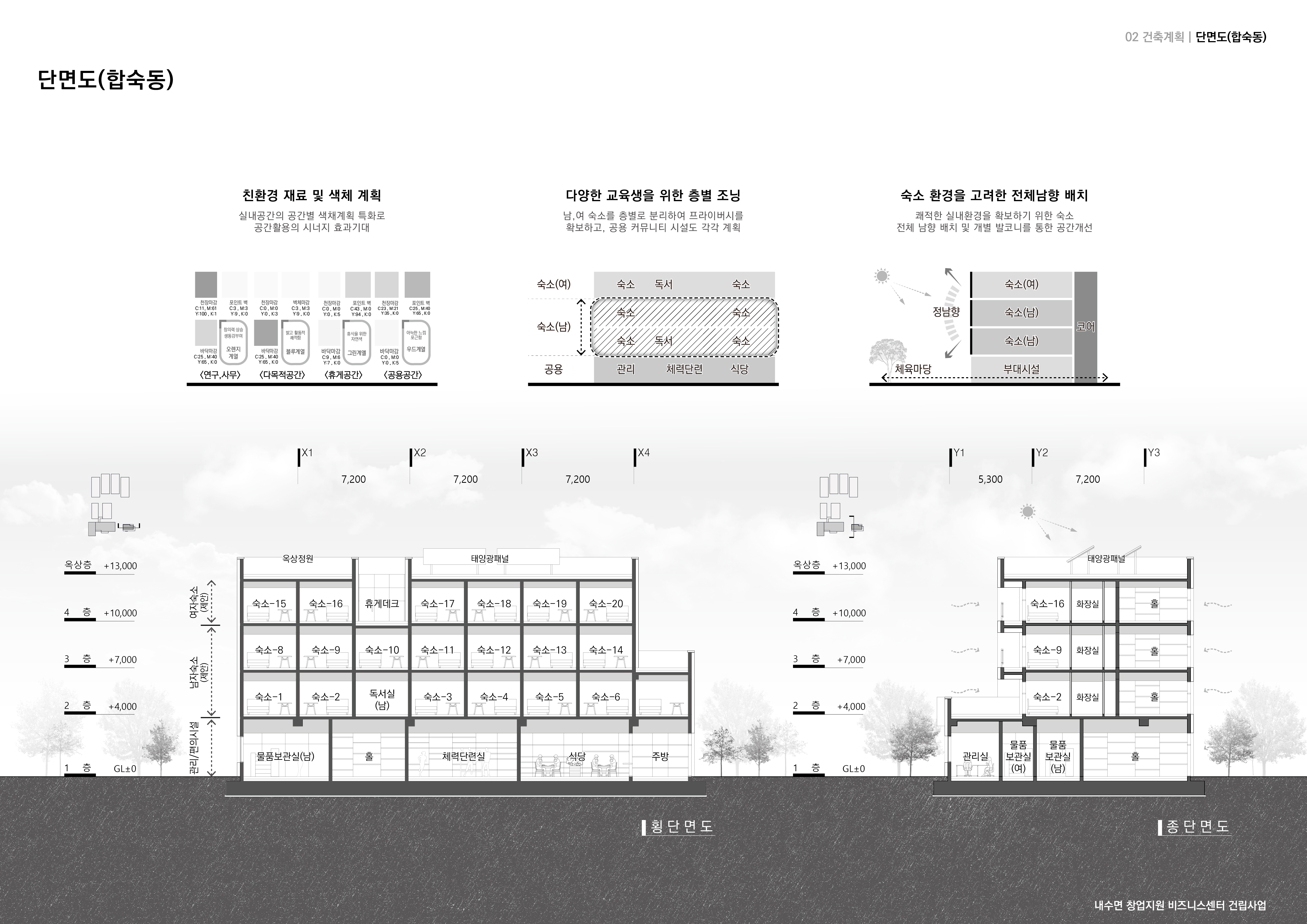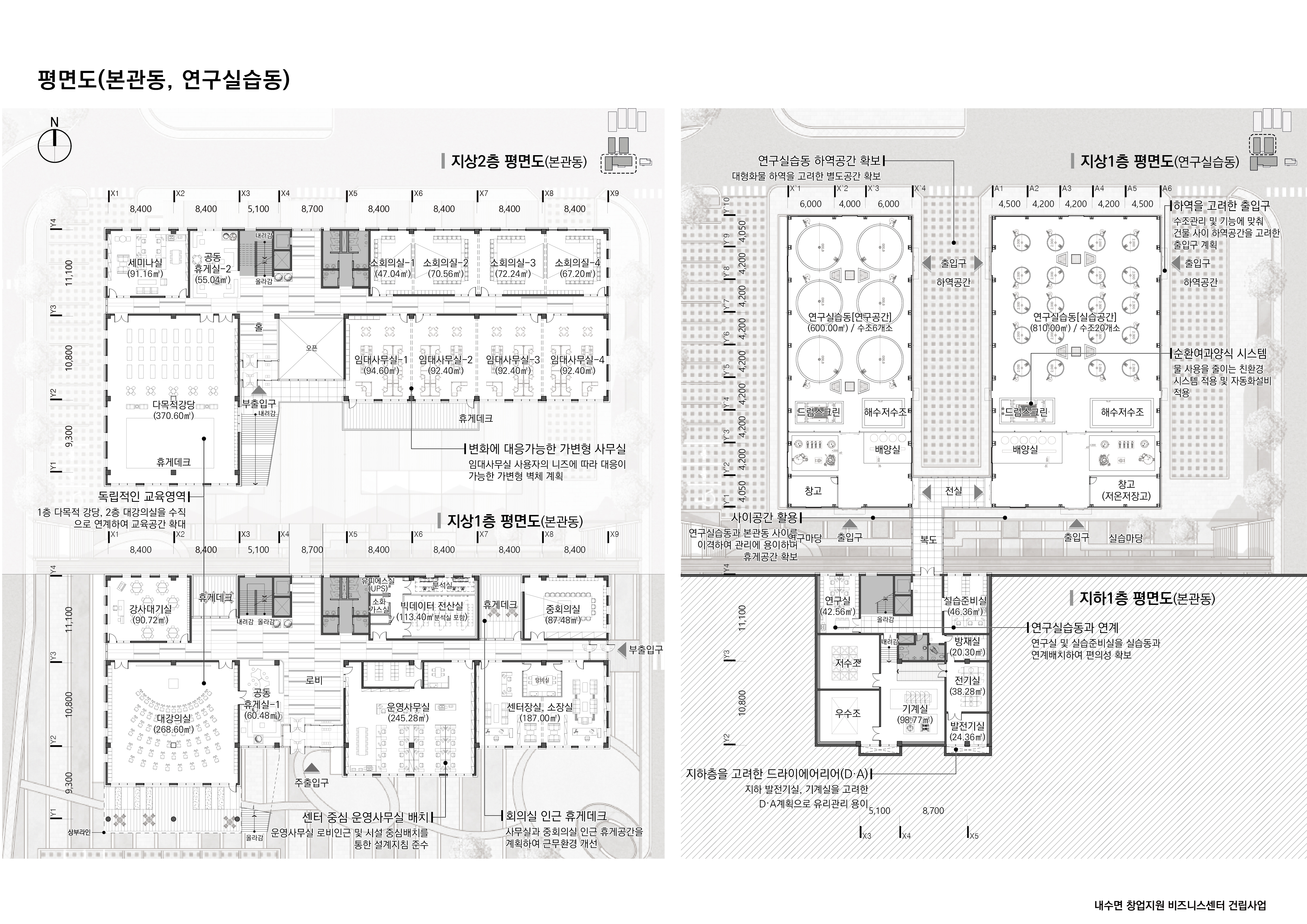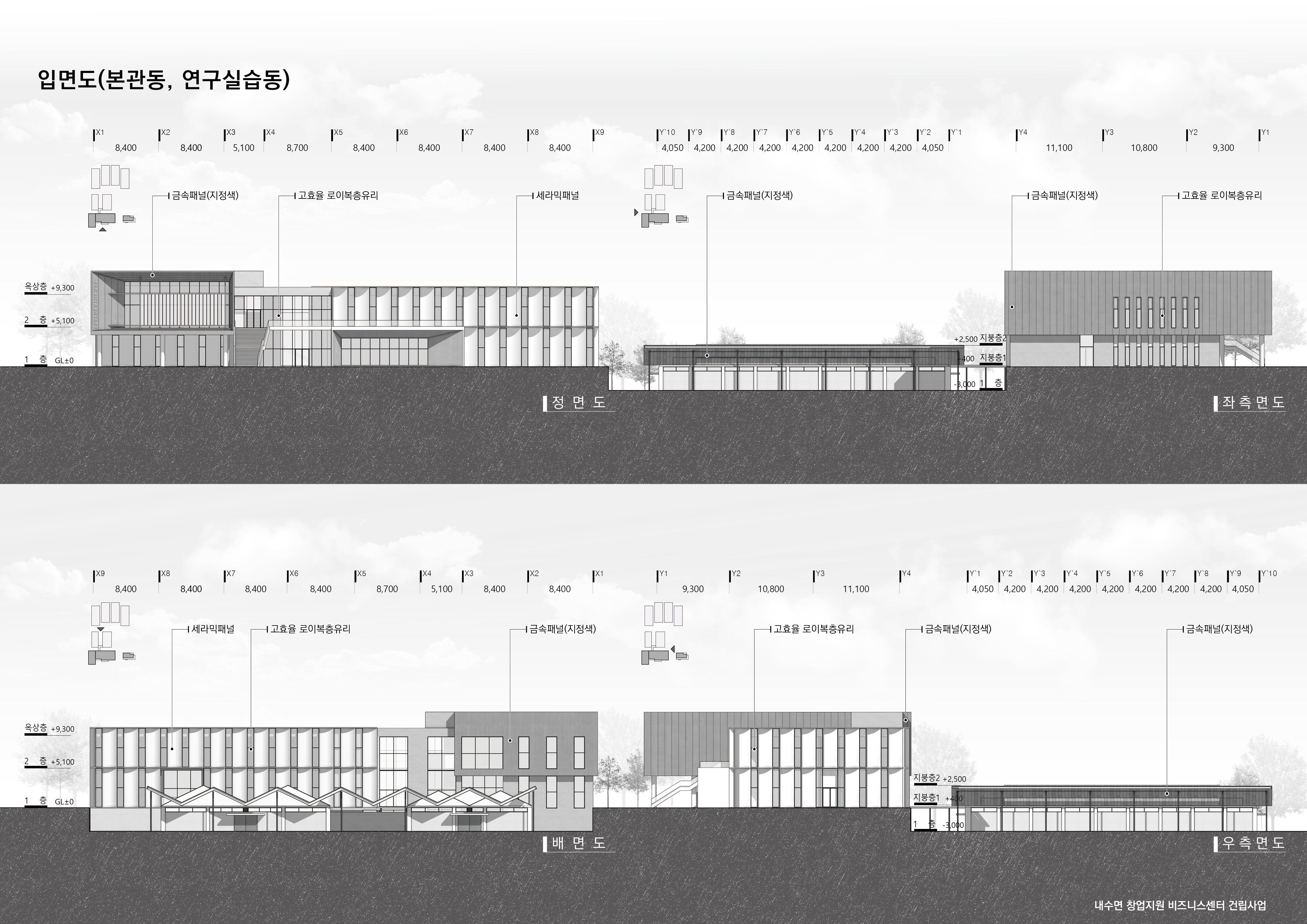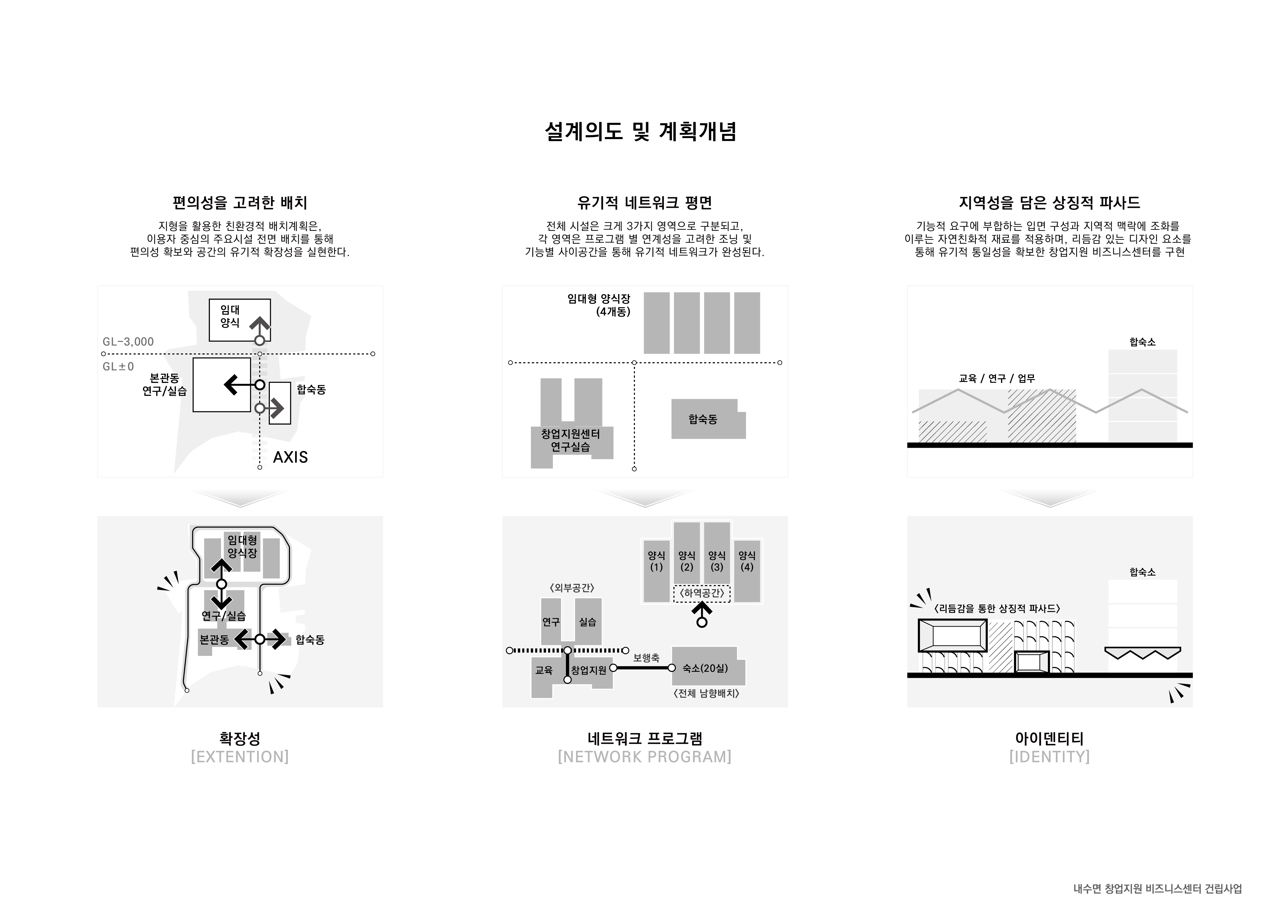 기능적 요구에 부합하는 입면 구성과 지역적 맥락에 조화를 이루는 자연친화적 재료를 적용하며, 리듬감 있는 디자인 요소를 통해 유기적 통일성을 확보한 창업지원 비즈니스센터를 구현한다.