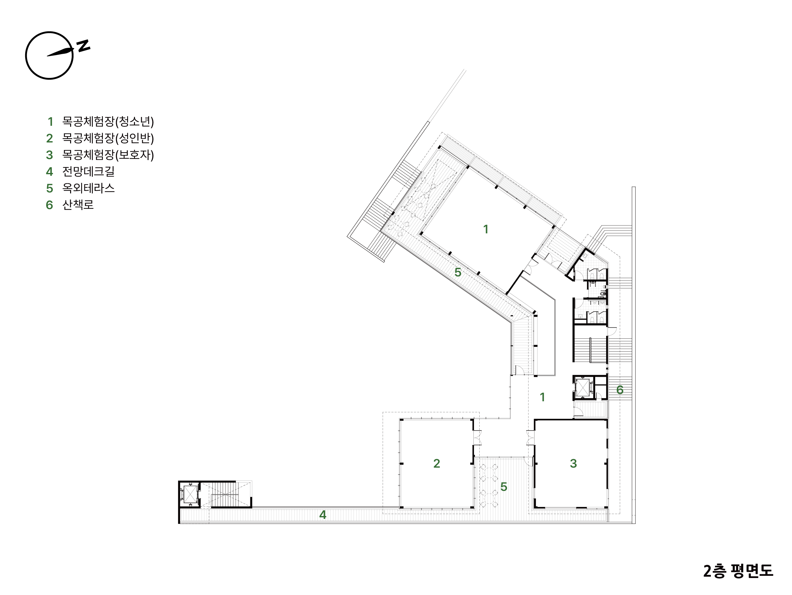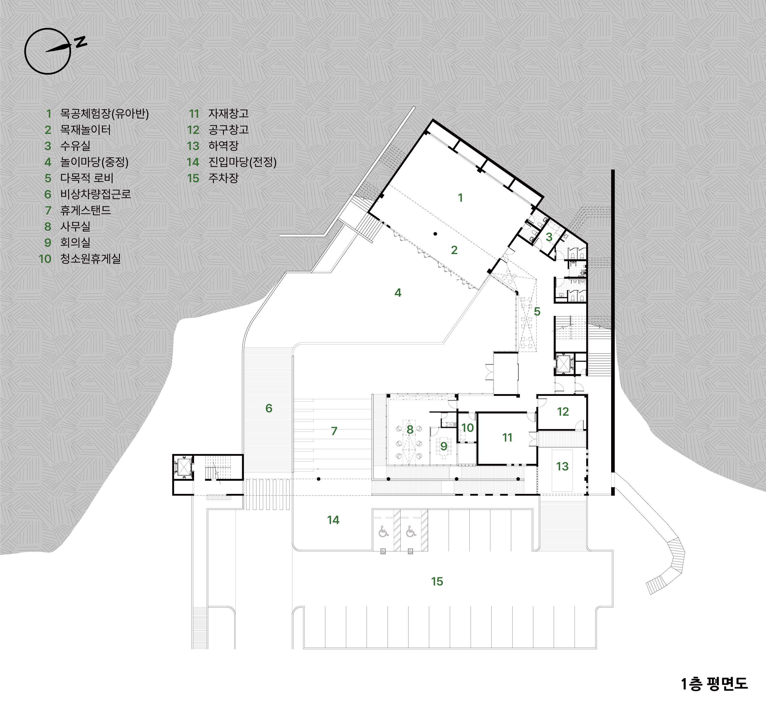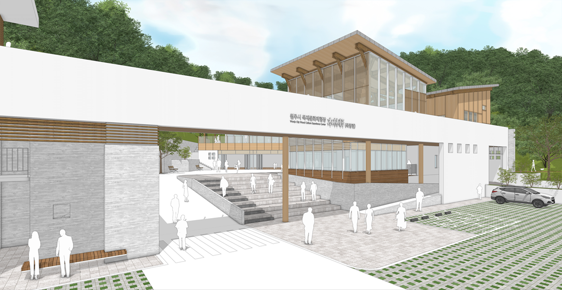 원주 목재문화체험장은 공원과 유기적으로 연결된 개방적인 공간을 조성하여 자연환경을 적극적으로 수용하였다. 방문객의 편리한 접근을 위한 동선 계획을 수립하여 공공성을 확보하였으며, 각 프로그램에 부합하는 이용자 중심의 실내외 공간 연계를 통해 기능적인 목재문화 체험 환경을 구현하였다. 더불어, 기존 대지의 특성을 살린 배치 및 입면 계획을 통해 원주의 상징적인 문화체험 공간으로 자리매김할 수 있도록 설계되었다.