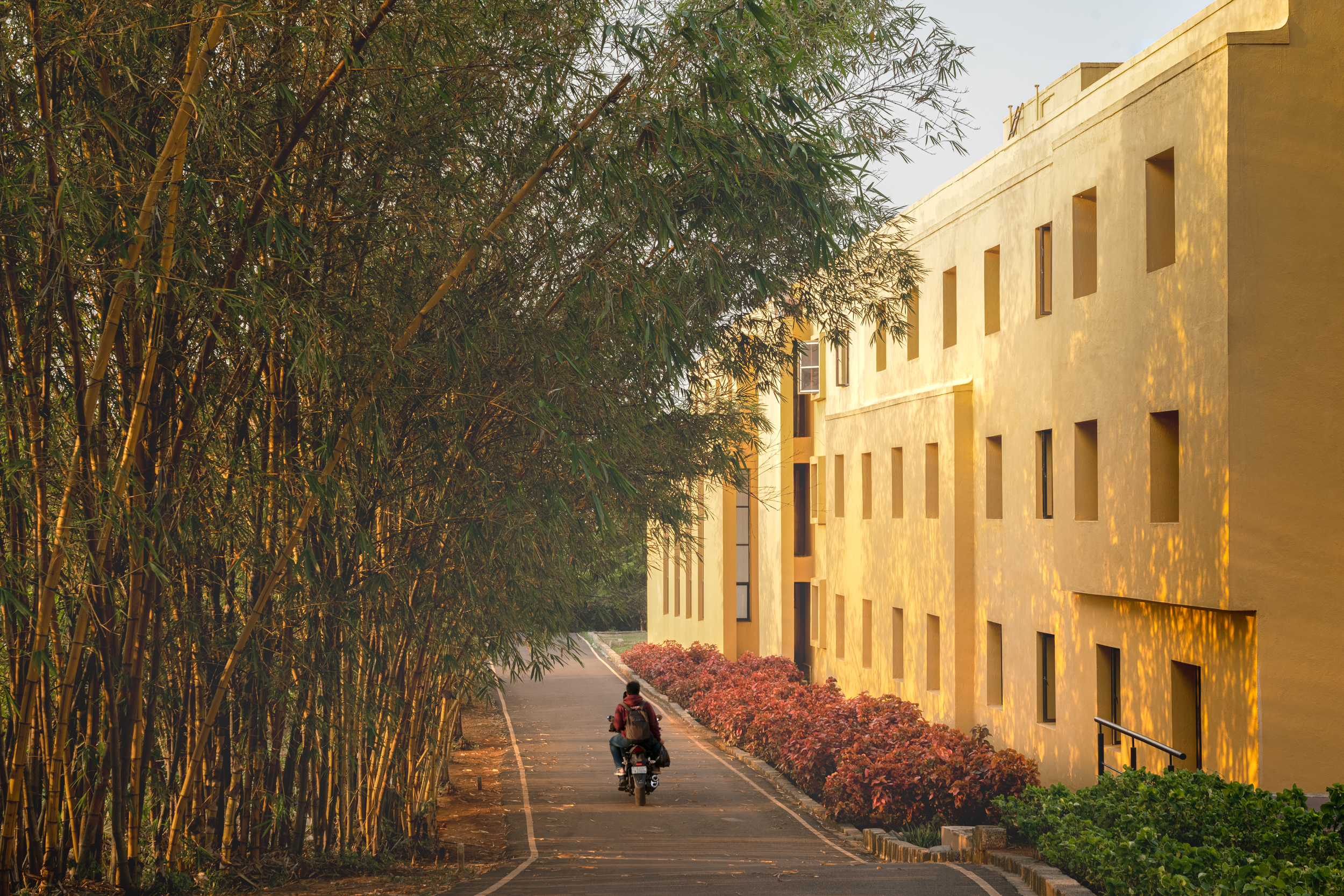 캠퍼스의 핵심에는 학사동(Academic Block) 이 위치한다. 방문객이 처음 마주하는 이 건물은 집회, 행진, 학생 교류가 이루어지는 대형 광장을 중심으로 구성된다. 높은 포털이 열린 중정으로 이어지고, 그 너머로는 주변 산맥이 프레임처럼 펼쳐진다. 중정을 둘러싼 교실, 교수실, 회의실, 학장실 등은 오픈 테라스와 휴식 공간을 두어 자연 속에서의 사색과 교류를 가능하게 한다.