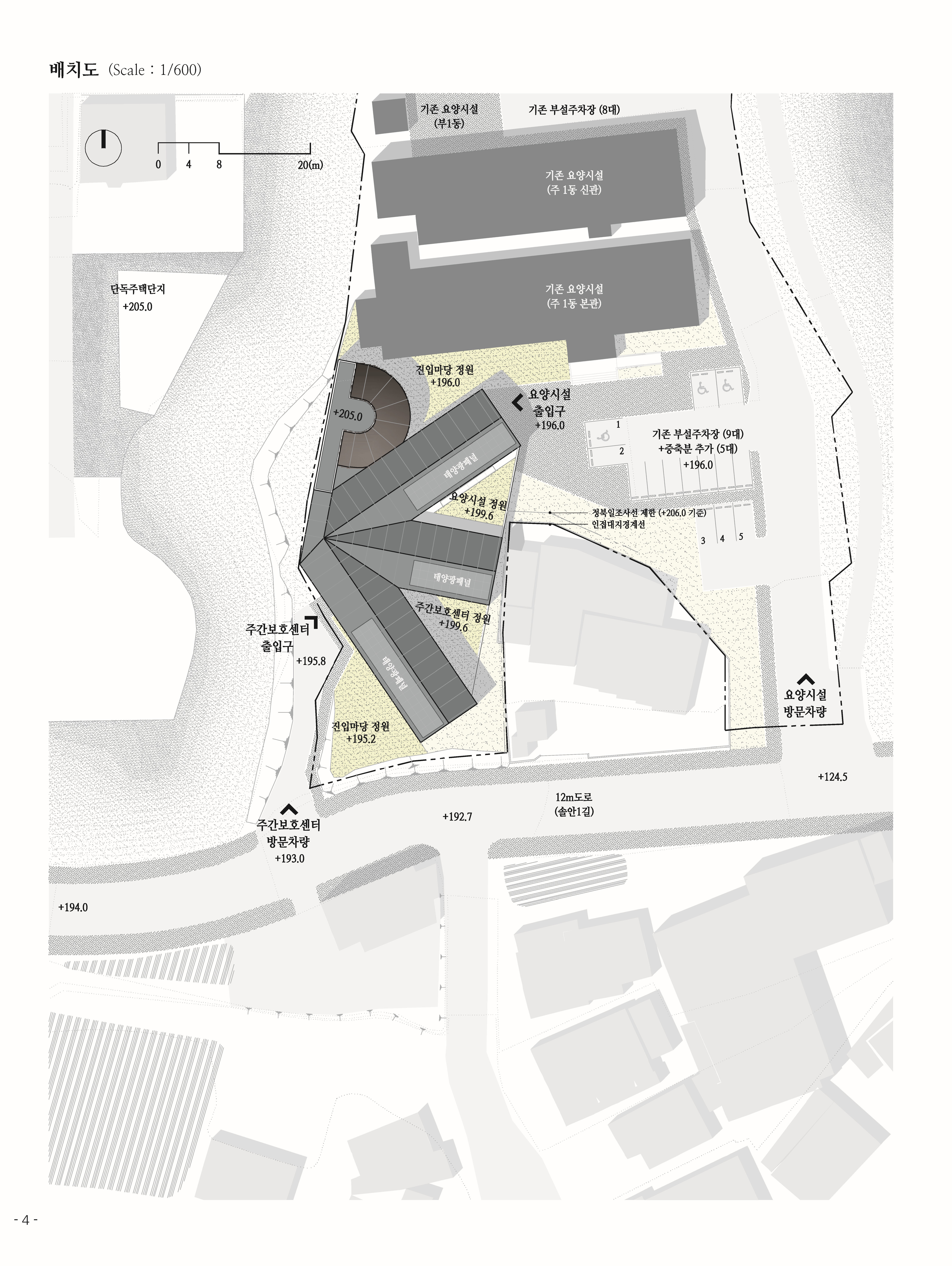 펼쳐진 각 날개 사이에는 성격이 다른 4개의 정원이 배치된다. 먼저 삼각형 모양의 사이공간은 1층 주간보호센터와 2층 요양시설을 위한 정원이다. 일반적으로 치매노인 요양시설은 교외의 자연 속에 위치하더라도 통제상의 어려움으로 야외활동이 제한된다. 하지만, 삼각형의 정원은 건물이 자연스럽게 울타리를 이루는 중정형 구조이기에 안전하게 야외활동을 즐길 수 있다. 특히 2층의 테라스는 유사시 비상대피공간으로도 활용할 수 있다. 바깥쪽의 2개의 정원은 출입구와 면해 있어 진입마당의 역할을 하는데, 북측의 사이공간은 기존 건물과 본 건물의 완충공간으로서 기능하기도 한다.