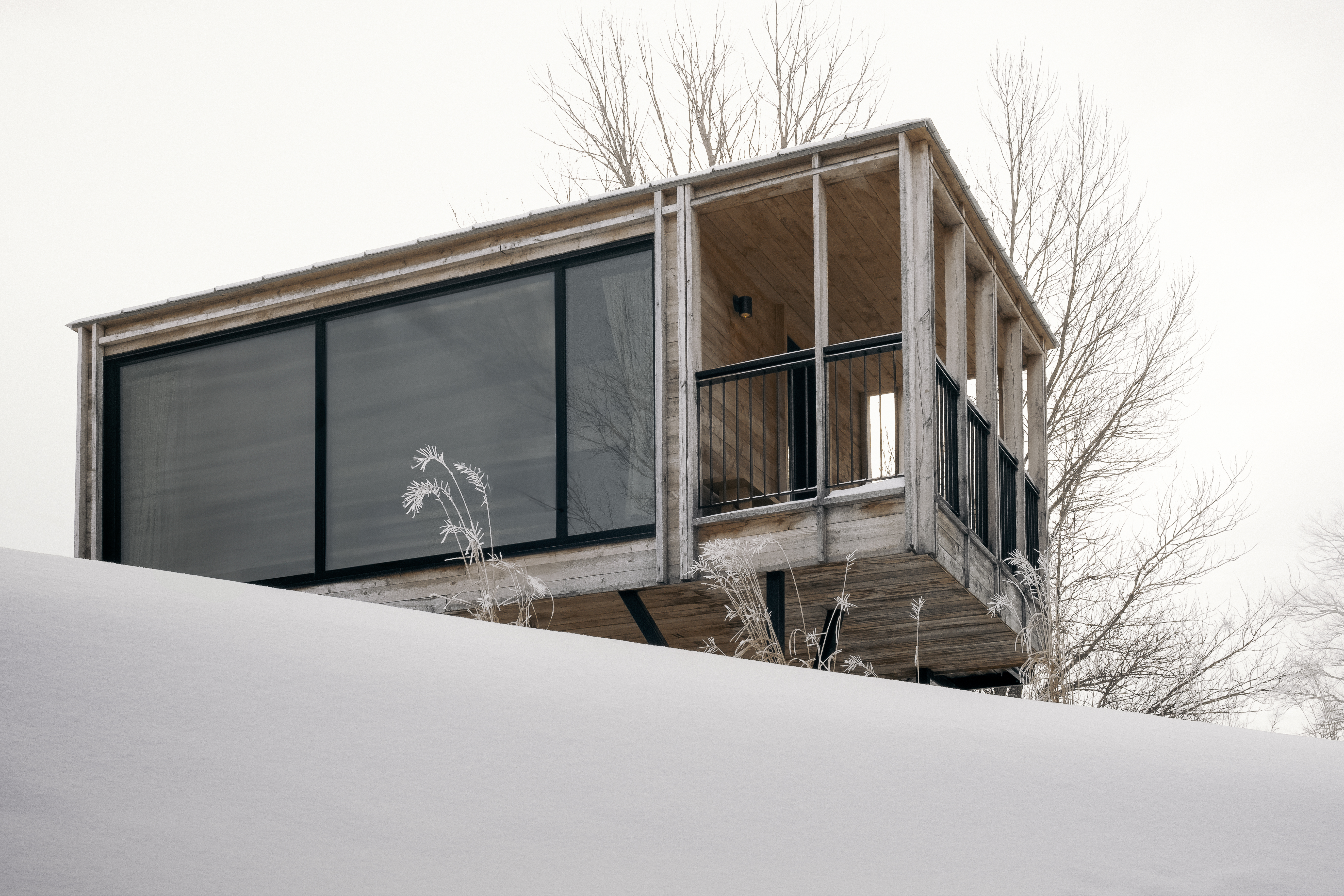 면적 약 50㎡의 이 주택들은 정교하게 마감된 낙엽송 외장재 와 간결한 선형미, 선명한 기하학적 형태로 돋보인다. 대부분의 부재는 몬트리올 북쪽에서 사전 제작 되어 현장에서 조립되었으며, 이는 자연과 조화롭게 살아가는 삶의 예술을 세련되게 재해석한 결과이다.
