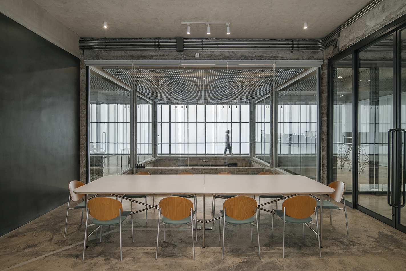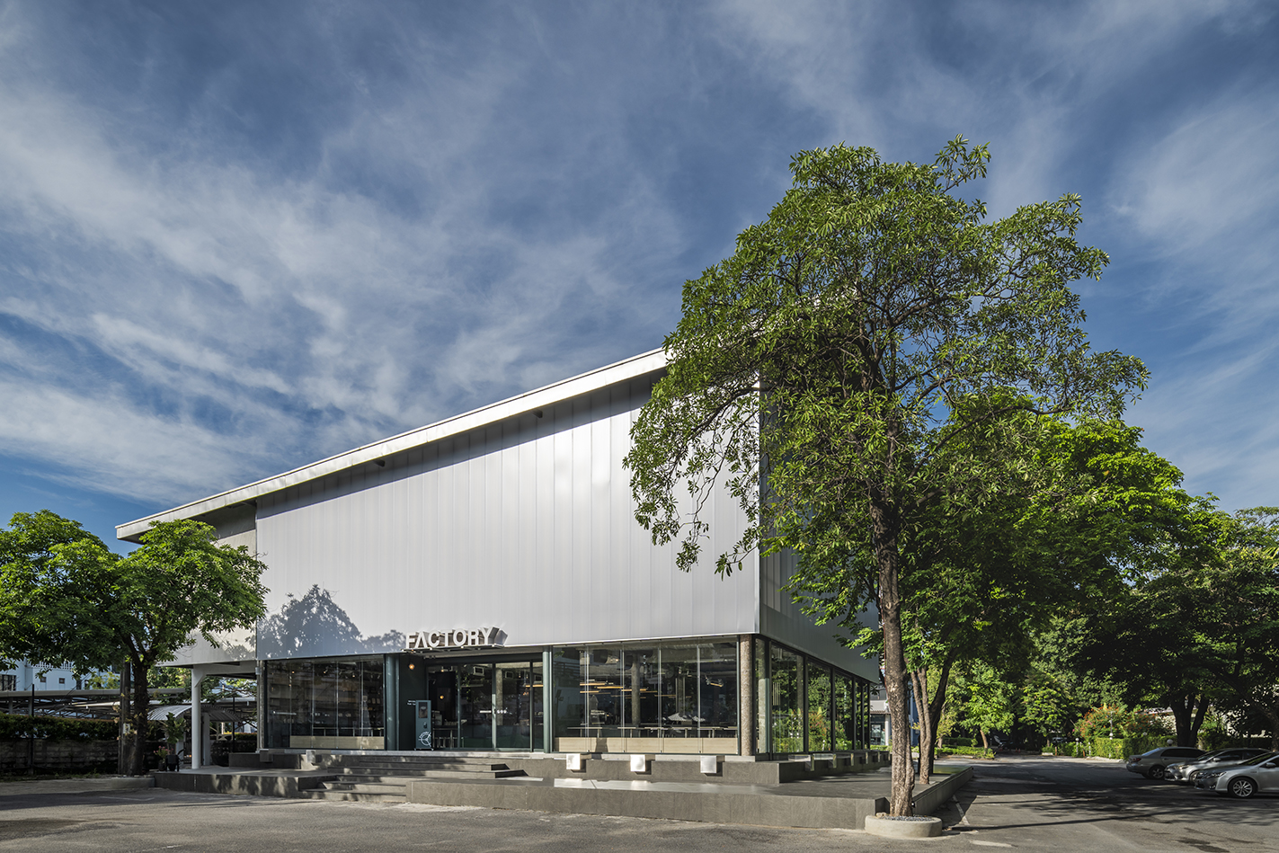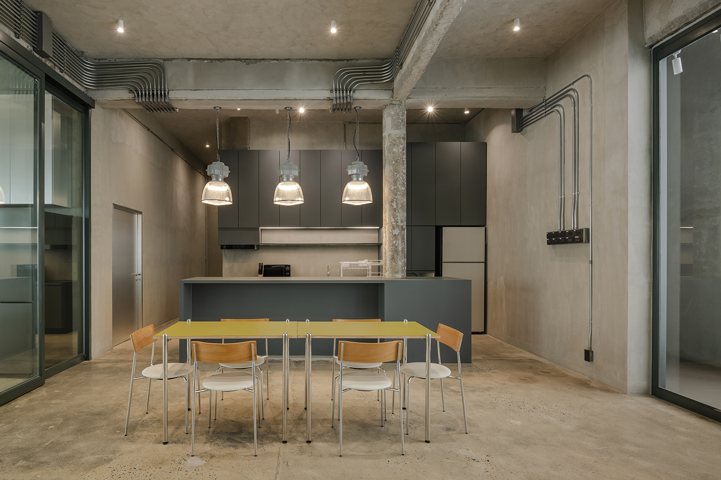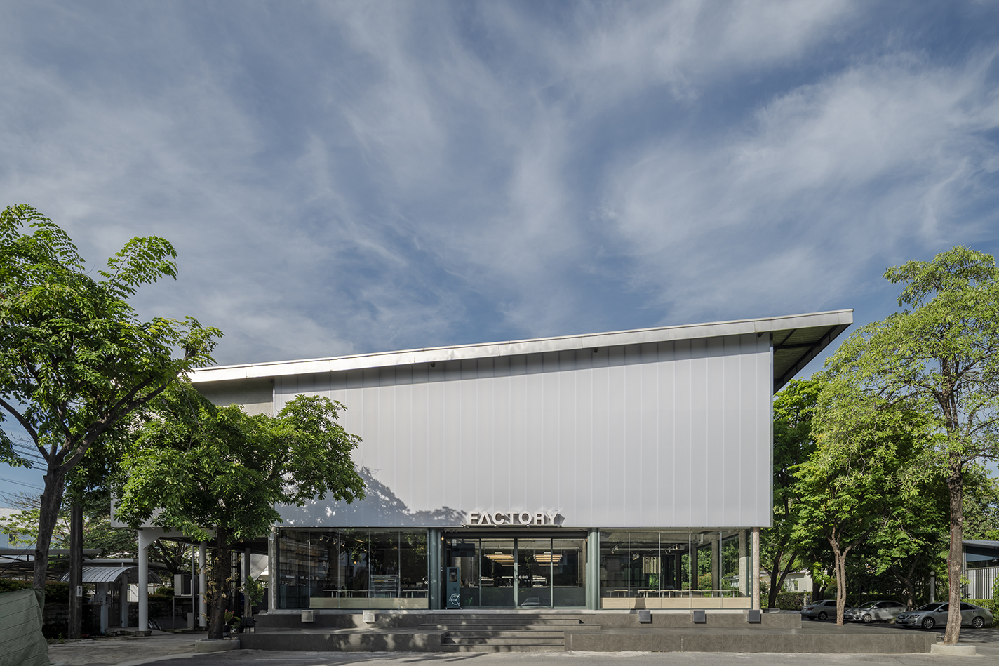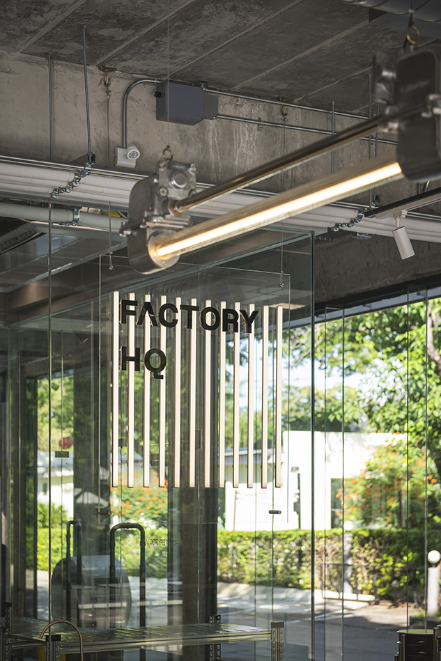 팩토리 HQ는 산업공장의 미학에서 영감을 받아, 노출된 재료와 현대적 디자인 요소를 조화롭게 결합한 공간이다. 중심에는 효율적인 동선을 고려한 카운터 바가 자리하며, 그 뒤편에는 유리벽으로 둘러싸인 로스팅실이 있어 고객이 커피 로스팅 과정을 직접 볼 수 있다. 이 개방적인 구조는 브랜드의 핵심인 ‘Factory’ 아이덴티티를 강조하며, 그린 포인트 컬러와 콤팩트 라미네이트 소재를 통해 견고하고 진정성 있는 분위기를 구현했다. 또한, 폴리카보네이트 패널을 통해 자연광이 부드럽게 유입되어, 에너지 효율을 높이면서도 밝고 환기된 공간감을 완성한다.