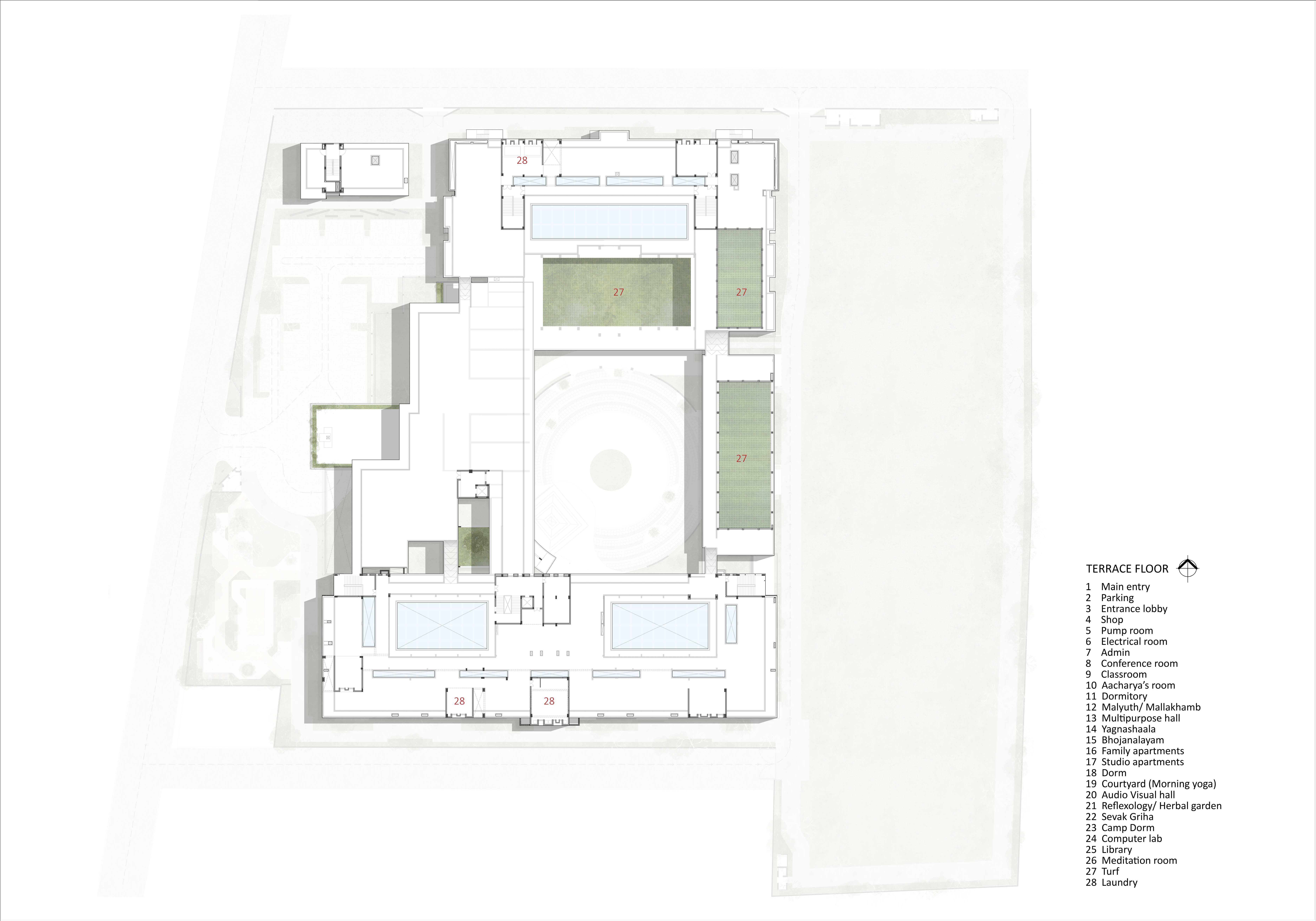 입구에는 접수처, 사히트야 니디(도서관), 비디야 니케탄(학습 센터)이 각각의 정원과 함께 배치되었다. 사바 만답(다목적 홀)은 강연, 문화 활동, 교육 프로그램을 위한 공간으로 활용된다. 또한, 중앙에 위치한 잘 네띠(비강 세정) 공간, 명상 홀(디얀 그루하), 방문객을 위한 기숙사(시비르 니바스), 거주 지원 직원의 숙소(세바 그루하) 등의 시설이 추가적으로 마련되었다. 이러한 보조 기능들은 전체적인 조화를 해치지 않으면서도 공간이 본래의 목적을 수행할 수 있도록 돕는다.