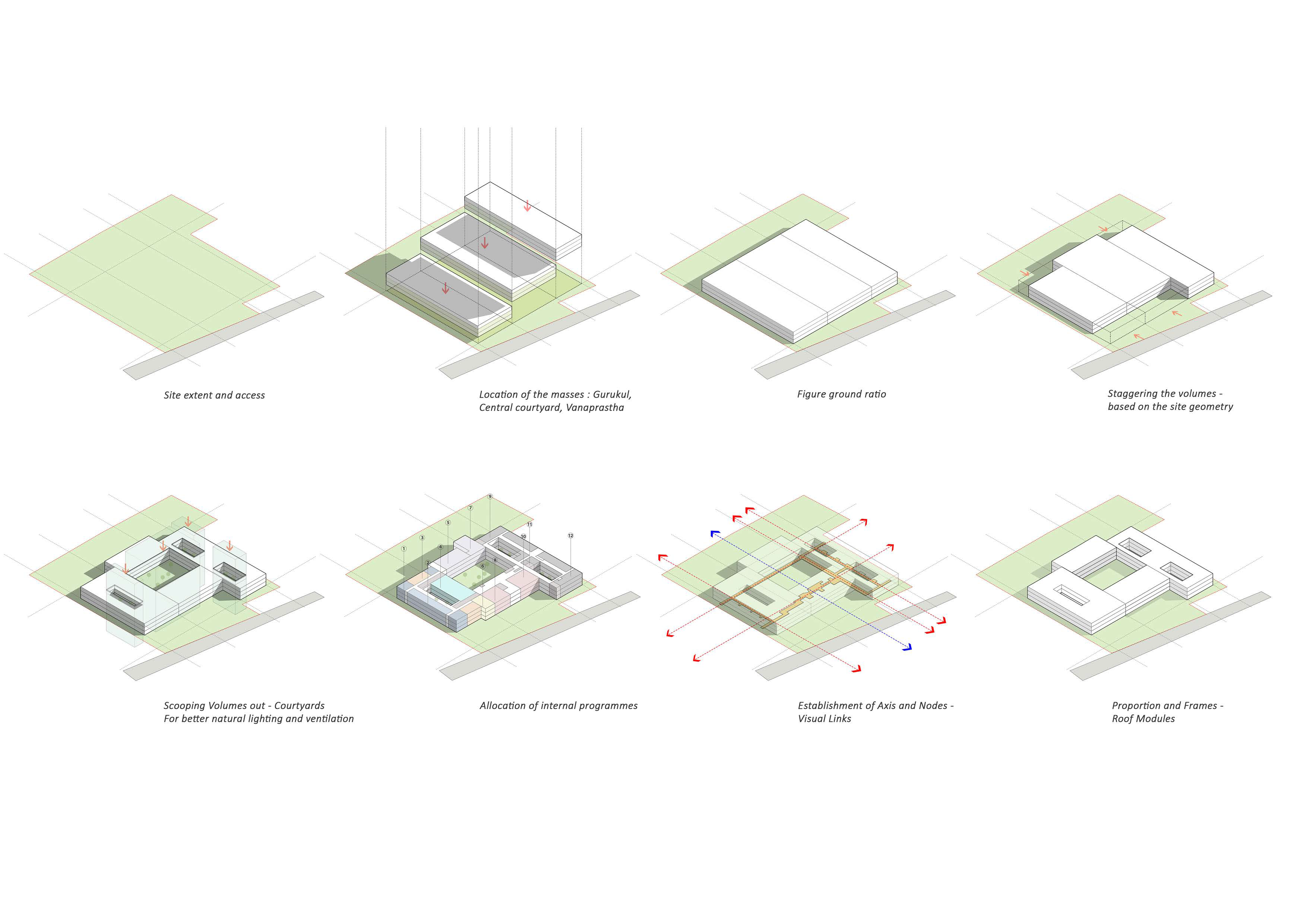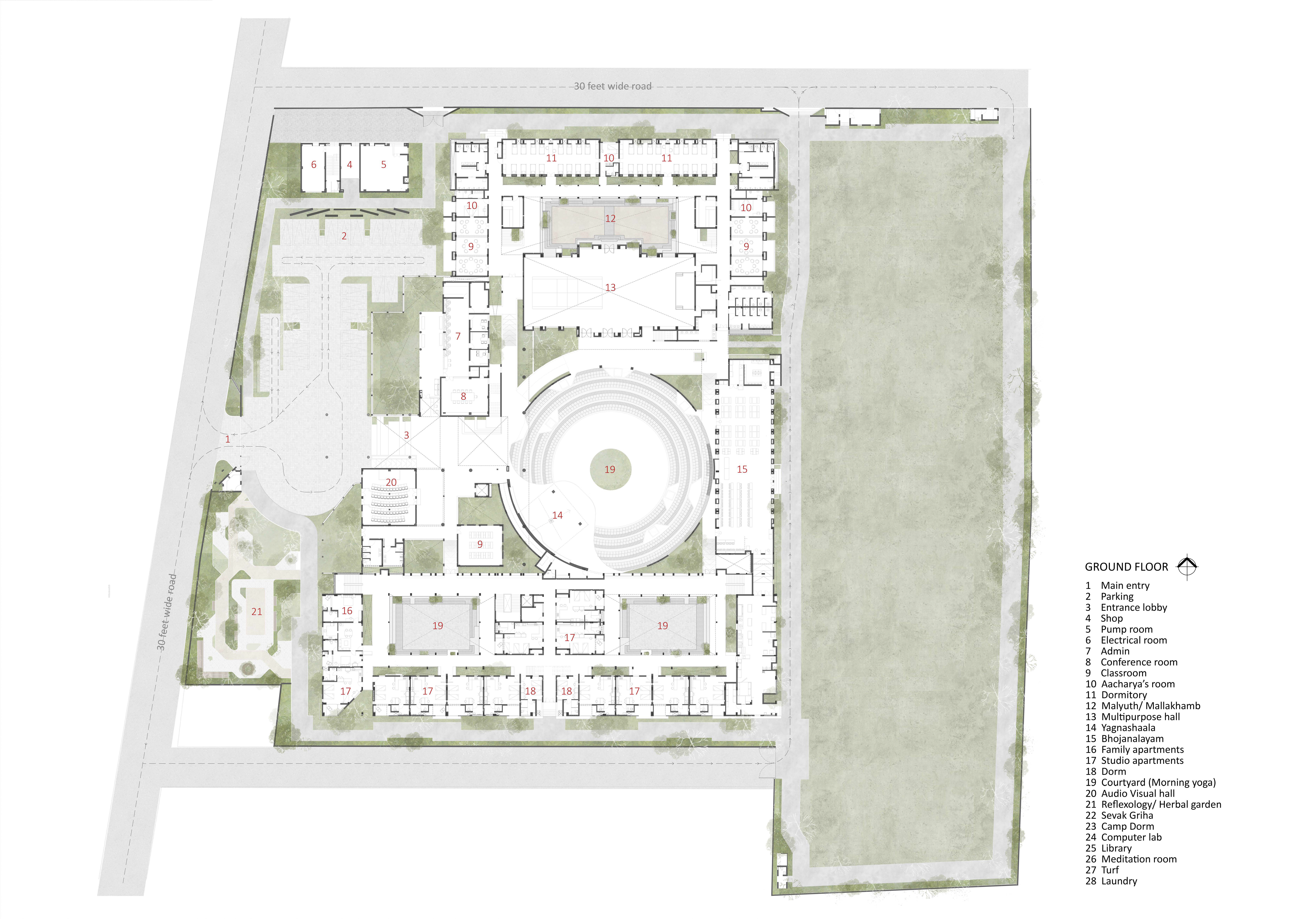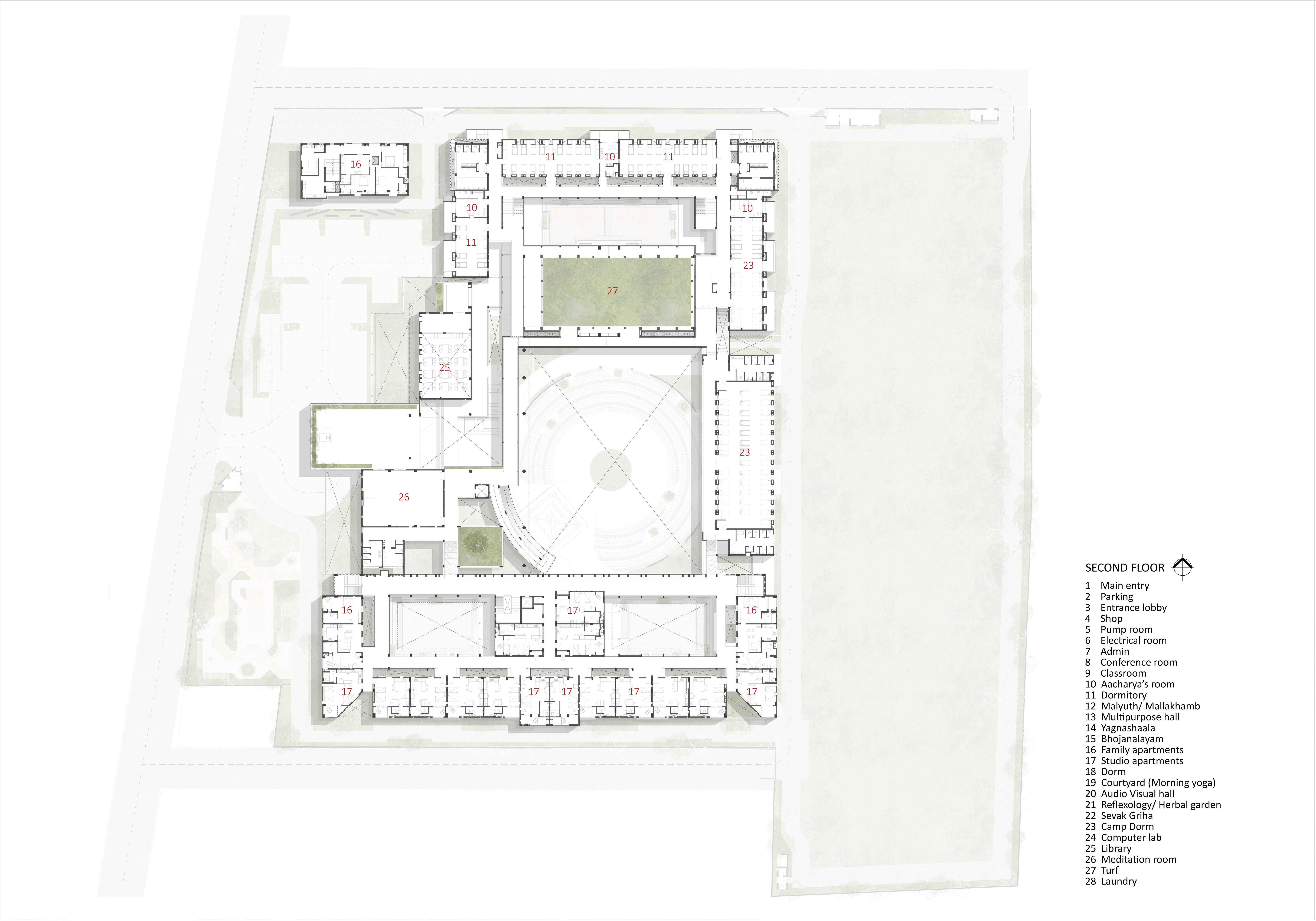 전통적인 인도 교육 방식인 구루(스승)-시샤(제자) 관계를 되살리며, 이곳의 구루쿨은 지적·영적 성장을 위한 수도원과 같은 역할을 한다. 반개방형 구조로 설계되어 실내와 실외의 경계를 허물어 유동적인 공간에서 자연스럽게 명상을 할 수 있도록 유도한다.