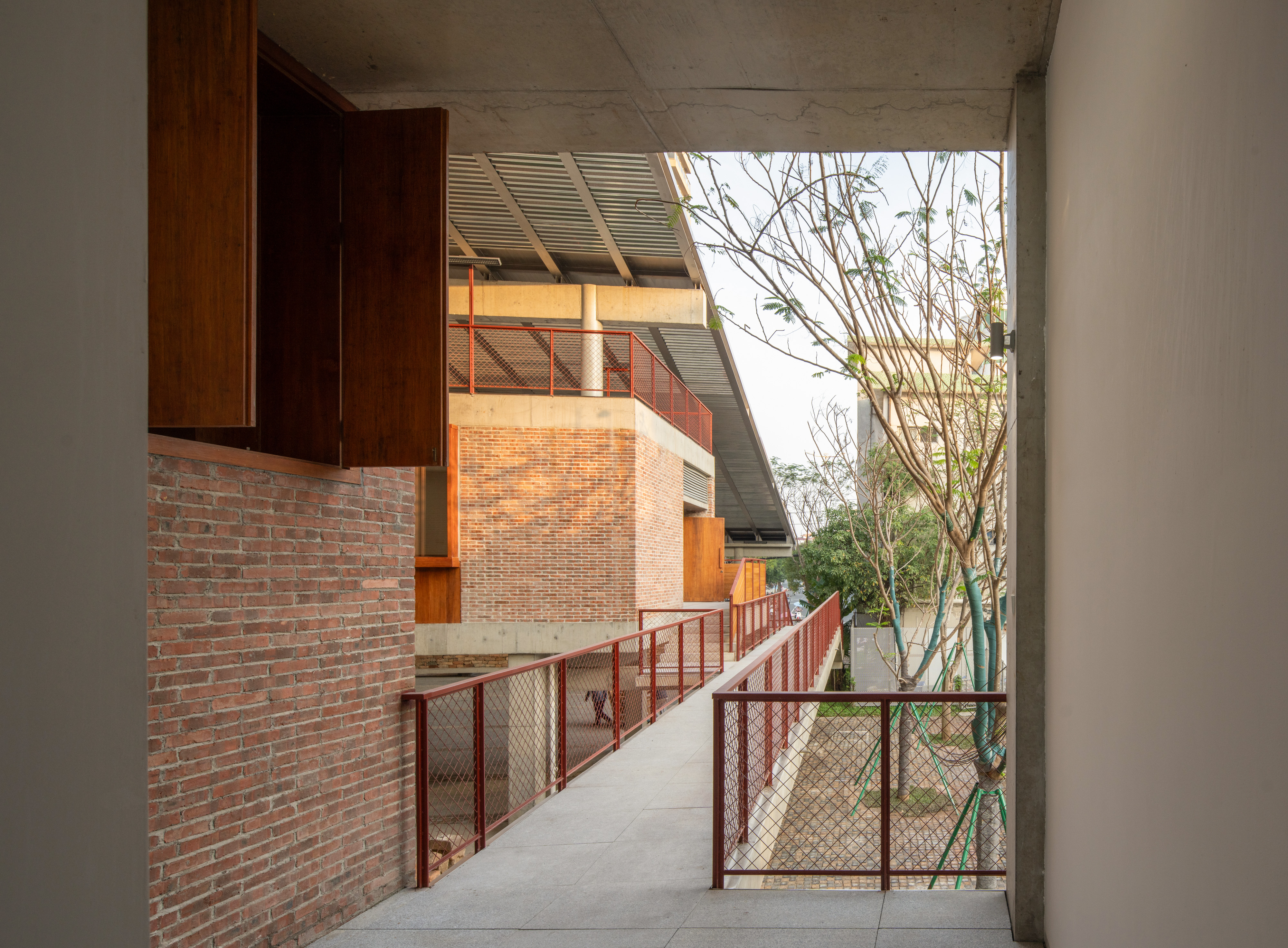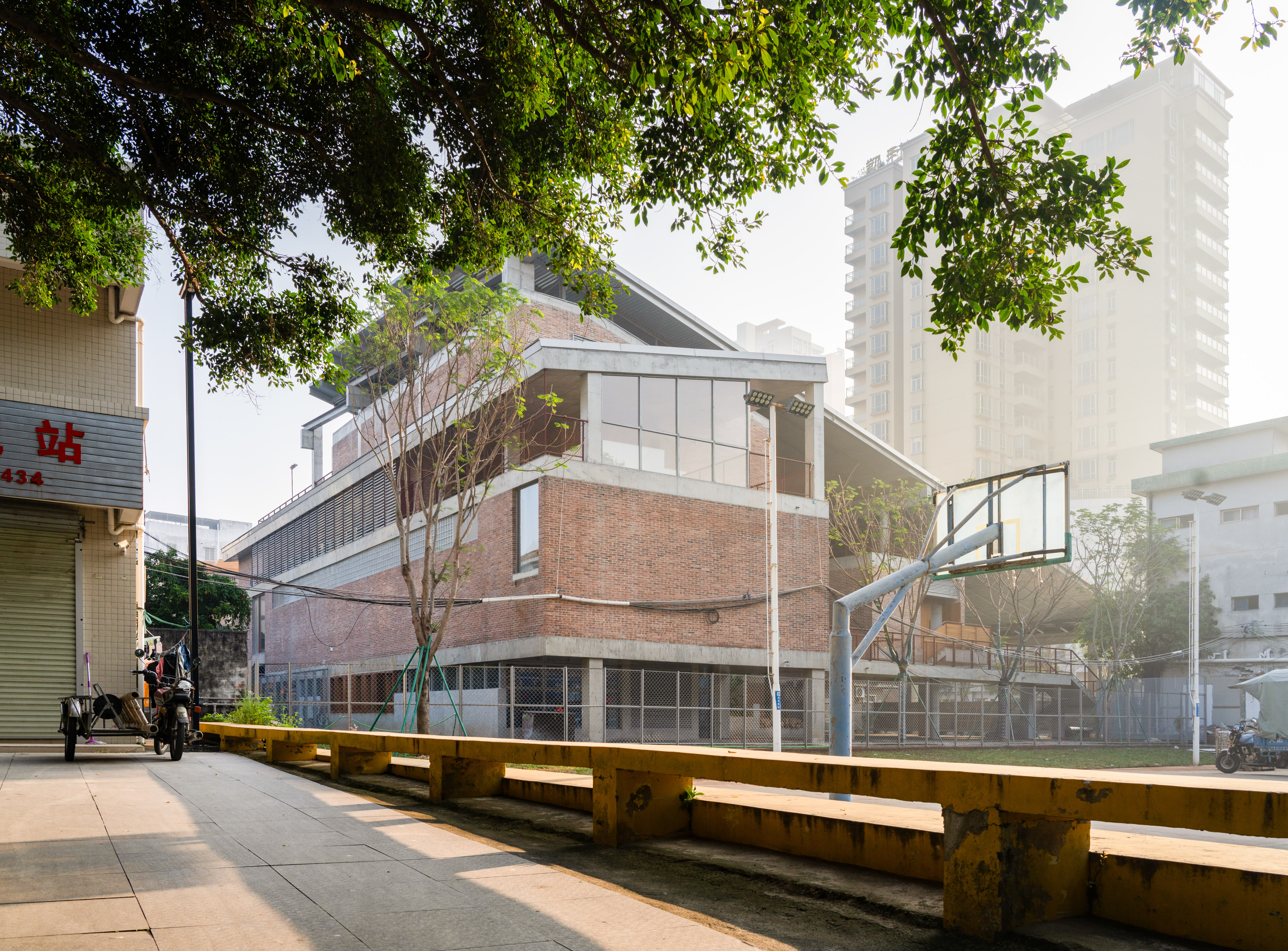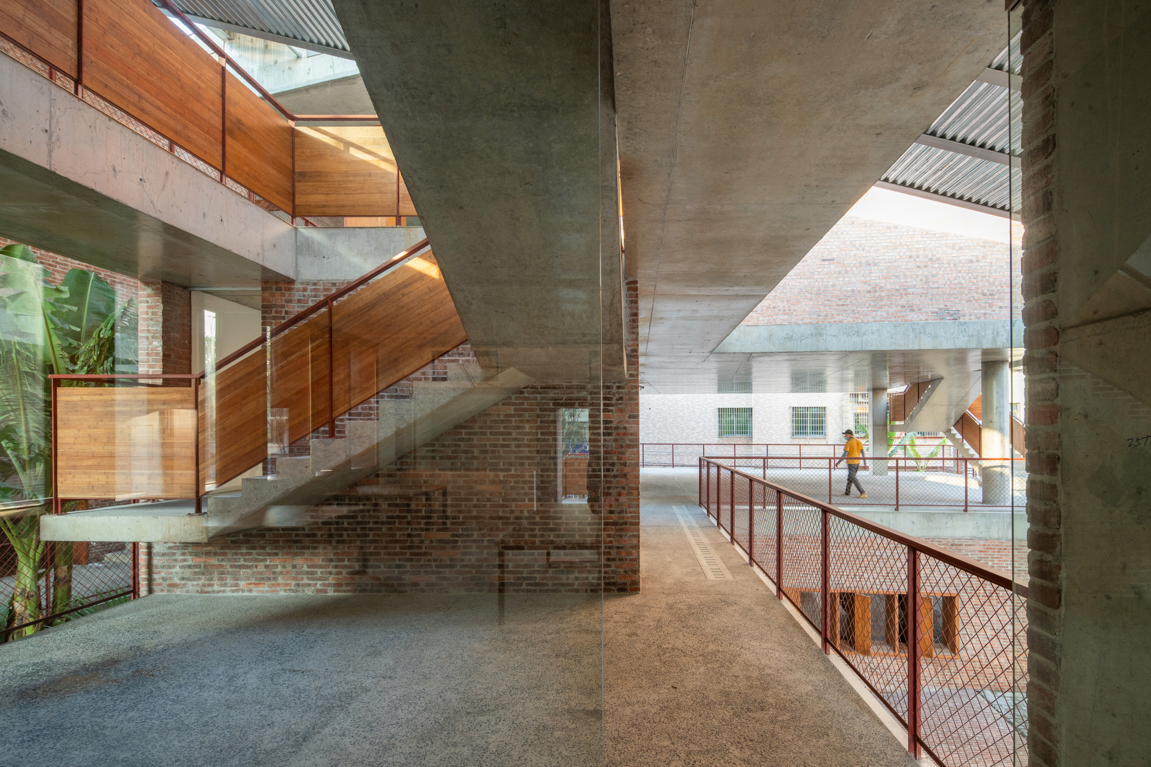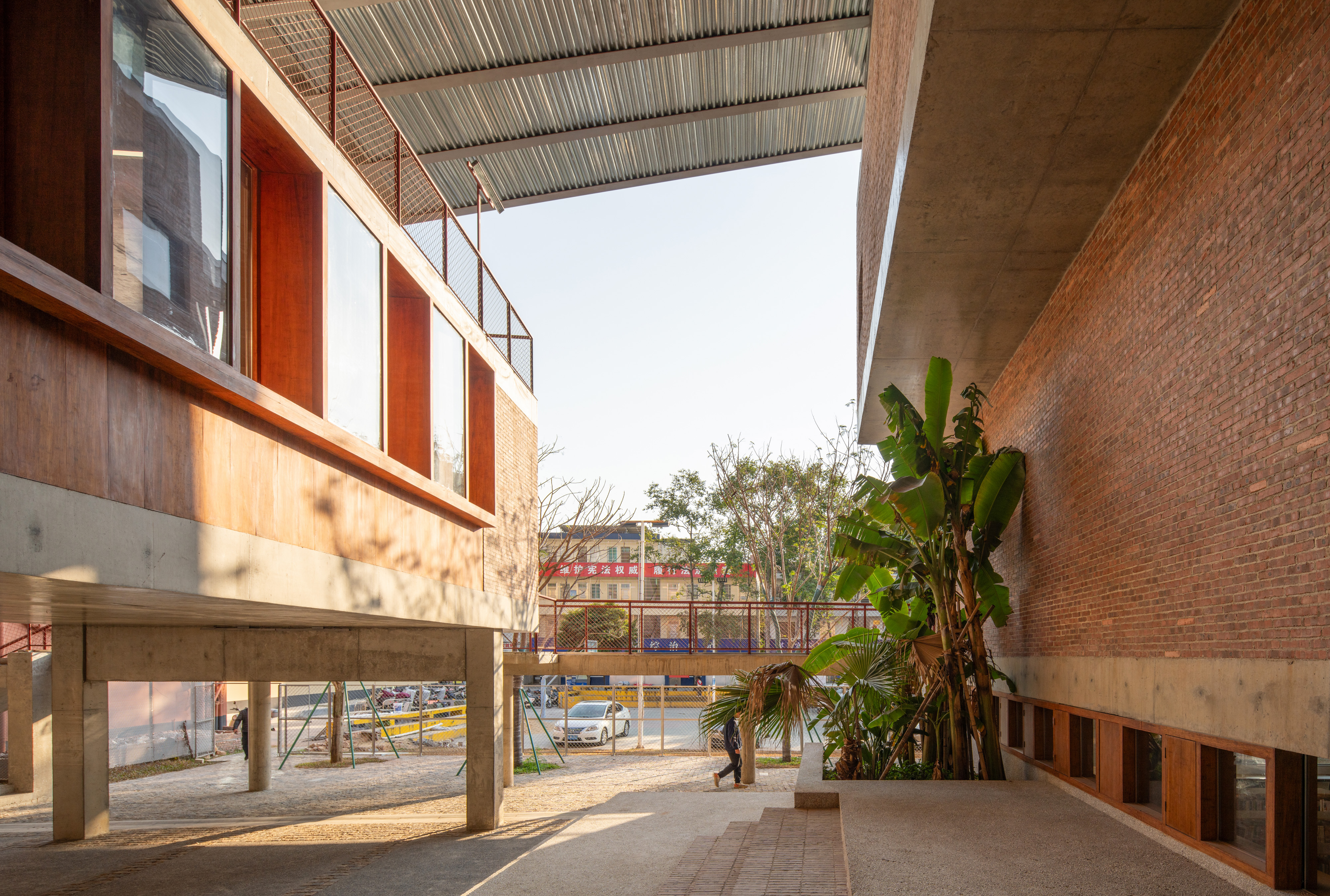건축적으로는, 동서 방향 경계에 맞춰 16도 기울기의 이중 단일 경사 지붕을 적용했다. 기능 공간들은 마을 경계를 따라 L자 형태로 밀도 있게 배치되어 있으며, 이로 인해 동측에는 자연스러운 ‘바람 통로’가 형성되어 해안과 연결되며 효과적인 환기를 돕는다. 이 공간들을 하나의 넓은 처마 아래 통합하고, 천장 높이에 변화를 둔 반야외 복도를 통해 유기적인 연결감을 확보했다. 바닷바람은 이 처마 아래로 자유롭게 흐르며, 마치 ‘창을 열어 바람을 맞는 듯한’ 상쾌한 공간감을 자아낸다.