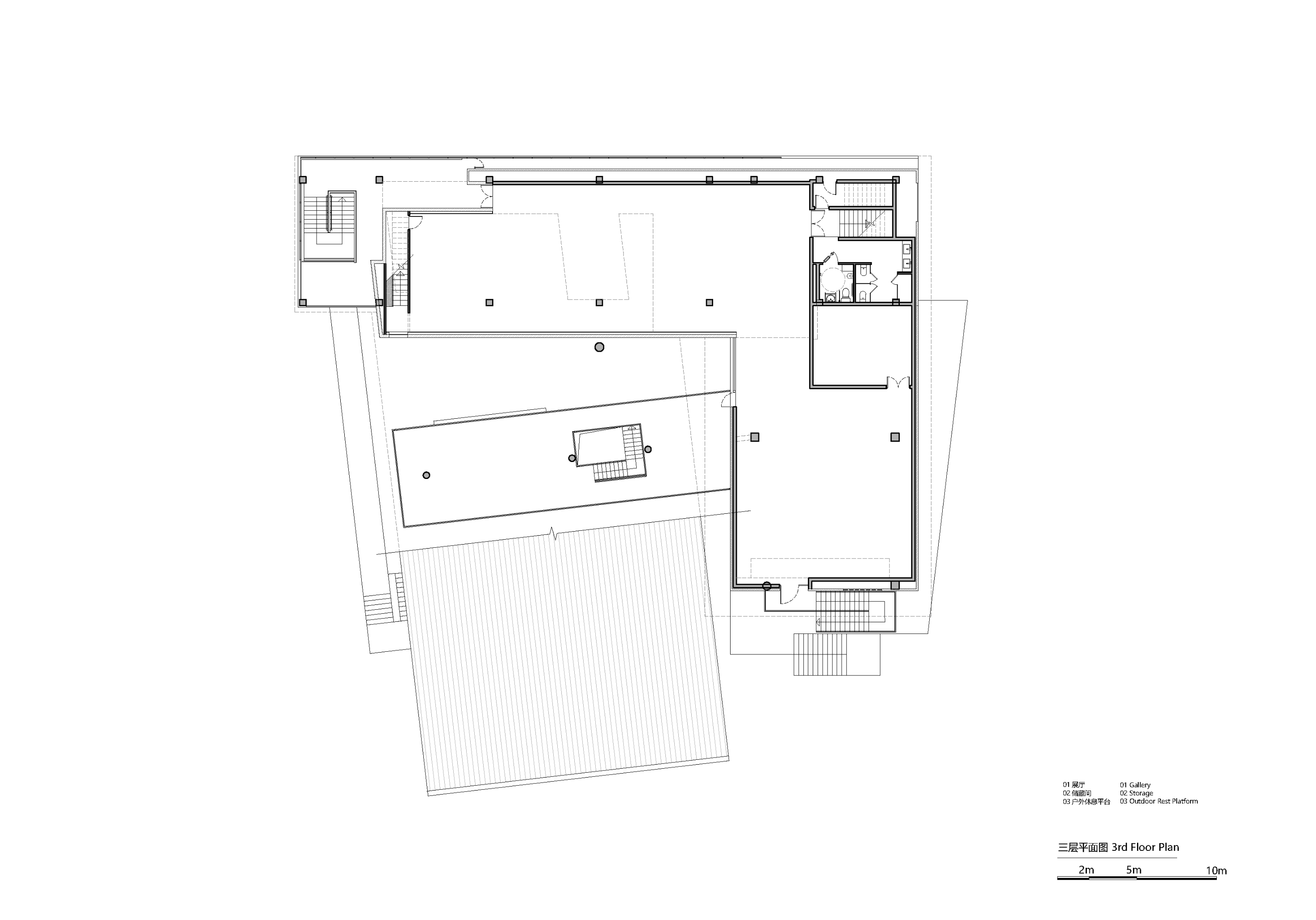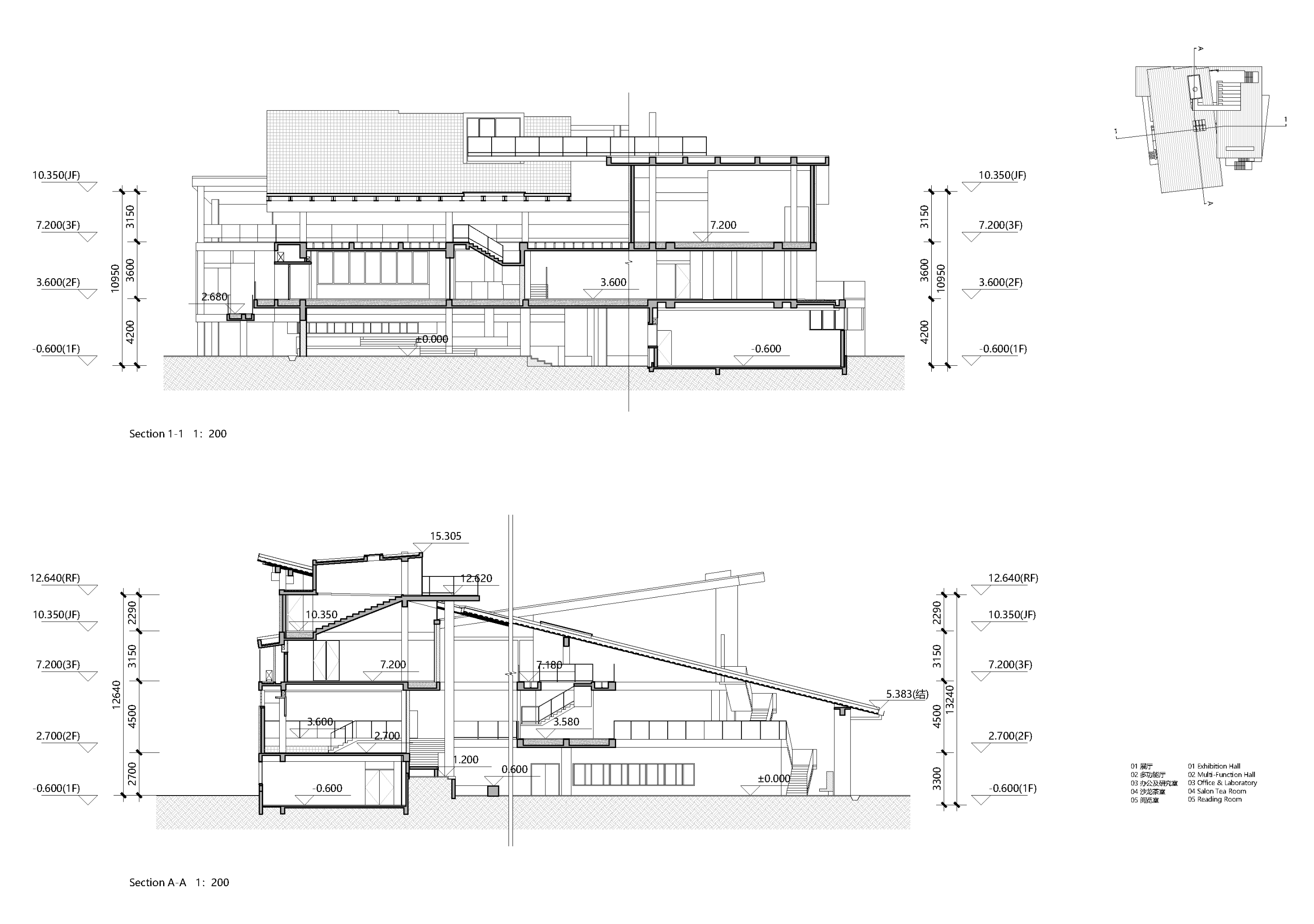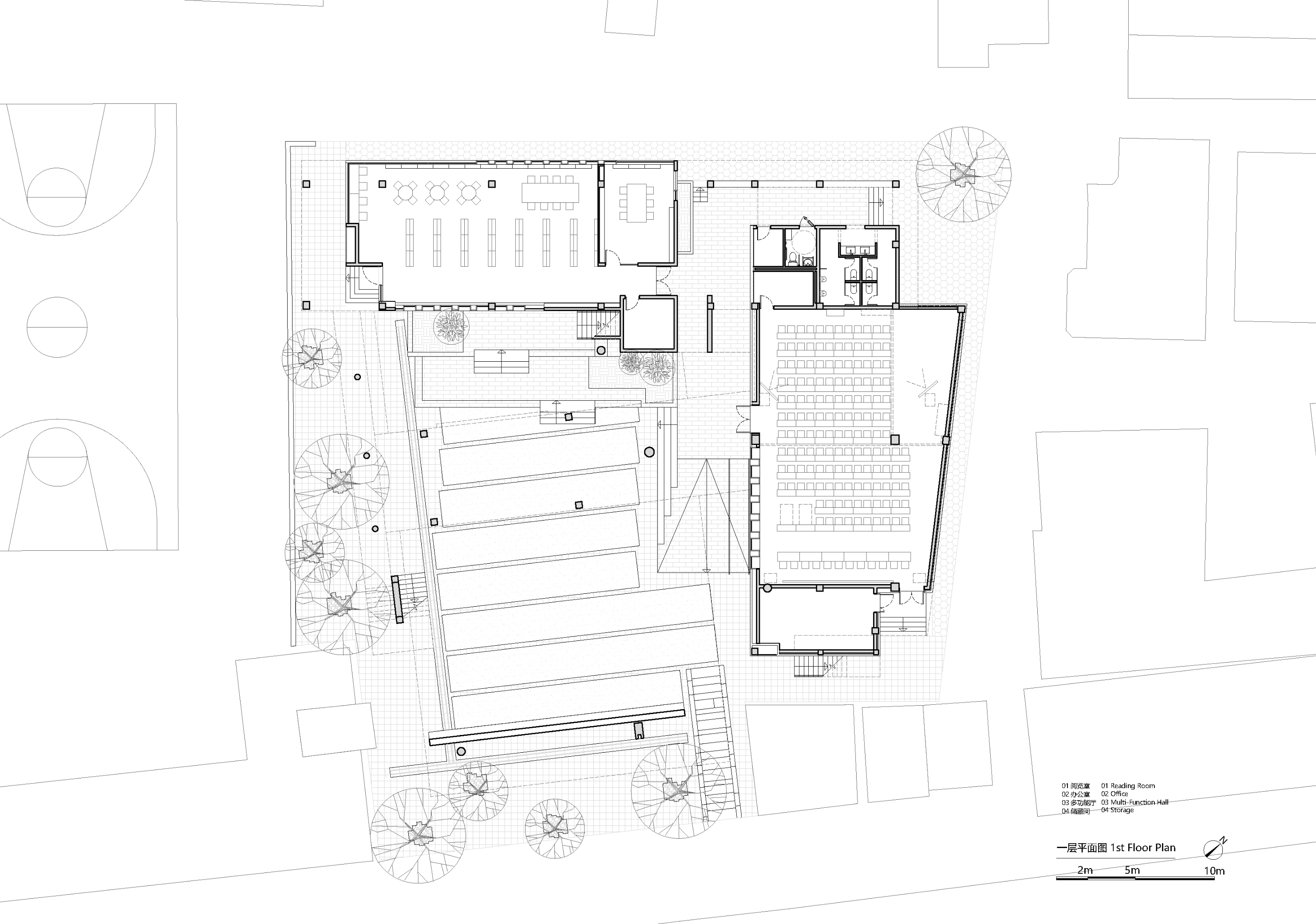 건축가는 공간적 프로토타입을 통해 문화적 기억을 표현한다. 메인 스트리트를 향해 낮게 드리운 처마는 사찰의 툇마루를 연상시키며, 올라가는 계단과 점점 높아지는 지붕은 전통 사찰의 감성적 공간 구성을 반영한다. 지붕의 철골 구조와 콘크리트 본체 사이의 분리감은 구조적 요소를 노출하면서도, 조상당(祖堂) 목구조의 상징을 암시한다. 입구 전면에는 명나라 시대 벽돌 836장이 장식되어 있으며, 그 아래에는 옛 성벽 터가 남아 있어 ‘고고학적 전시’의 내러티브를 통해 장소의 시간적 층위를 드러낸다.