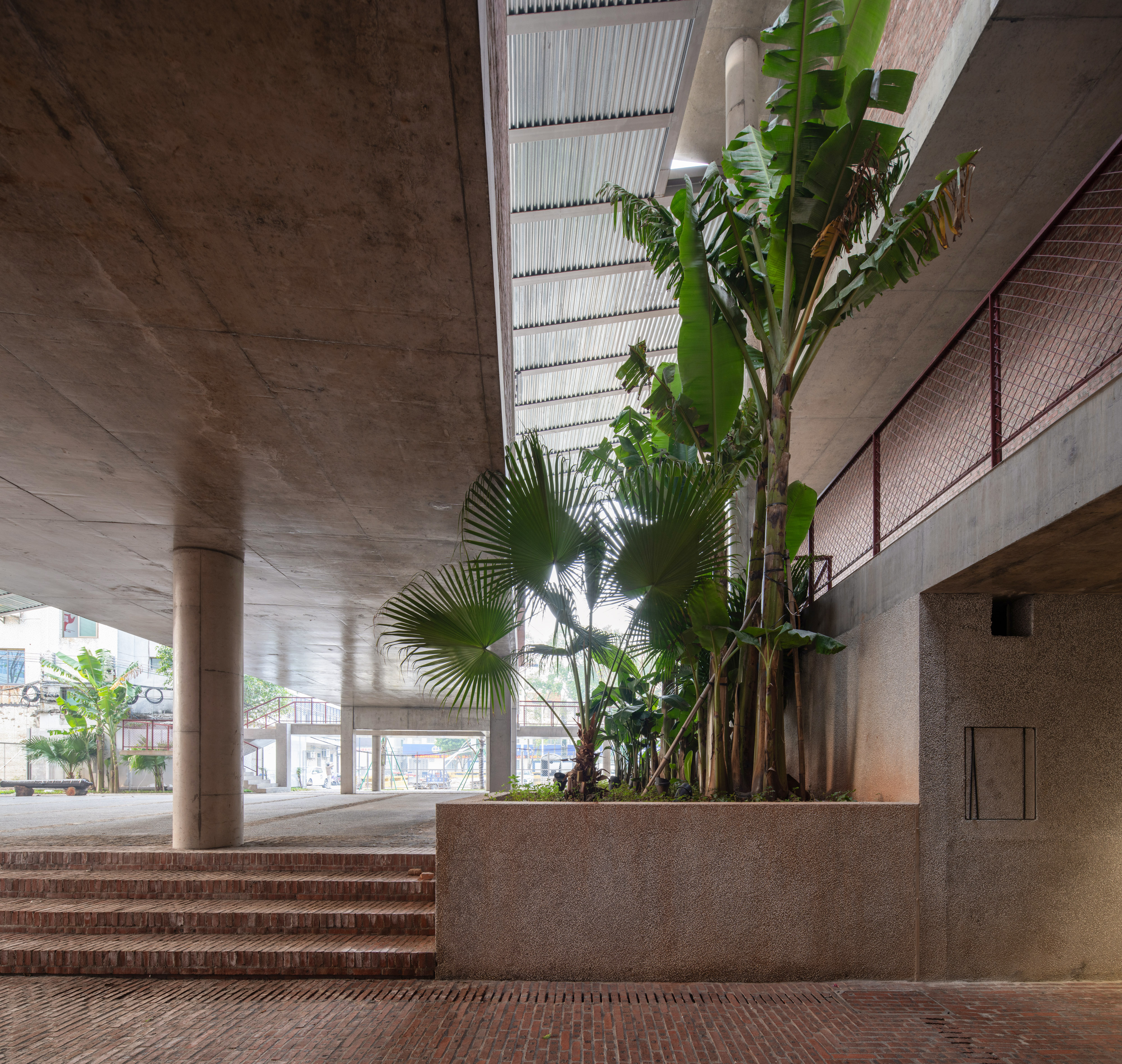 디자인 전략은 ‘전체를 나누어 대응한다’는 개념에 기반하여, 지역의 기후 조건에 유연하게 반응하고 동시에 대형 매스에서 발생할 수 있는 제도적인 분위기를 완화한다. 이를 통해 문화센터와 주변 자가주택 간의 조화로운 공존이 가능해졌다. 넓은 지붕 아래의 반야외 공간은 방문객들이 실내와 실외를 자유롭게 넘나들 수 있도록 하며, 일상과 과거의 역사를 자연스럽게 이어준다. 천장의 높낮이 변화는 공간에 입체적인 감각을 더하며, 이는 마치 ‘단을 오르며 바다를 바라보는’ 듯한 공간 체험을 제공한다. 구불구불한 동선은 주변의 자가주택 군락과 남문 유적을 시각적으로 연결하며, 장소의 역사적 맥락을 강화한다. 반야외 복도와 단이 있는 광장은 시장, 다회(茶會), 전시회 등 다양한 활동이 가능한 지역 문화 플랫폼으로 기능하며, 지역 일상에 생기를 불어넣는다.