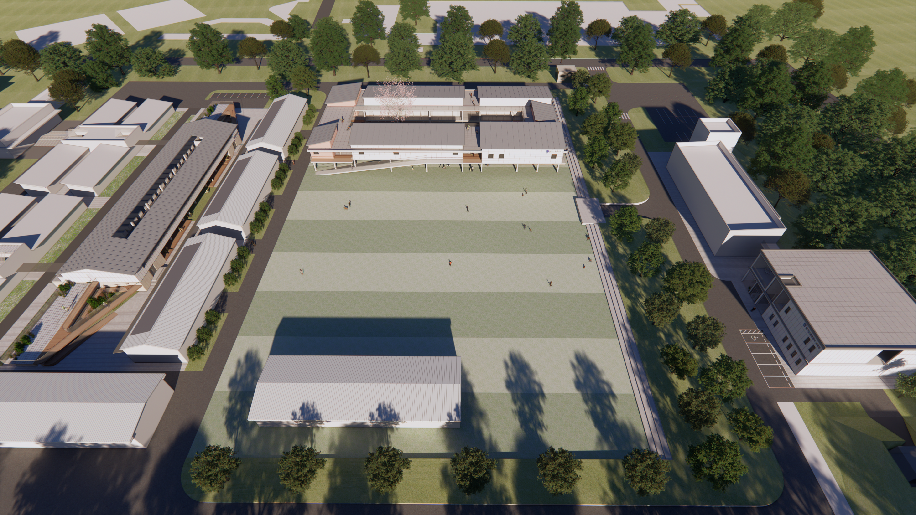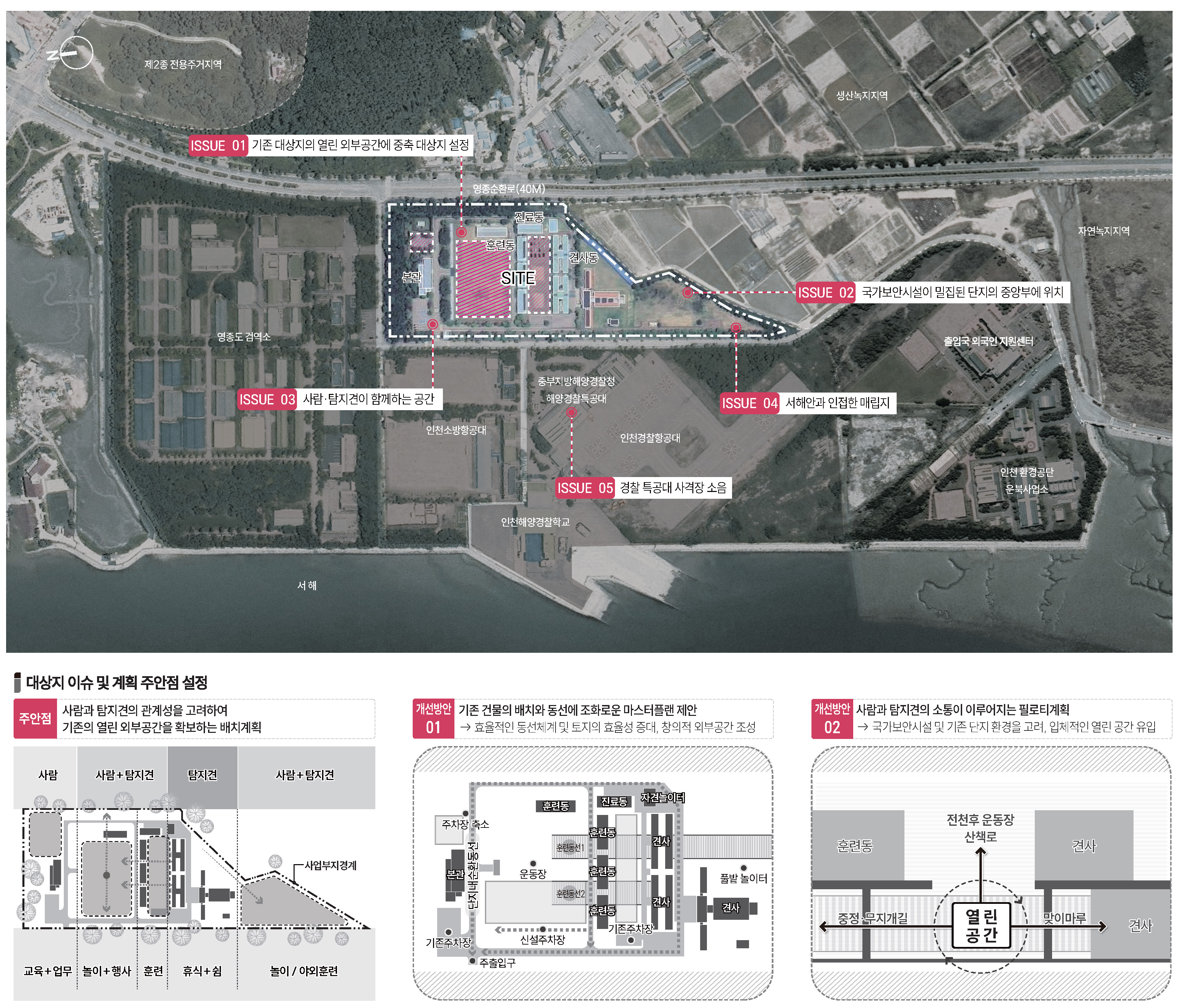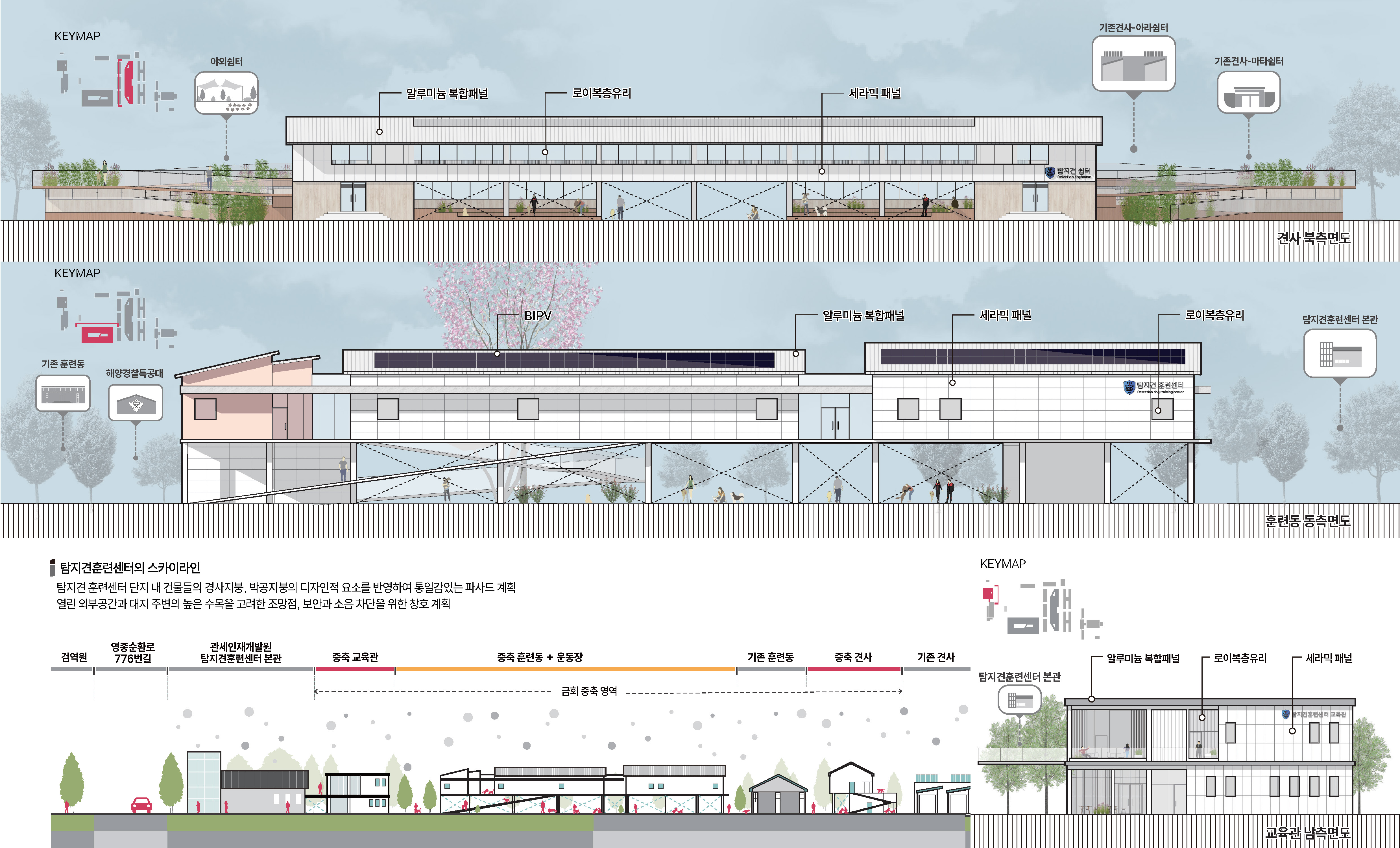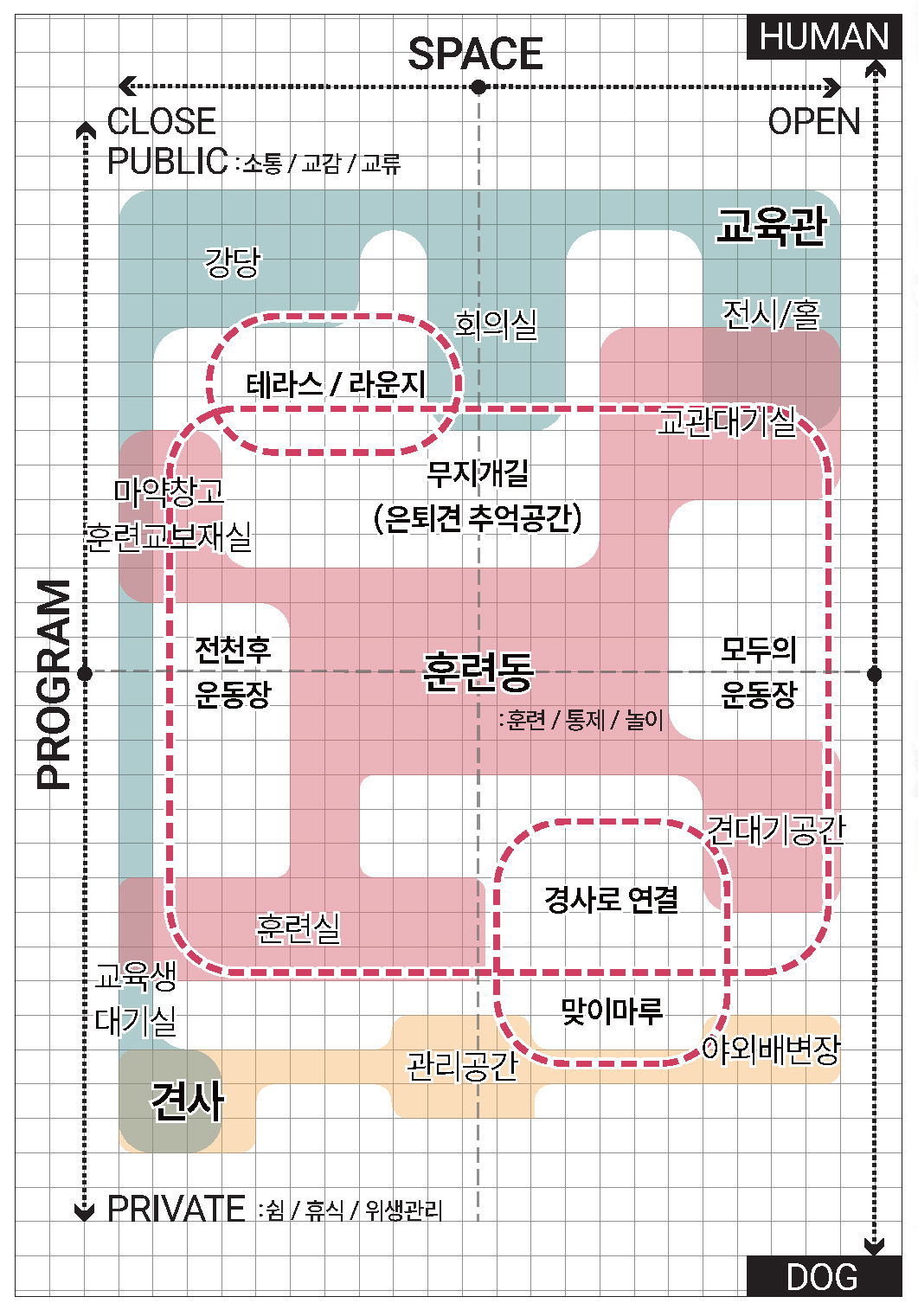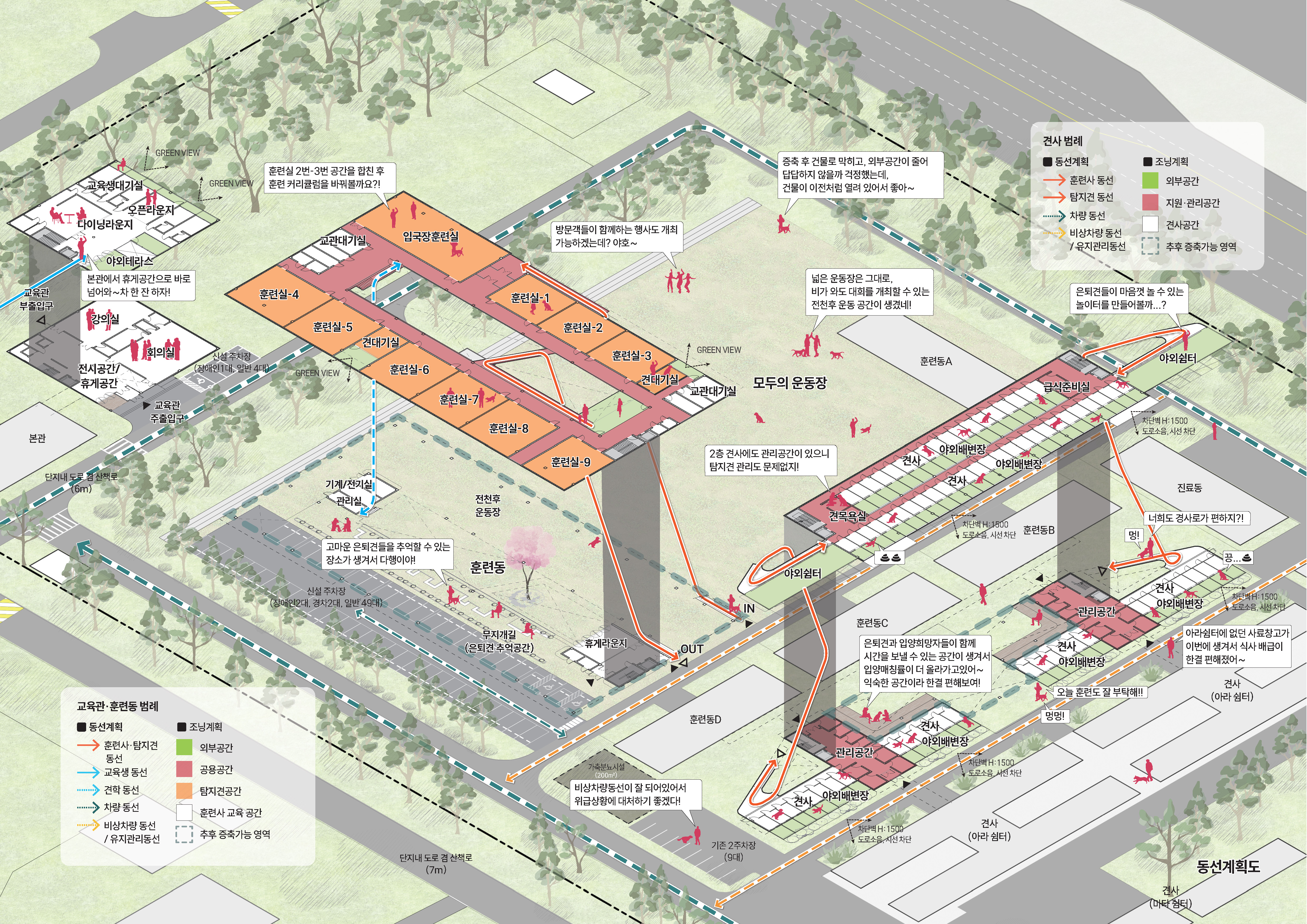 탐지견 훈련센터의 첫 인상은 울창한 나무들과 넓은 잔디가 펼쳐진 외부공간이 시원스레 열려 탐지견과 훈련사들이 자유롭게 뛰어노는 모습을 상상하게되는 장소였습니다. 증축되는 건물들은 필연적으로 해당되는 면적만큼 외부공간을 막게 됩니다. 기존 건물들과 같이 땅에 박힌듯한 건물은 결국 외부공간의 단절을 야기하게 되며, 자칫 답답한 시퀀스와 동선을 가지는 단지가 될 수도 있기에, 저희는 최대한 단지의 외부공간을 존중하여 각 건물의 공간들이 유기적으로 연계할 수 있는 방안을 고민했습니다. 건물을 들어올려 지상공간을 확보하고, 다양한 활동이 가능하도록 기존 외부공간과 연계될 수 있도록 건물을 배치하였습니다. 대지가 가지고 있는 장점을 살리고, 단조로웠던 공간은 입체적으로 조성하였습니다. 자유로우면서도 체계적인 질서와 규정이 담겨있는 공간으로 지속가능한 탐지견훈련센터를 제안합니다.