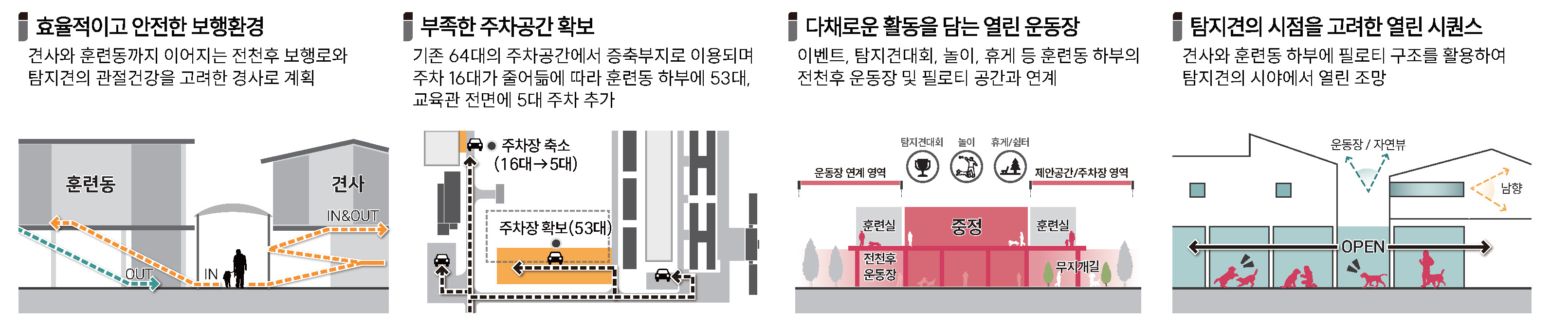 단지의 외부공간과 건물이 유기적으로 연계되며, 각 공간이 자연스럽게 이어지는 탐지견훈련센터