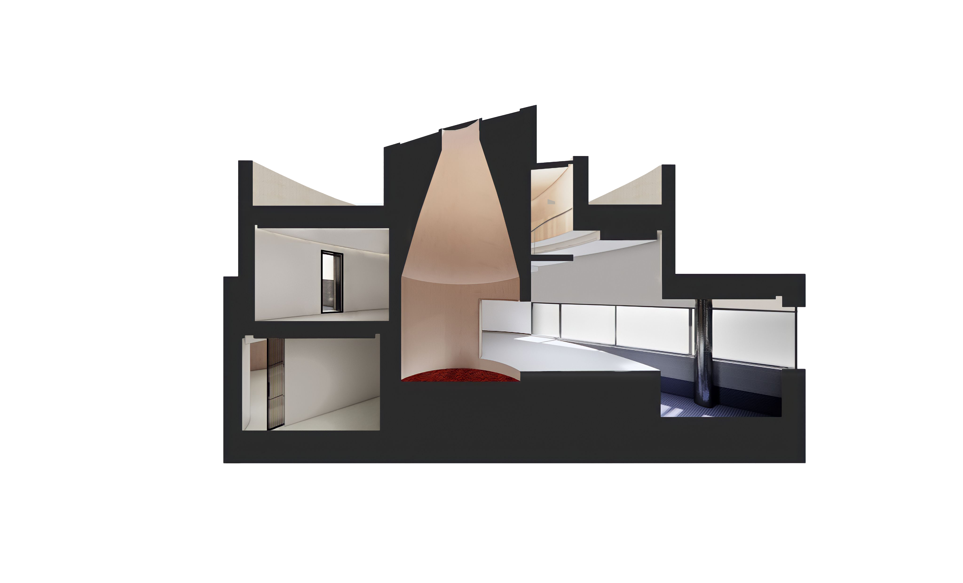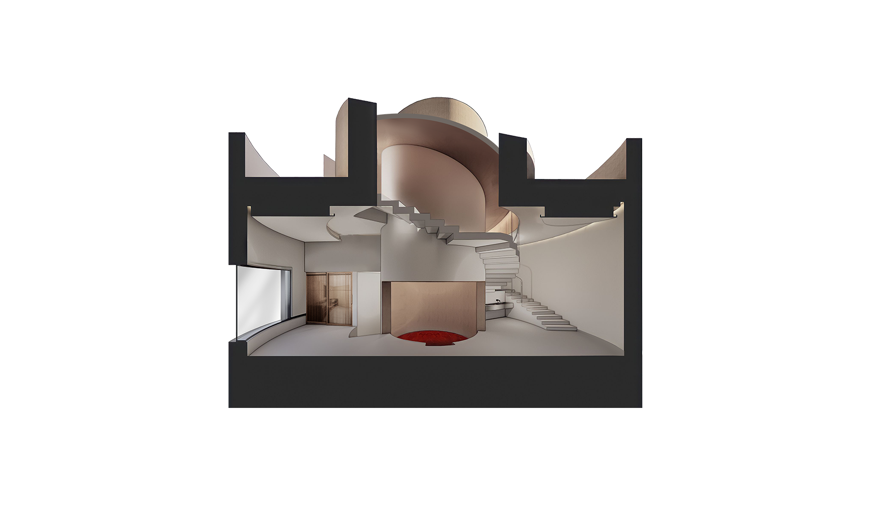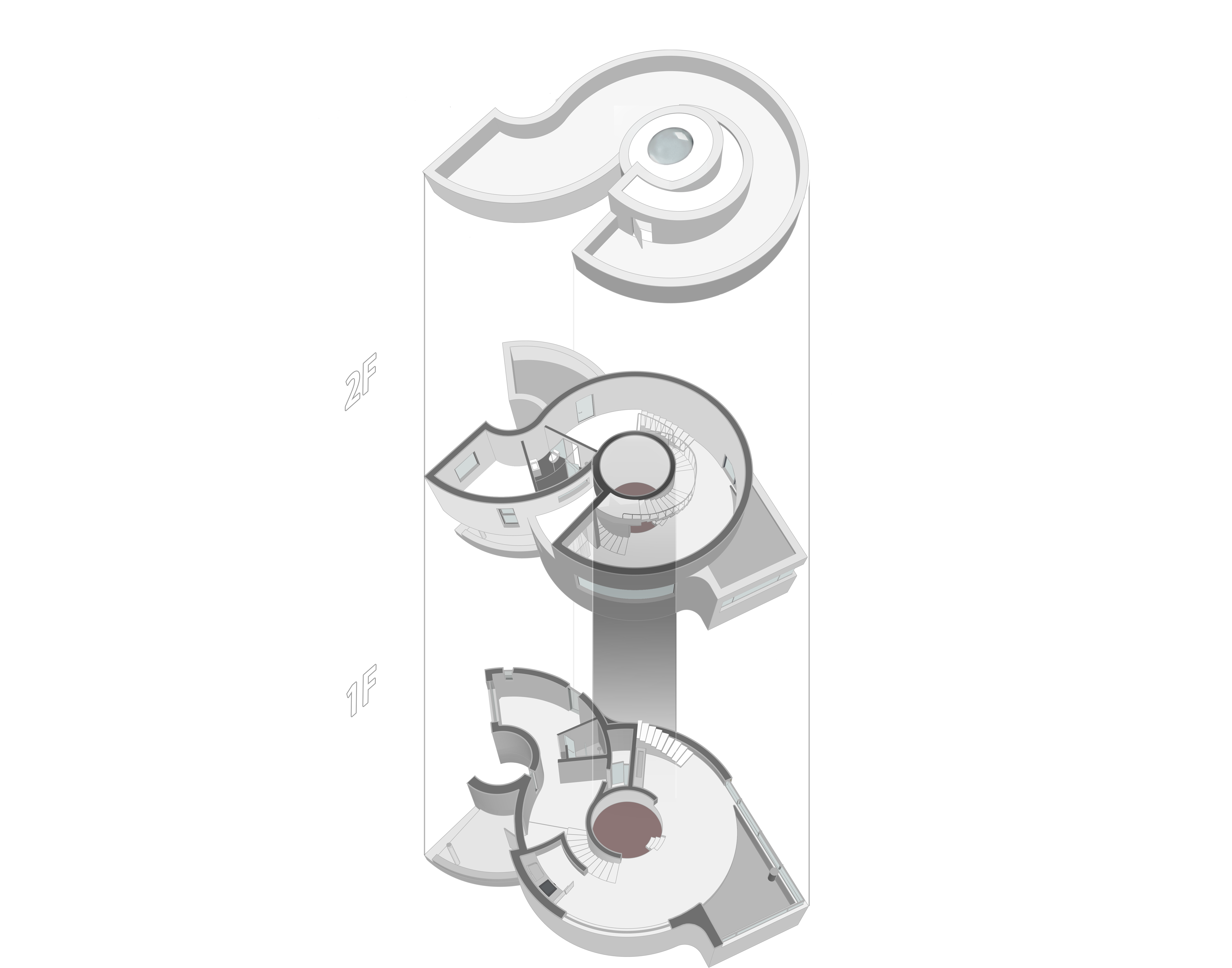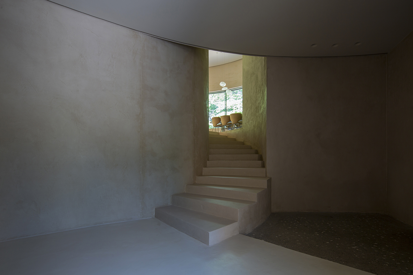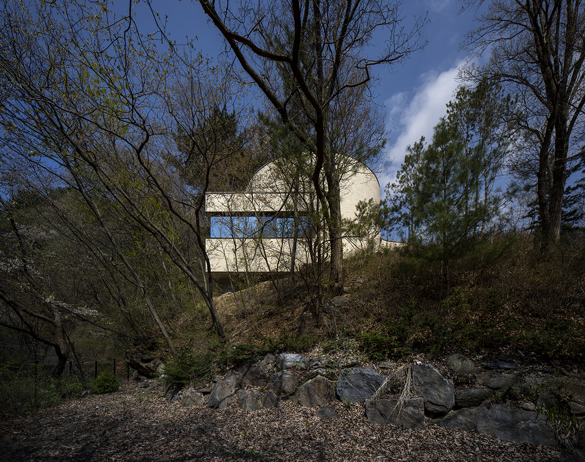 한 개의 원에서 시작한 설계는 두 개의 원으로 확장되고 두 개의 원이 서로 만나고 중첩되며 다양하고 풍성한 공간을 만들어 내었다. 두 원의 중심은 가장 중요한 역할을 하는데 하나의 중심은 외부의 하늘을 담는 공간이 되고 다른 하나는 내부에 하늘을 받아들이는 공간이 된다. 하늘과 자연을 숭상하던 원시적 삶의 모습을 담아내는 건축이 길 바랬다. 현관에 들어서면 작은 창을 통해 들어오는 북녘 빛이 전부인 동굴 같은 공간을 마주하게 된다. 계단을 따라 반 층 올라가면 계곡의 물이 흘러가듯 빛과 공기가 어우러져 끊임없이 흘러가는 공간이 드러나고 봄·여름·가을·겨울의 자연, 동서남북의 빛, 그 풍부함이 공간을 가득 채운다. 계절에 따라 시간에 따라 변화하는 나무 그림자들은 공간을 끊임없이 변화시키고 그 중심에는 적막과도 같은 붉은 카펫이 깔린 원형의 공간이 있다. 오큘러스라 불리는 둥근 천창은 판테온 같은 고대 종교 건축물에 중요한 요소였다. 그 공간에서는 가만히 앉아있어도 시간의 흐름에 따라 하늘빛이 변화하며 나만을 위한 작은 하늘을 느낀다.