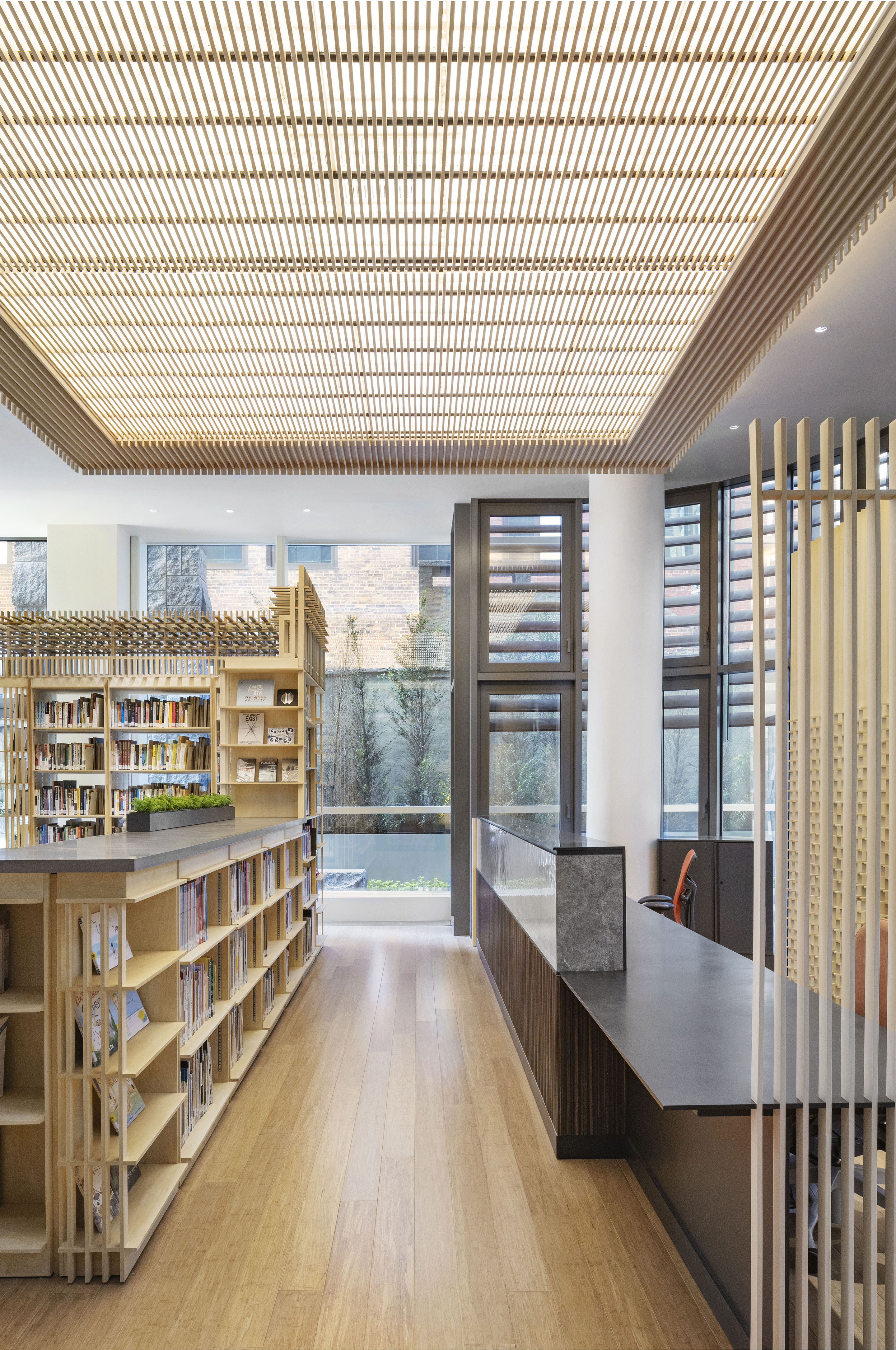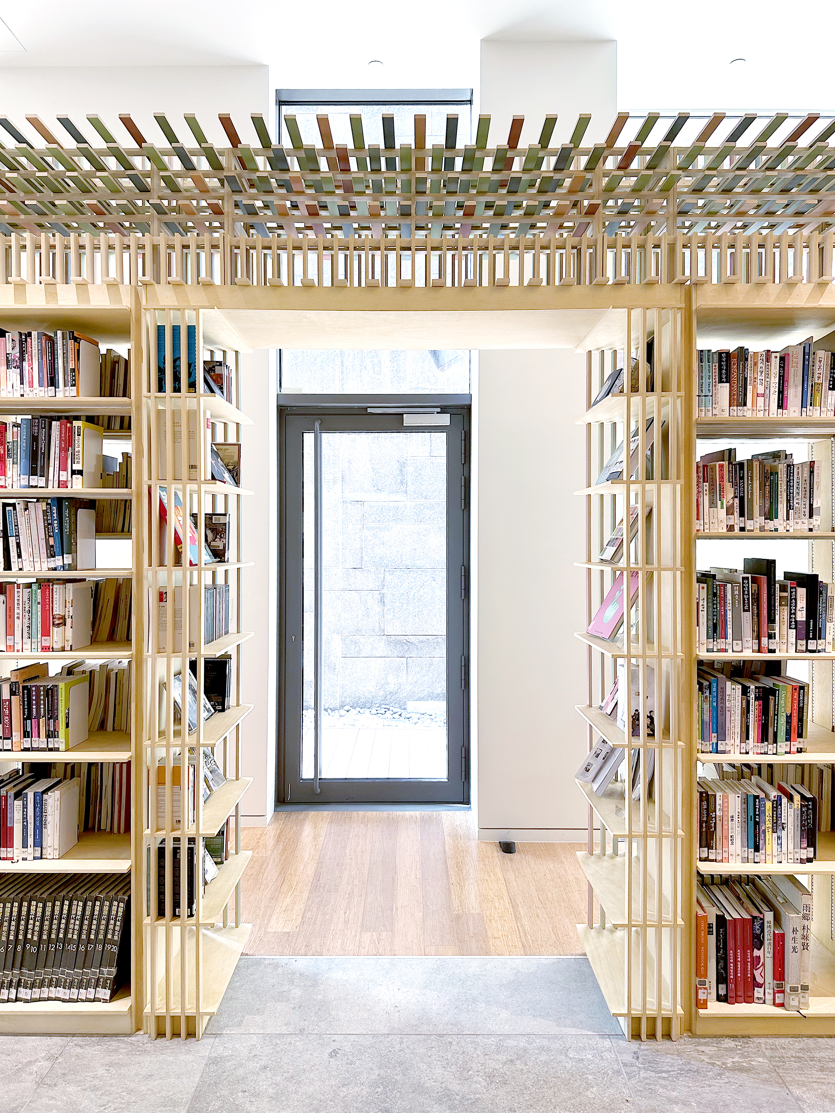 서가로 형성된 공간이 한옥의 안마당 분위기를 오롯이 재현할 수 있도록 서가 디자인에 건축 구성요소를 투영하는 아이디어인 ‘퍼니텍쳐(furnitecture)’라는 방식을 고안하였다. 한옥 벽면을 구성하는 가구식 목구조와 처마 공포(栱包)의 결속 방식, 집을 구성하는 목구조의 건축적 요소들이 서가 디자인의 단초로 활용되었다. 보다 밝은 색감의 공간을 형성하기 위해 재료는 포플러 나무로 선정히여 친밀감과 안락감이 느껴지도록 하였고, 제작 용이성을 감안하여 일정한 규격의 반복 모듈로 디자인되었다. 서가의 각 부재들은 구조적으로 허용되는 가장 얇은 두께의 목재(판재 및 각재)와 금속 부품을 사용하여 외곽틀(framework)의 시각적 부피감을 줄일 수 있도록 제작함으로써, 수납된 서책의 가시성을 높이고 도서관 내 장서들이 도드라져 보이는 공간감을 실현하였다. 수직 부재는 얇은 판재를 요철형으로 덧대 제작하고, 수평 선반들은 수직 부재보다 돌출시켜 설치하여, 간결한 제작 방식으로 섬세하고 풍부한 디테일을 구현함과 동시에 수납 하중에 필요한 구조적 요구도 충족될 수 있도록 하였다. 서가 상부에는 공포(栱包) 양식에서 차용된 격자형 구조물을 고안하여 수납공간으로 활용하였다. 격자 구조물에는 단청 색상을 참고한 5가지 색상을 적용함으로써 서가에 수납된 다양한 책등(book spine)의 다채로운 색상들과 어우러지도록 하여, 목재 서가와 석재 바닥의 단일 색조와 대비를 이루는 생동감있는 도서관 풍경을 완성하였다. 이처럼 ‘퍼니텍쳐’ 개념에 근간한 여러 아이디어를 취합하고 시험하는 디자인 과정을 통해, 우리 한옥 내 복도와 안마당을 오가는 공간감을 담은 서가 디자인과 공간 배치를 통합할 수 있었다.