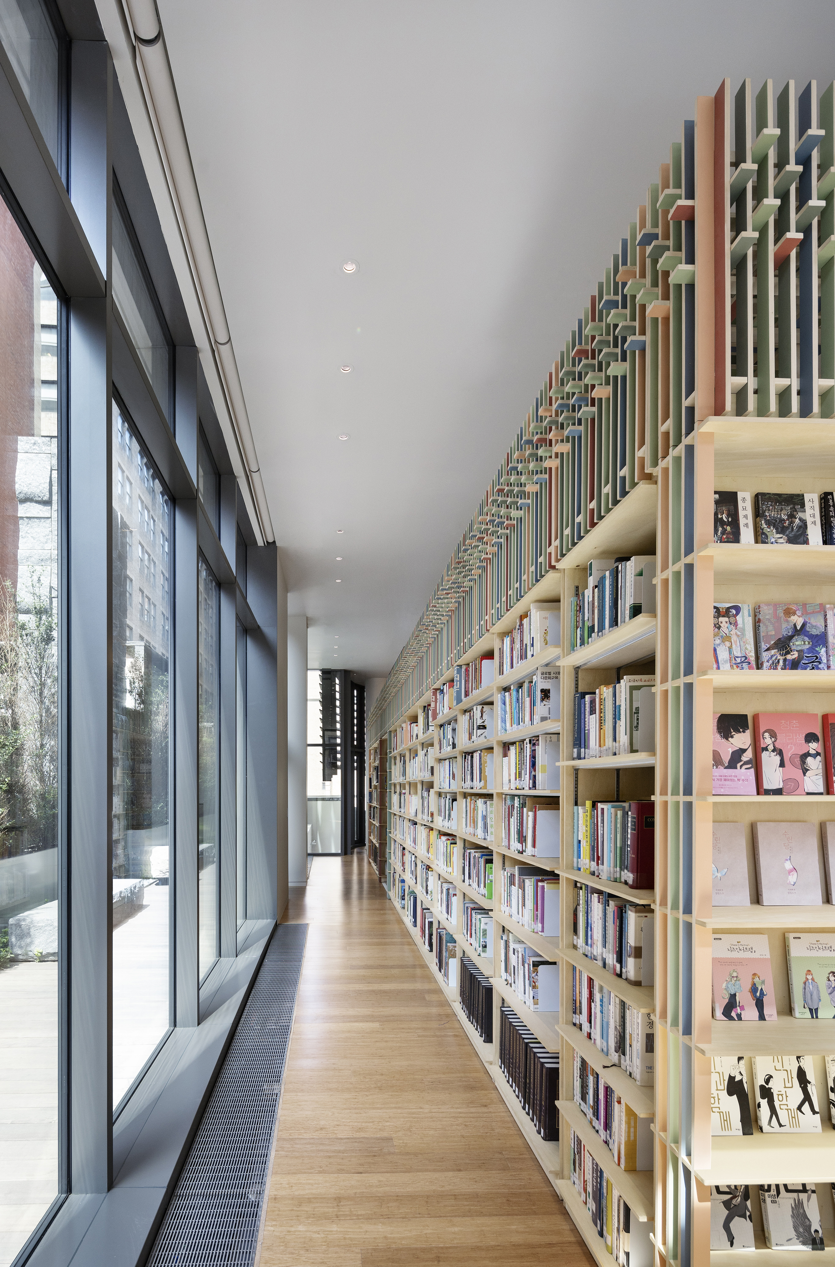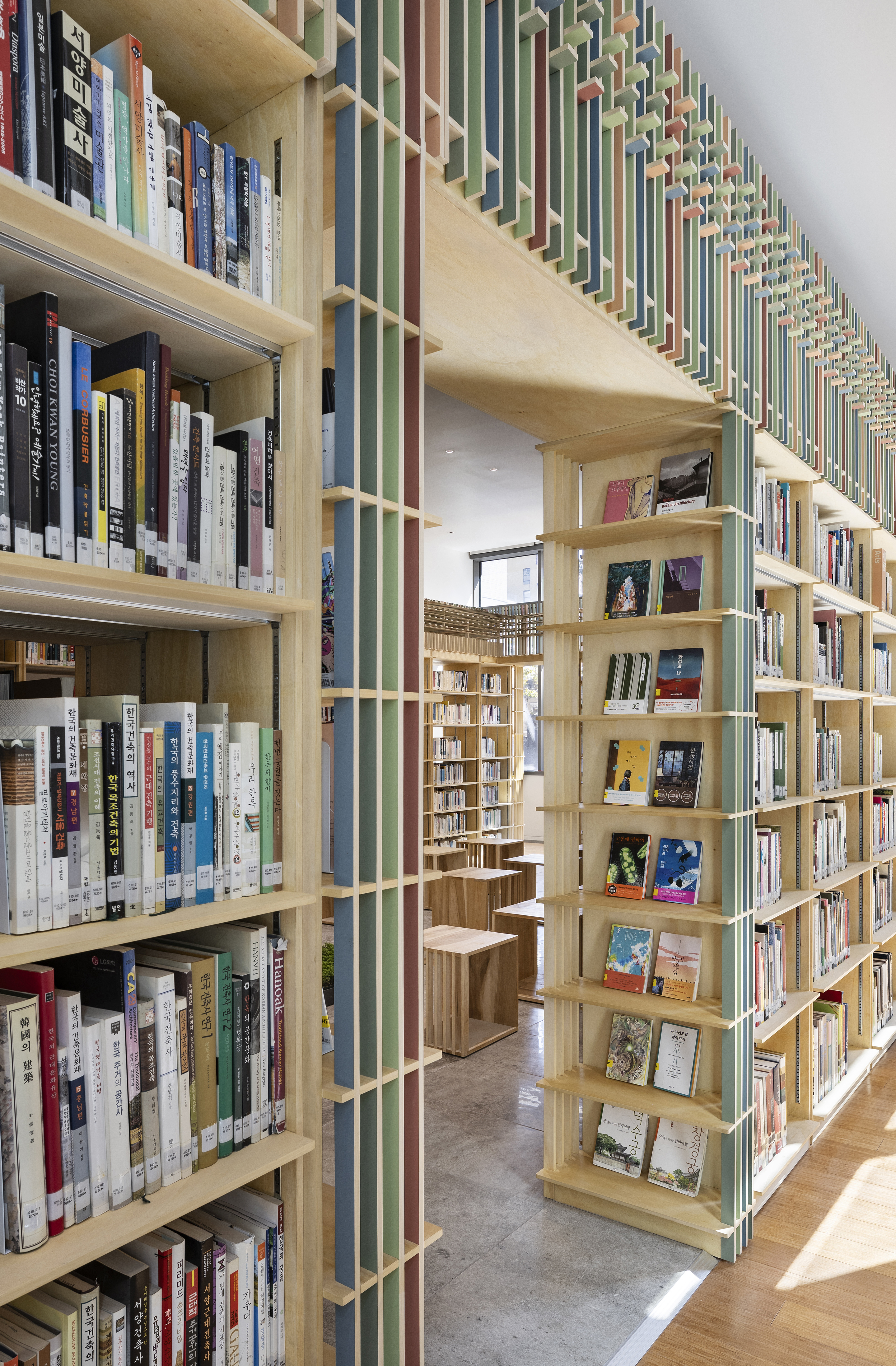 도서관 공간 구성은 ‘순환하는 공간(Circulative Space)’을 구축하는데 중점을 두었으며, 이러한 공간 구성 아이디어는 서가 배열을 통해 완성되었다. 기존 도서관 계획에서 주를 이루던 기능적 조닝(zoning)과는 다른 서가 배치로, 연속적인 동선 흐름과 교차가 만들어지는 공간을 만들어 현대 도서관 계획의 중심 화두 중 하나인 ‘소통(communicative) 기능’을 새롭게 구현하고자 하였다. 도서관 서가 배치는 작은 안마당이 있는 소규모 한옥을 모티브로 구성되었다. 일련의 서가를 중심이 비어있는 장방형 루프(loop) 형태로 배열하고, 중심 안팎을 연결하는 개구부를 일정 위치에 두어 간결한 순환 동선 체계를 완성하였다. 이로써 방문객은 서가를 따라 걷거나 통과하며 보다 용이한 검색과 열람을 할 수 있으며, 서가와 서책 그리고 옥외 테라스의 녹지공간이 연속적으로 중첩되며 내외부로 어우러진 다채로운 도서관 풍경을 체험하게 된다.
