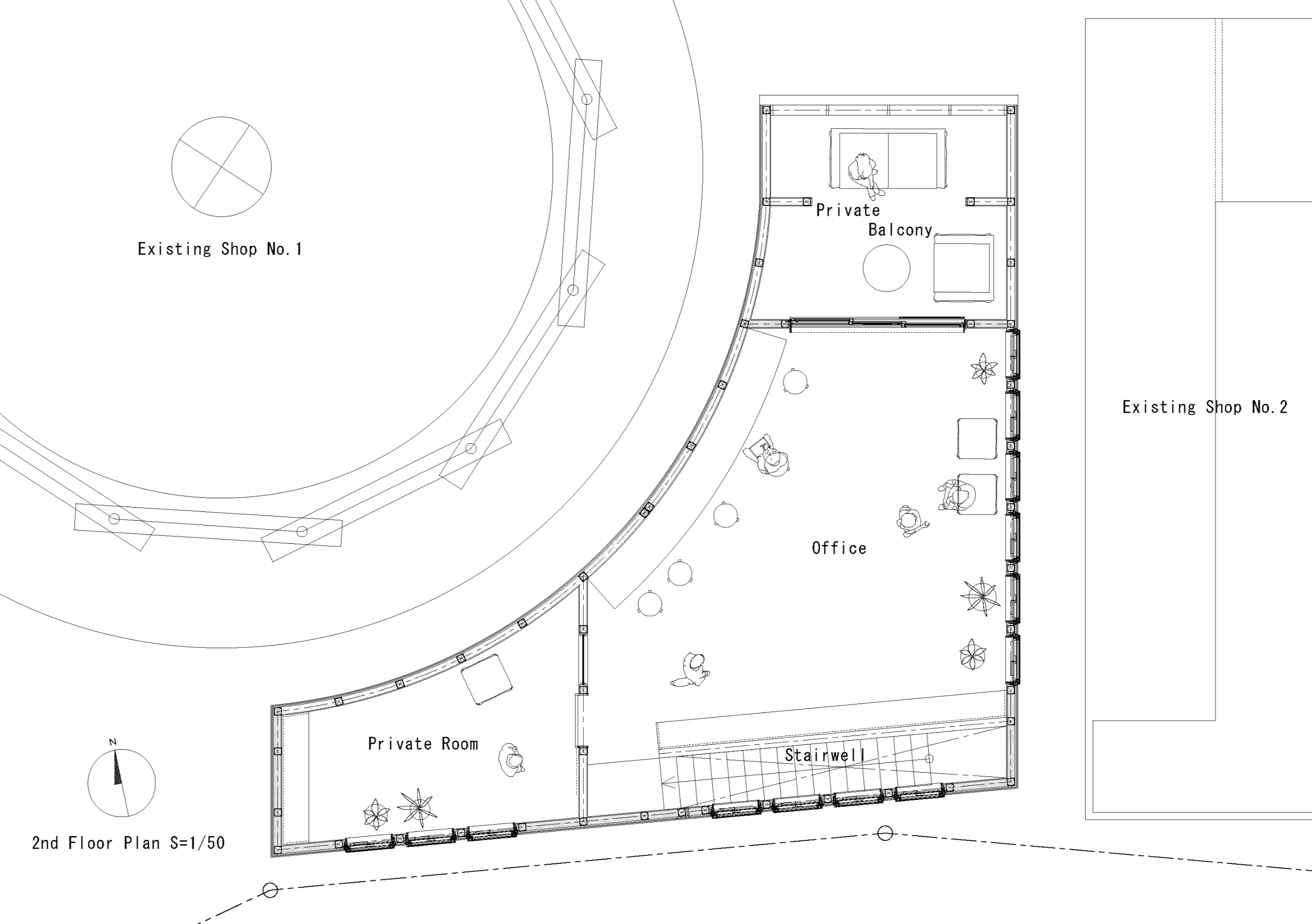 2층 사무실에는 부지 전체를 조망할 수 있는 프라이빗 발코니가 계획되어, 전체 상점군을 한눈에 조망할 수 있도록 했다. 세 건물을 전체적으로 바라보면 마치 성격이 서로 다른 세 형제가 나란히 서 있는 모습처럼 보인다. 외형과 분위기는 다르지만, 세 건물은 의도적으로 공통된 디자인 요소를 공유해 마치 오랜 시간 이 자리에 함께 있었던 것처럼 자연스러운 풍경을 형성한다. 건축가들은 이 건물이 앞으로도 많은 이들이 찾아와 머무는 도시의 활력을 불어넣는 장소로 자리하길 바랐다.