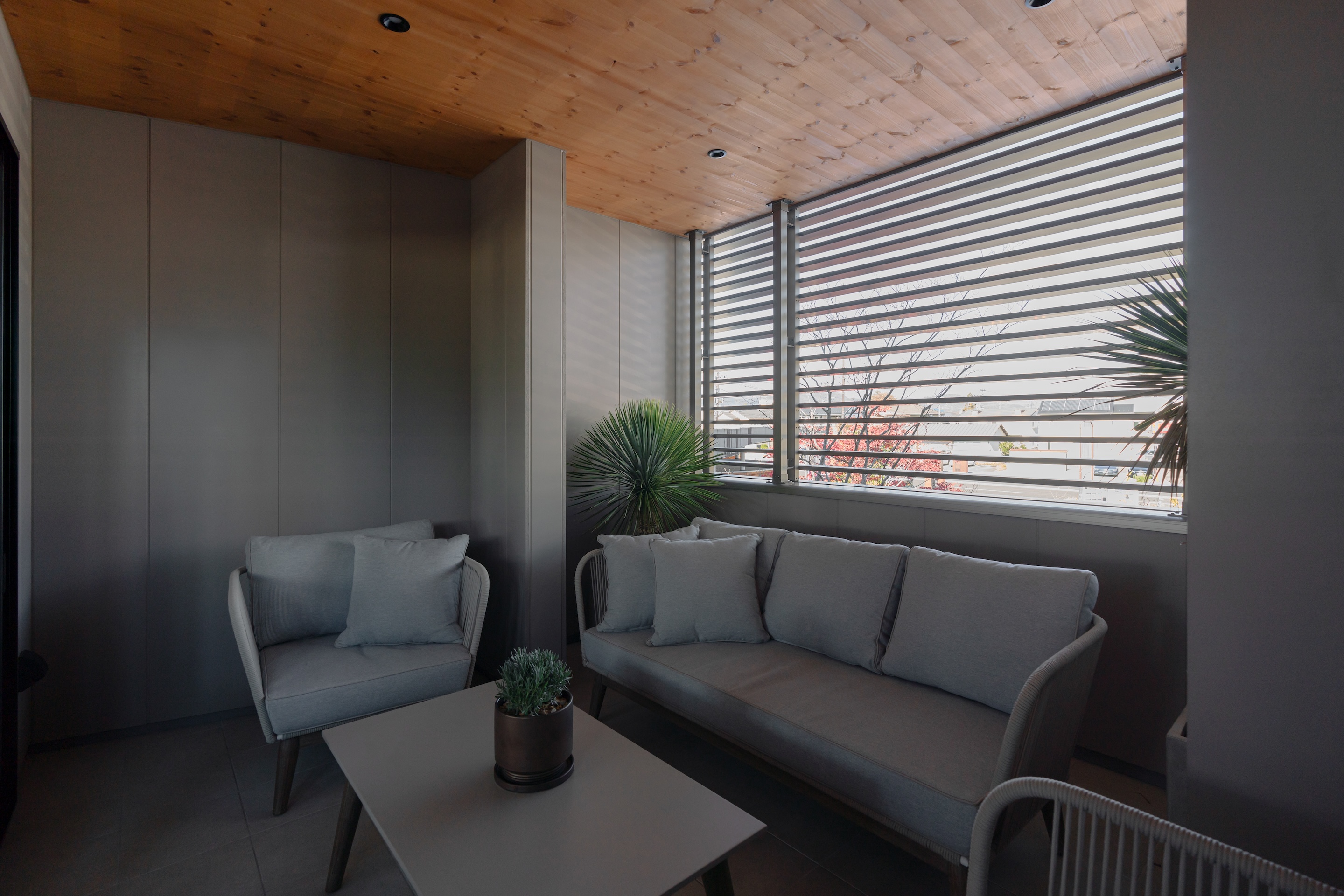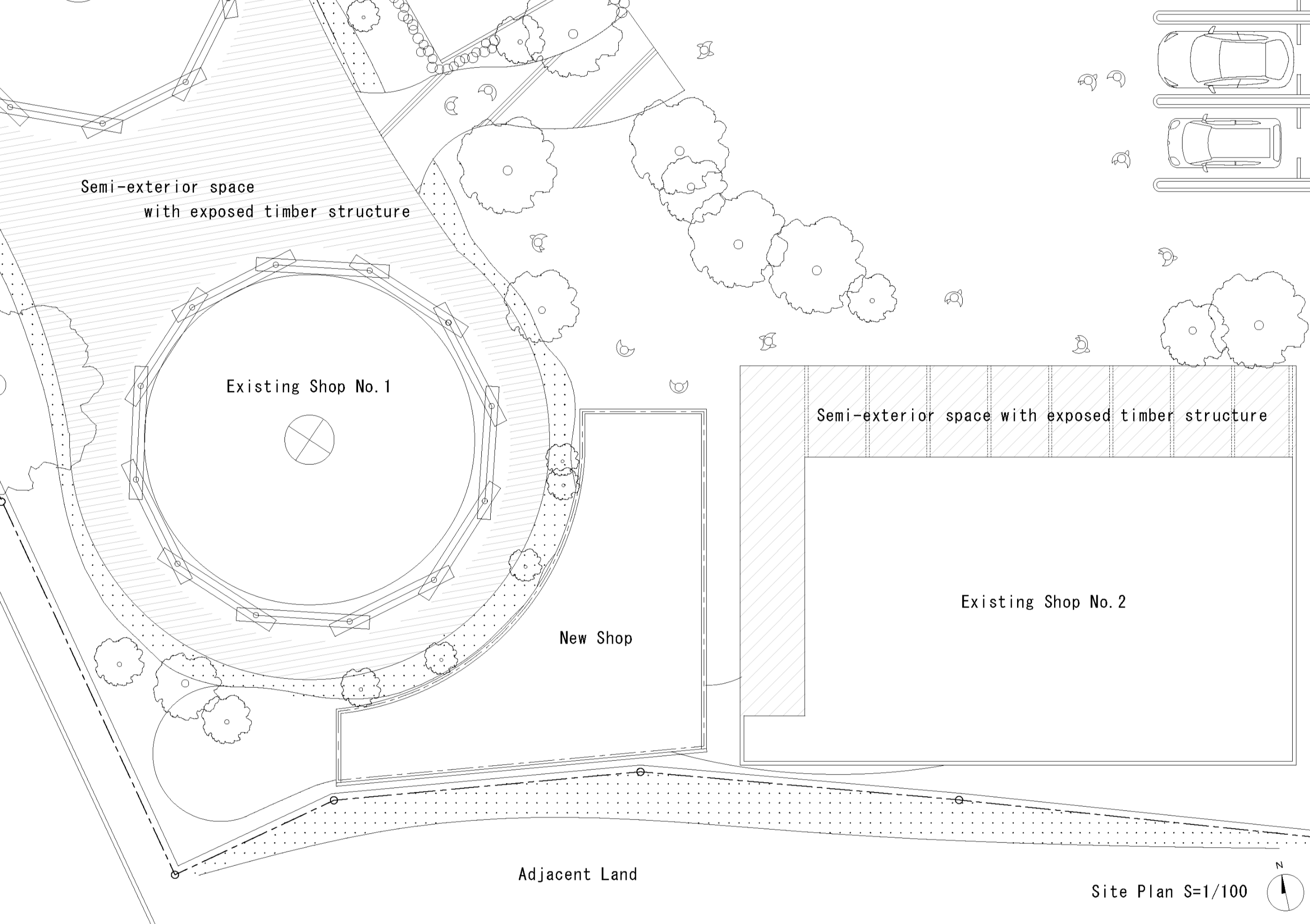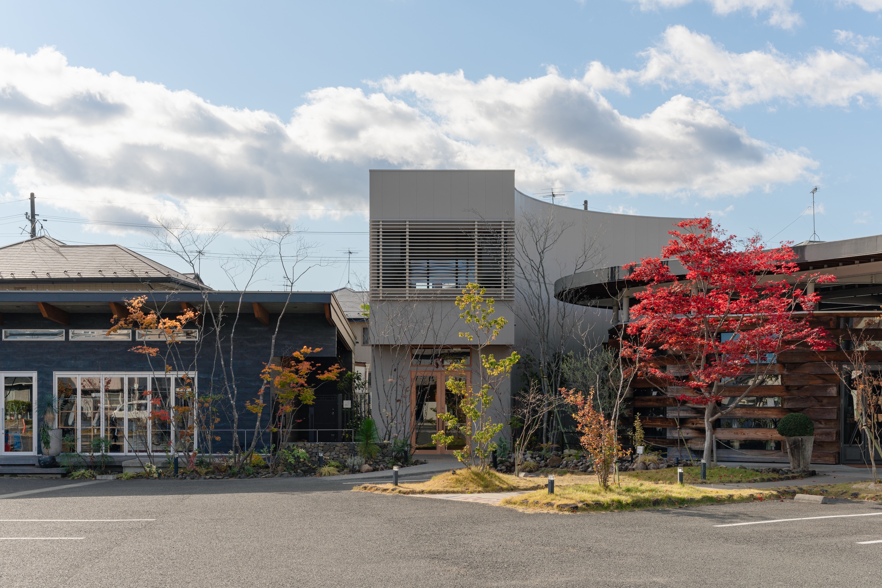 두 기존 건물은 겉보기에는 서로 전혀 다른 건축물처럼 보이지만, 공통적으로 목재를 활용한 반외부 공간을 디자인 요소로 포함하고 있었다. 이에 착안해, 세 번째 상점 역시 이러한 반외부 공간 개념을 이어받아 전체 구성의 조화와 연속성을 강화했다.