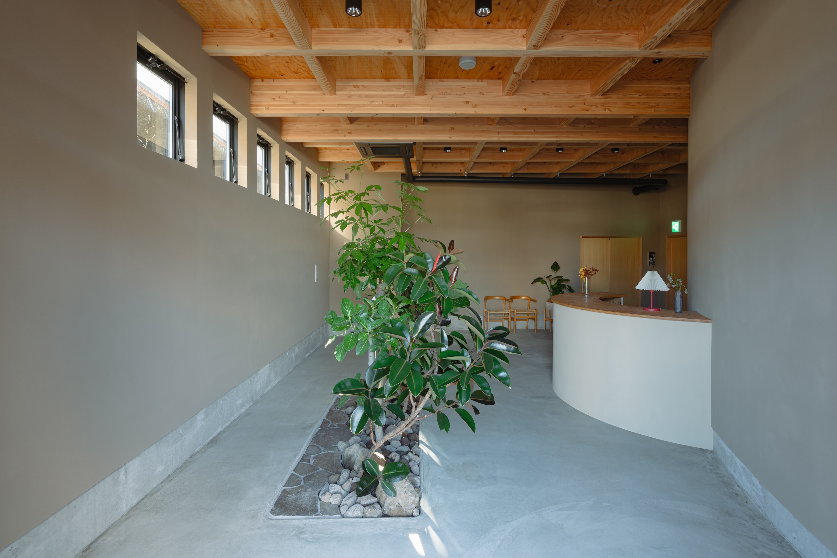 실내로 들어서면 와플 구조의 목재 보가 천장에 노출되어 있으며, 높이 3.5m의 천장은 기존 상점의 반외부 공간과 연속되도록 설계되어 개방감 있는 공간을 만든다. 상부 측창으로 들어오는 자연광이 낮 동안 실내를 밝히며, 빛이 머무는 상점이라는 인상을 준다.