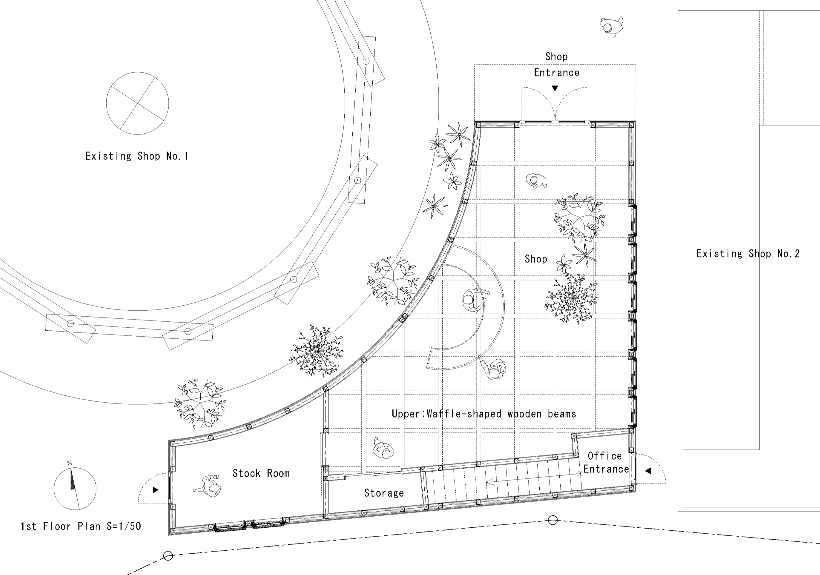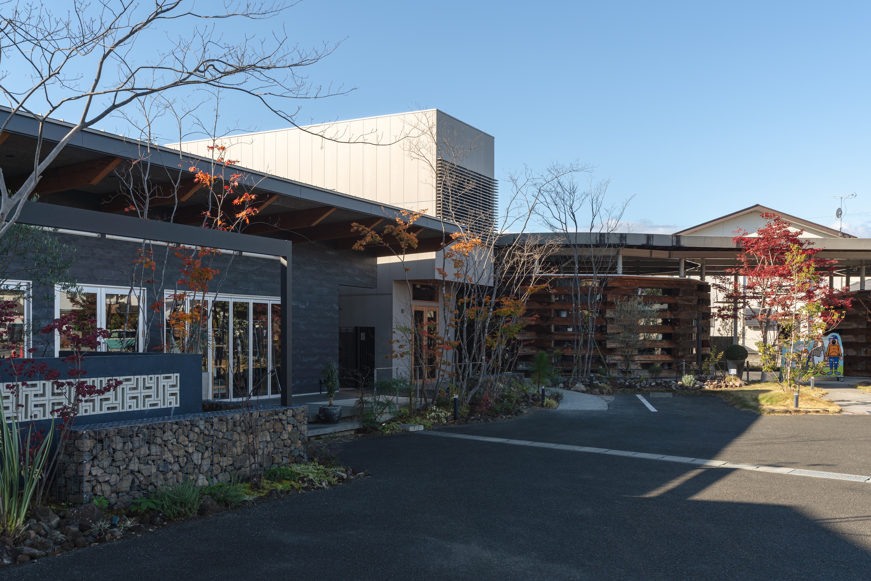 두 기존 건물은 겉보기에는 서로 전혀 다른 건축물처럼 보이지만, 공통적으로 목재를 활용한 반외부 공간을 디자인 요소로 포함하고 있었다. 이에 착안해, 세 번째 상점 역시 이러한 반외부 공간 개념을 이어받아 전체 구성의 조화와 연속성을 강화했다.