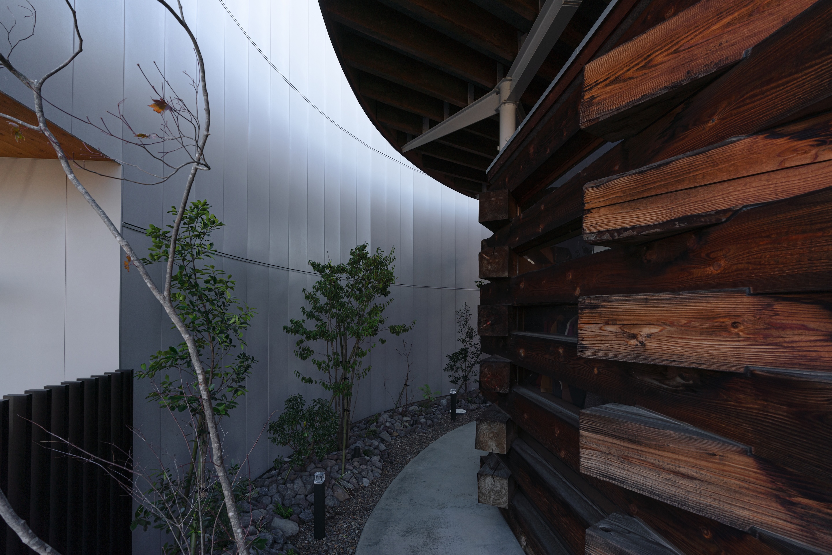 외부의 곡면 벽은 폭 300mm의 수직 사이딩으로 마감되고, 내부는 규조토로 마감되었다. 이 부드럽게 휘어진 벽은 공간에 깊이와 유연함을 더하며, 상점 전체의 분위기를 다채롭게 만드는 시각적 포인트가 된다.
