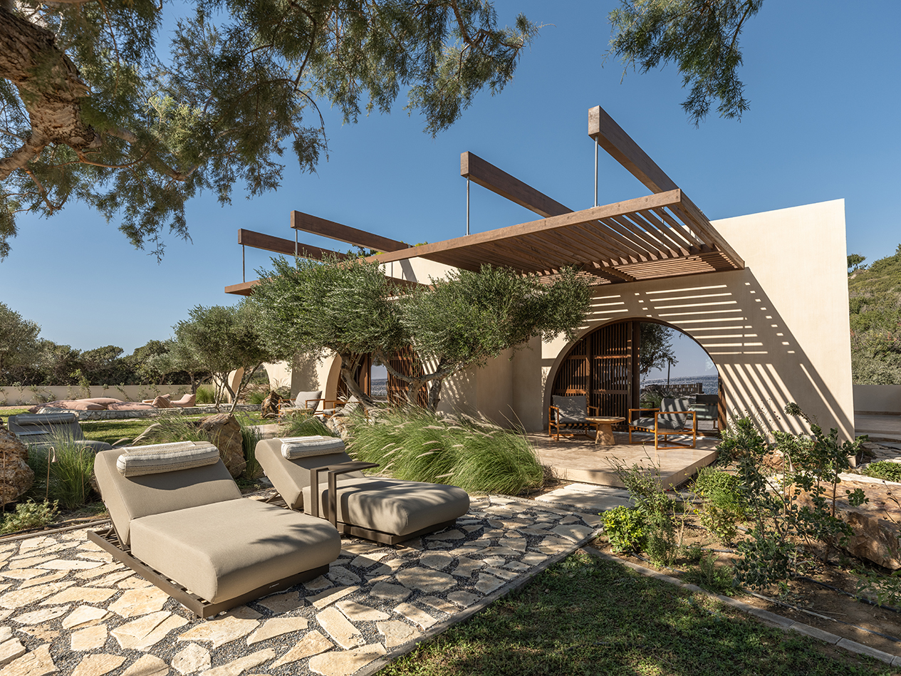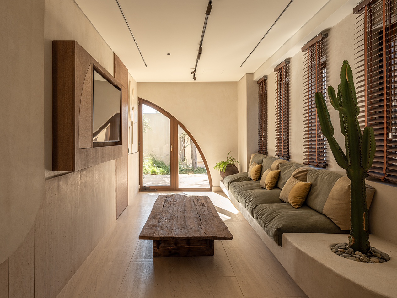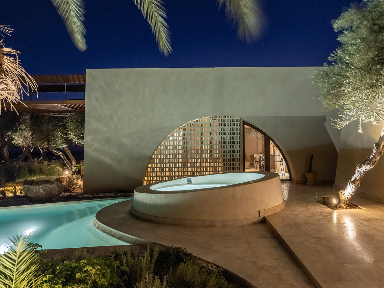 곡선형 산책로, 낮은 돌담, 그리고 자생 허브 식물 군락이 외부 공간 간의 미묘한 경계를 정의했다. 중앙부의 오래된 우물은 재해석되어 수영장 구조 안에 자쿠지로 통합되었다. 대리석, 현지산 석재, 목제 퍼골라와 해안 기후에 대응한 목공 요소는 이 프로젝트가 자연 맥락에 뿌리를 둔 세련되고 안정된 휴식처임을 보여준다.