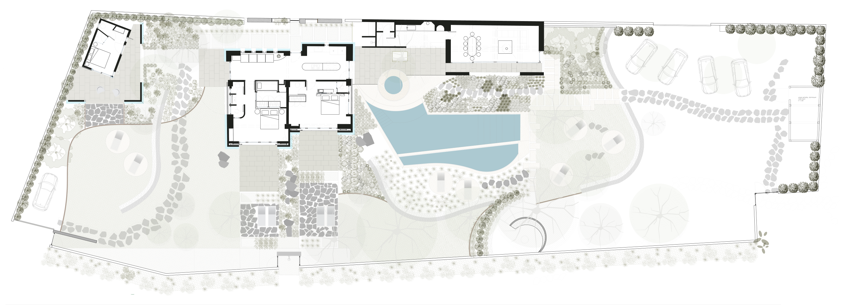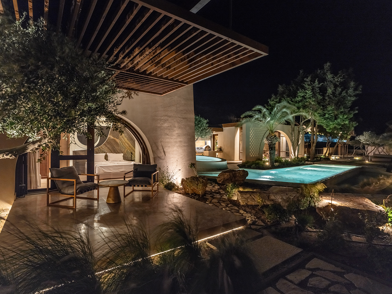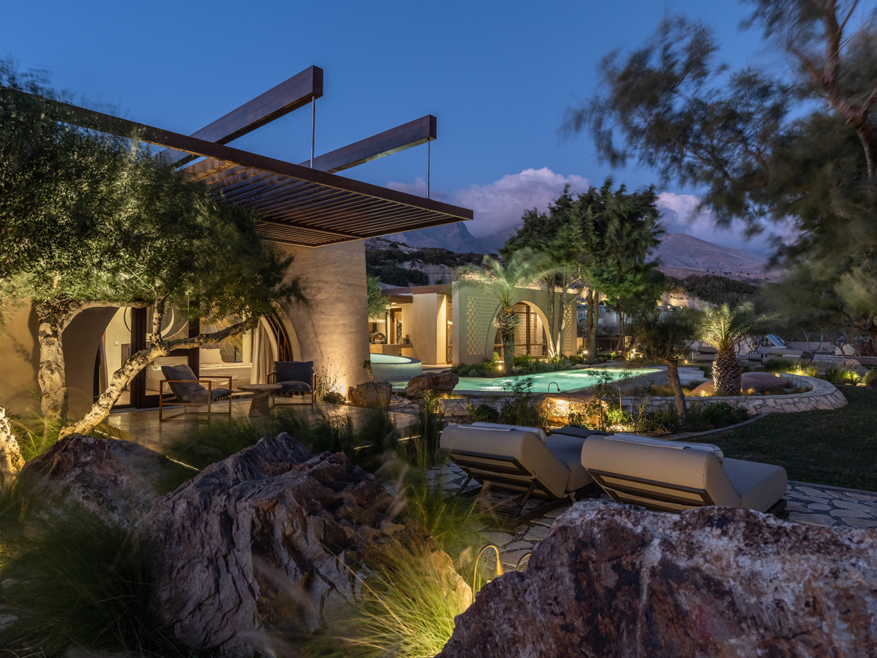 곡선형 산책로, 낮은 돌담, 그리고 자생 허브 식물 군락이 외부 공간 간의 미묘한 경계를 정의했다. 중앙부의 오래된 우물은 재해석되어 수영장 구조 안에 자쿠지로 통합되었다. 대리석, 현지산 석재, 목제 퍼골라와 해안 기후에 대응한 목공 요소는 이 프로젝트가 자연 맥락에 뿌리를 둔 세련되고 안정된 휴식처임을 보여준다.