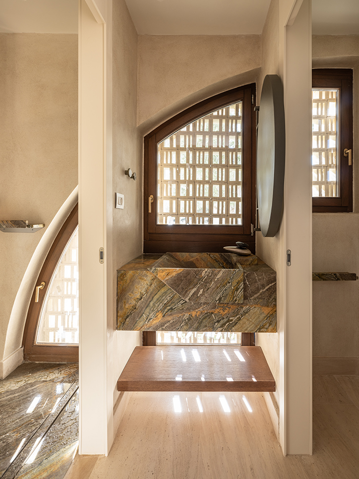 북측 입면은 사색적인 분위기를 지니며, 총안구를 연상시키는 작은 개구부와 베네치아 방어 건축 기법인 ‘스카르포(scarpo)’를 참조한 경사진 벽으로 구성되었다. 남측의 주요 매스에는 매달린 형태의 퍼골라가 설치되어 그늘을 제공하면서도 순환 동선을 유지했다. 가벼운 구조체와 견고한 벽체의 대비가 건축과 자연 사이의 전이를 부드럽게 만들었다.