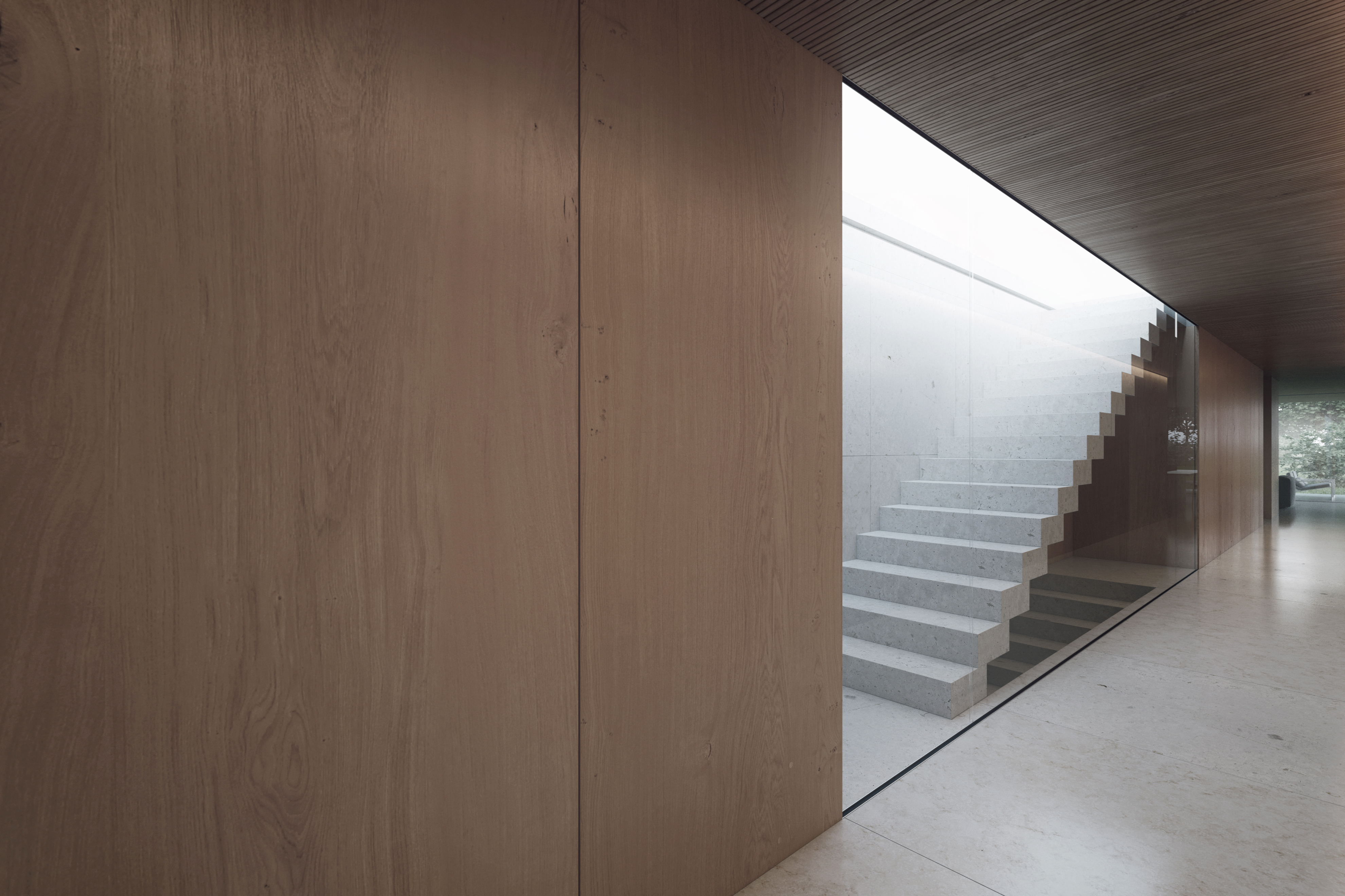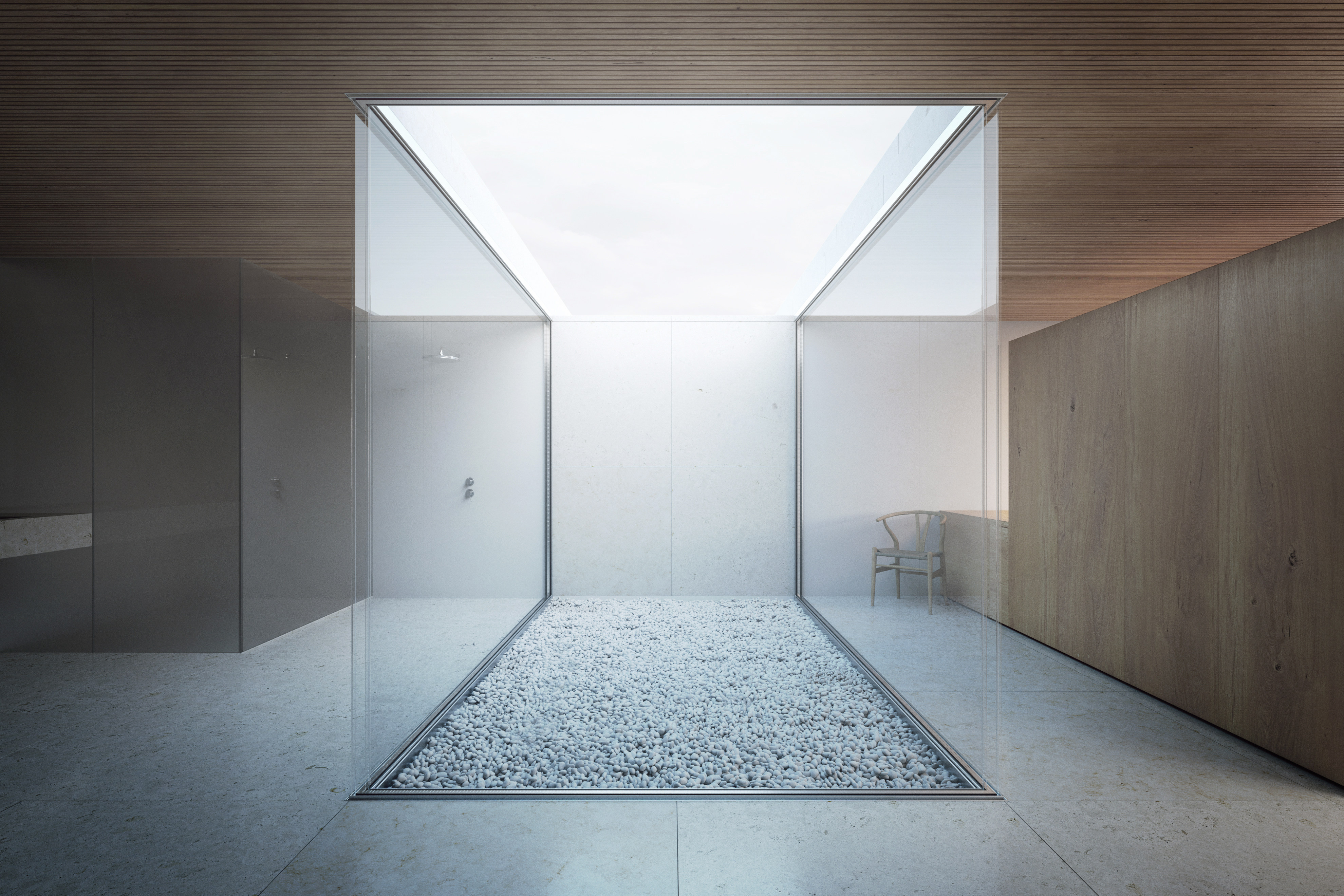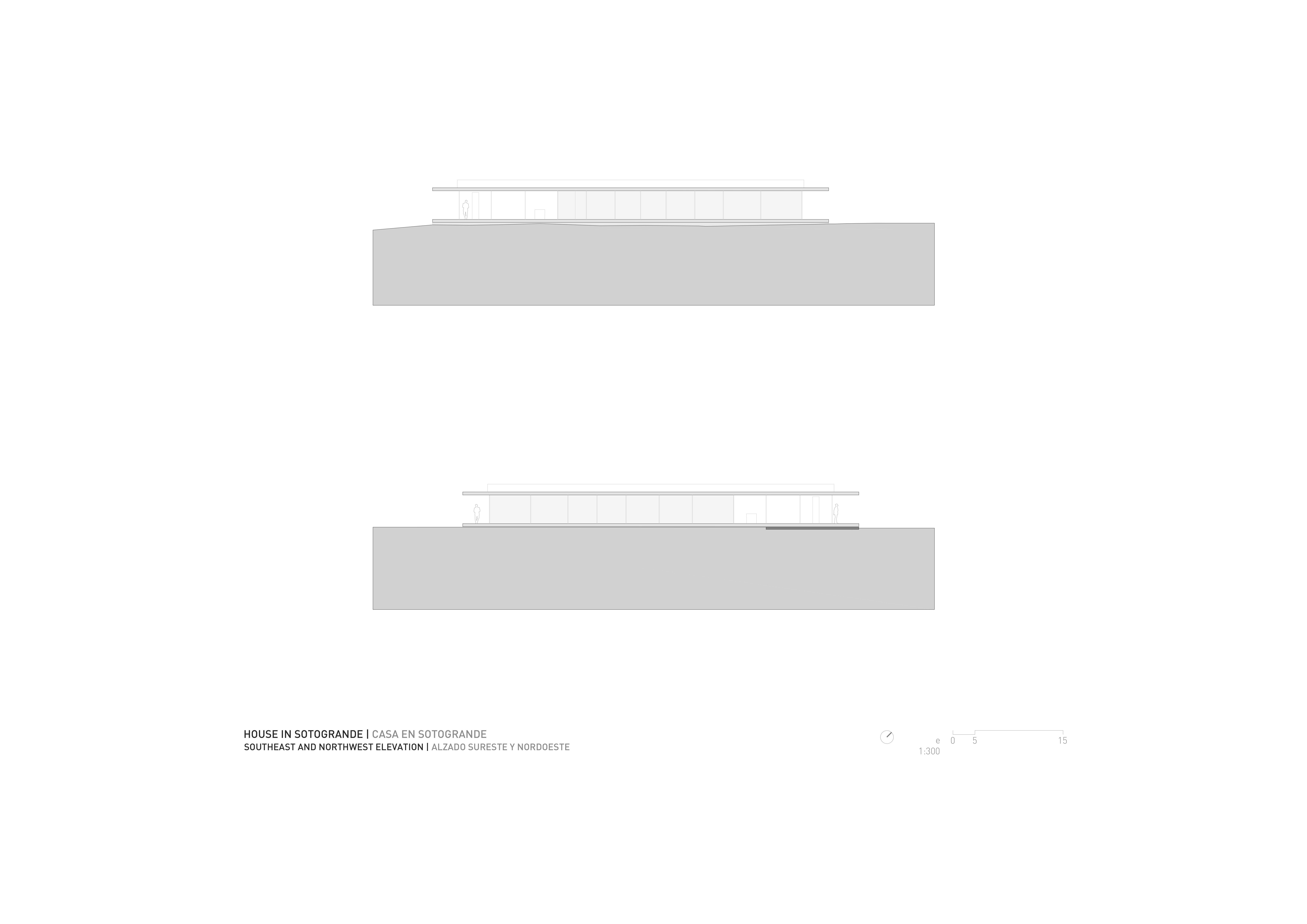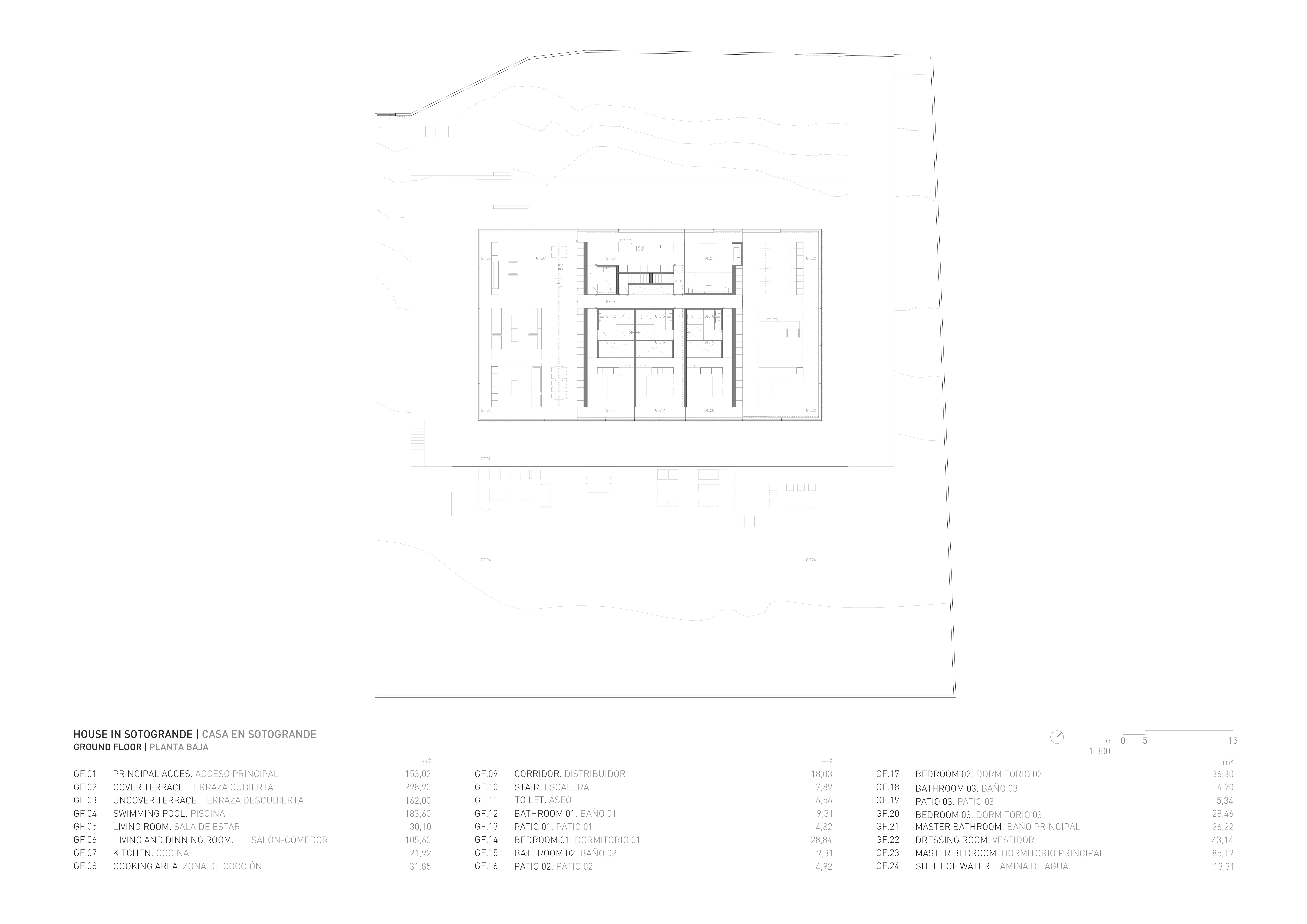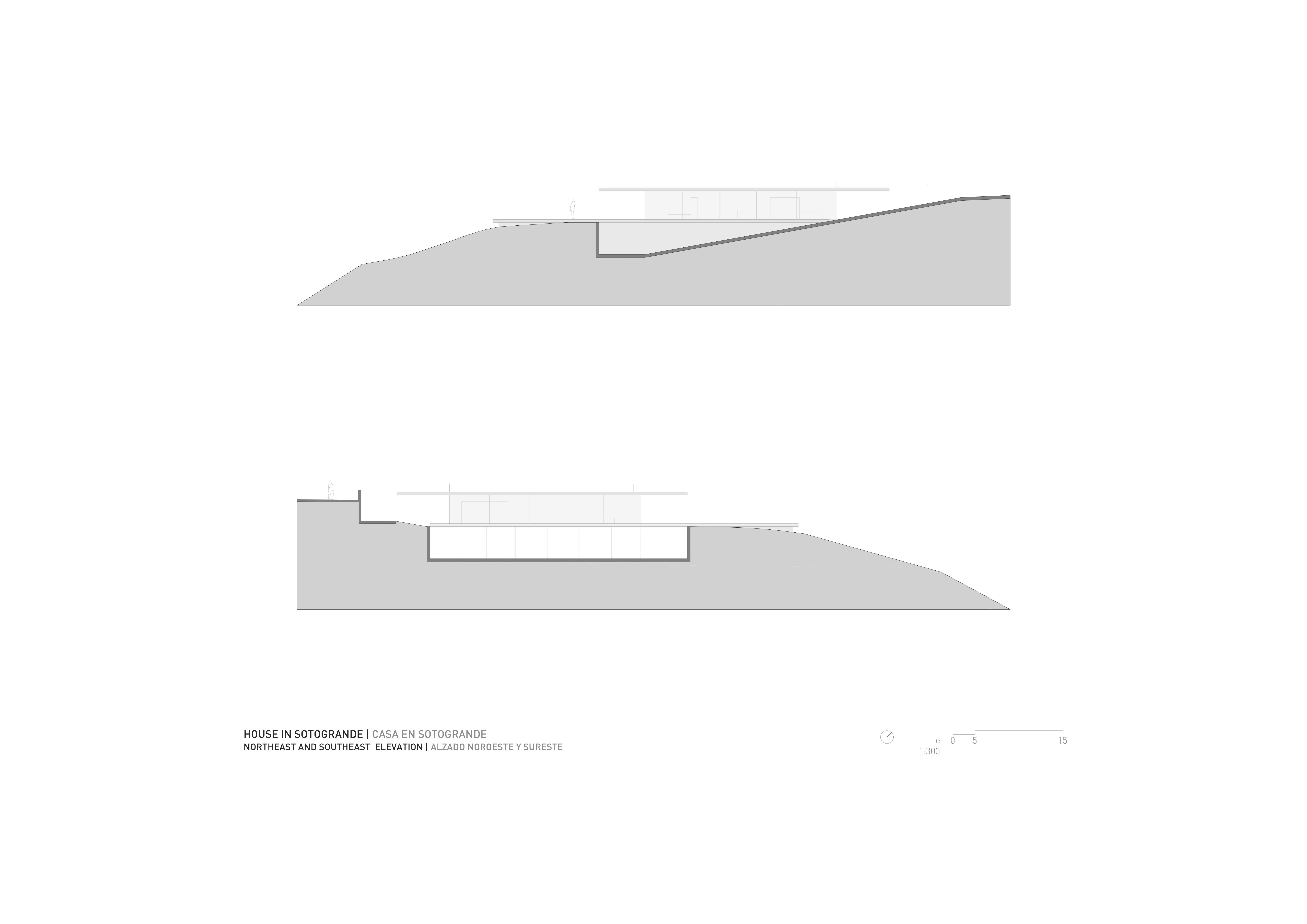 소토그란데의 골프장 앞에 자리한 이 주택은 1층 바닥면과 지붕 사이에 형성되는 그늘을 거주 공간으로 제안했다. 넓게 돌출된 캔틸레버 구조는 카디스의 강렬한 햇빛을 차단하고, 그라살레마 산맥 지역의 잦은 비로부터 건물을 보호한다. 건물 내부 깊숙한 곳에는 목재로 이루어진 공간이 자리해 프라이버시를 확보하고 아늑한 분위기를 더한다. 이렇게 건축은 네 개의 경계를 드러낸다. 땅의 평면, 그로부터 생겨난 그림자, 실내의 온도를 조절하는 유리, 그리고 마지막으로 따뜻함을 제공하는 목재이다. 구조적 긴장은 내부 공간을 중단 없이 풍경으로 열어주는 역할을 한다. 진입로는 상단 도로에서 시작되며, 이 지점에서 지붕 위 물의 흐름이 관찰되어 건축의 존재감을 흐리게 하고 자연 환경 속으로 스며들게 한다. 바닥의 천연석부터 천장의 목재까지, 주택의 모든 재료는 따뜻한 톤으로 통일되어 있다. 지붕과 1층 평면은 서로 어긋나게 배치되어 덮인 진입부와 골프장을 향한 인피니티 풀을 형성한다. 궁극적으로 이 주택은 환경에 미치는 영향을 최소화하면서, 소토그란데의 ‘거주 가능한 그늘’을 경험하게 하는 것을 목표로 한다.