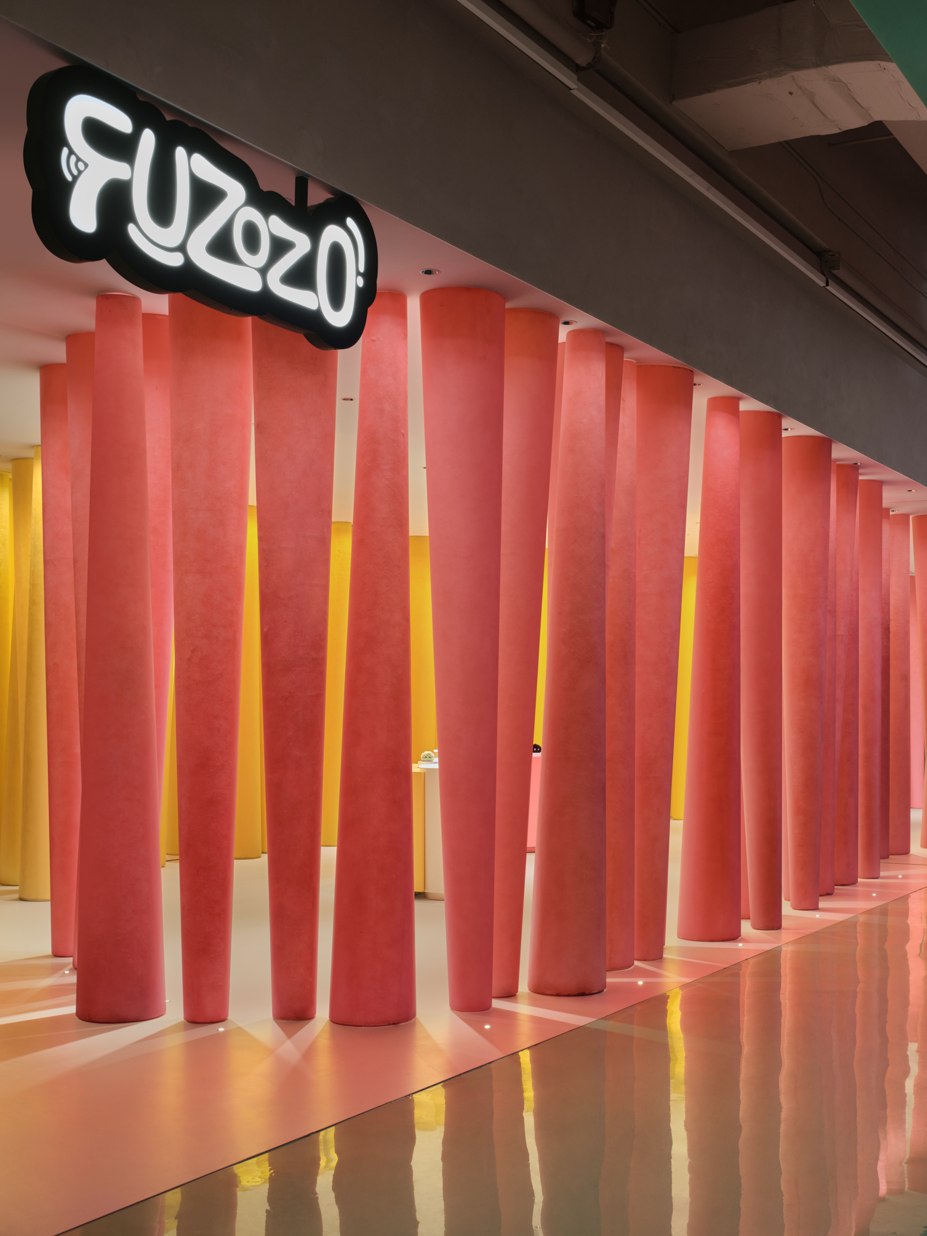 디자인의 출발점은 ‘어떻게 하면 지나가는 고객이 머물고 탐험하고 싶게 만들 것인가’였다. 이에 텐스 아틀리에는 공간의 주제를 ‘숲’으로 정했다. 단순한 장식이 아닌, 상상력을 자극하는 구체적 장면으로서의 숲을 구현함으로써, 공간 자체가 ‘외계에서 온 신생 생명체, FUZOZO’의 서식지가 되도록 구상했다. 매장은 단순히 제품을 진열하는 장소가 아니라 성장과 거주의 서사적 공간으로 설정되었다.