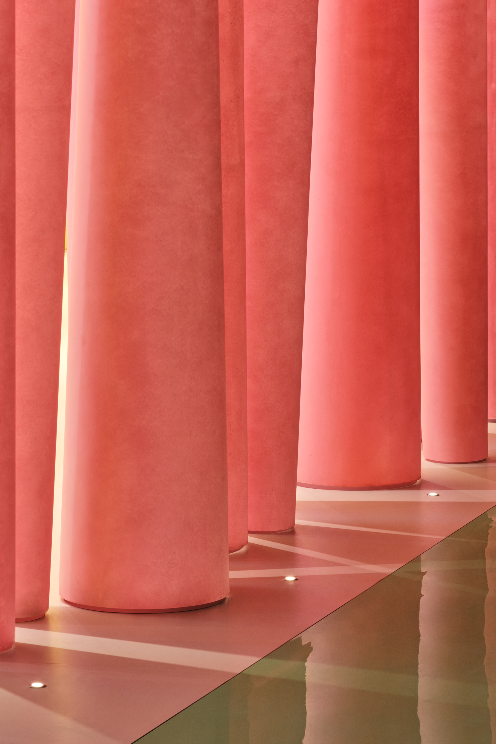 설계는 모듈형 시스템을 기반으로 했다. 각각의 모듈은 상부 직경 180mm, 하부 직경 360mm의 직각 경사 원뿔대 형태로, 상하 반전과 회전 배열을 통해 풍부한 입면 리듬을 형성했다. 관람자의 시점에서 볼 때, 공간은 유기적이면서도 역동적인 층위를 드러낸다.